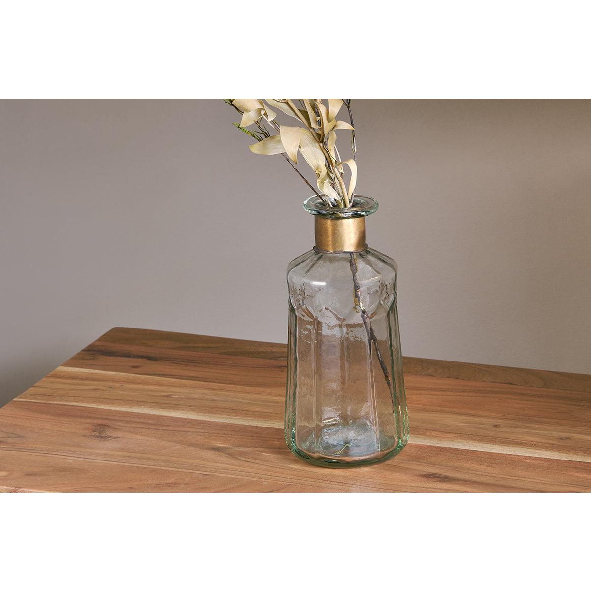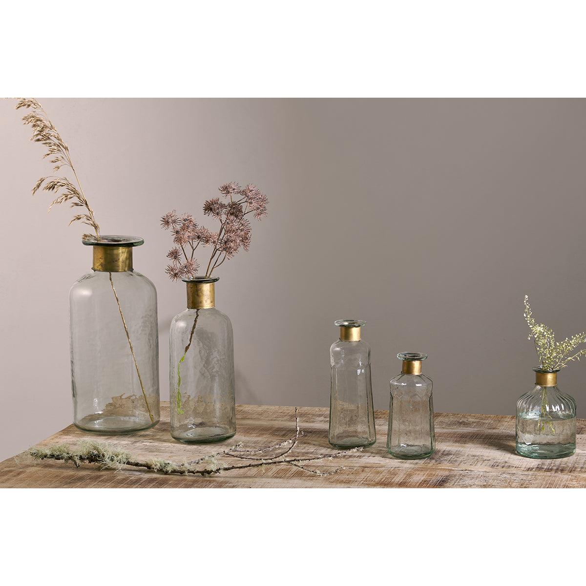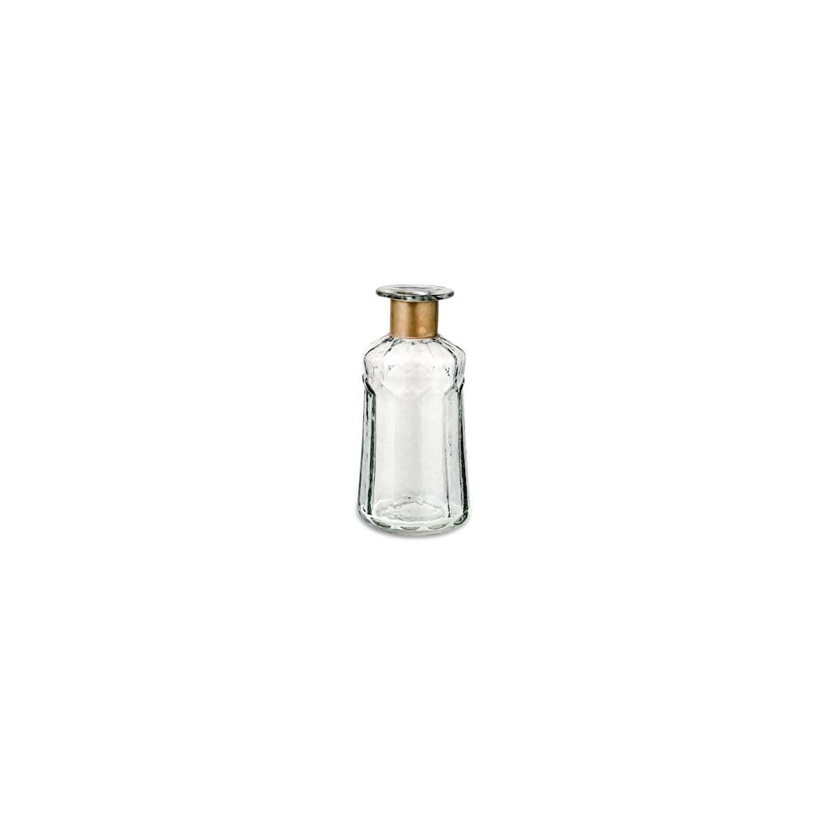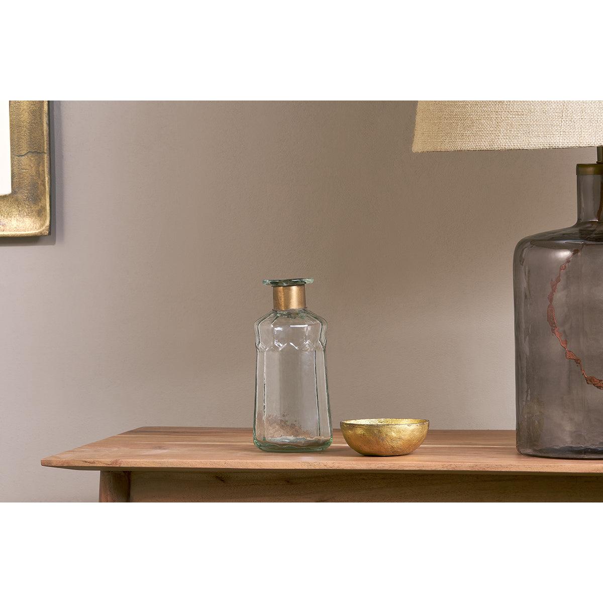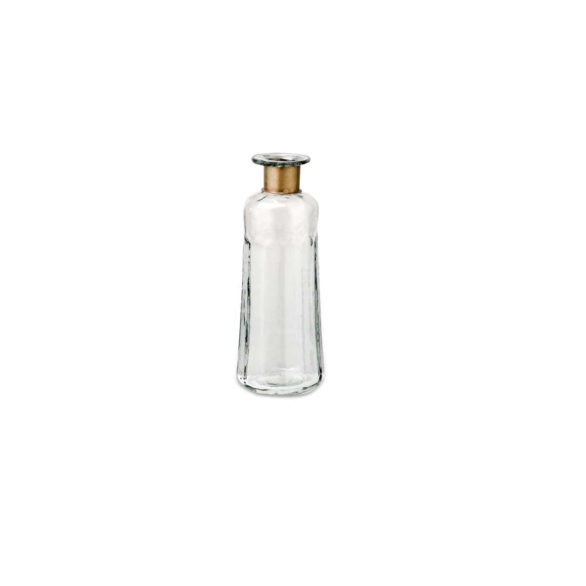 Our Chara bottles are full of sophisticated rustic charm; these artisan made pieces involve hammering the glass with traditional tools providing a subtle textured affect. The glass is skilfully blown through the brass ring creating this elegant shape. Solder marks are often evident on the brass as a result of this complex handmade process.