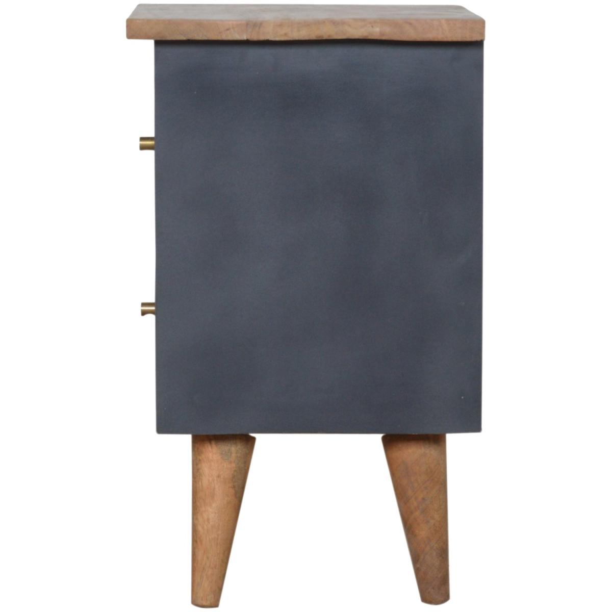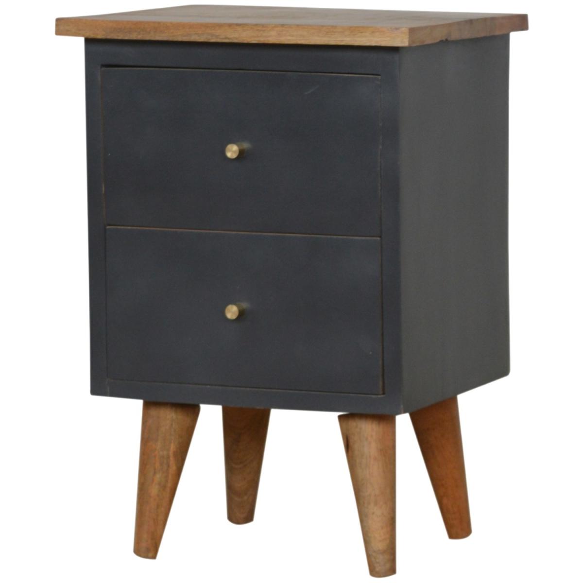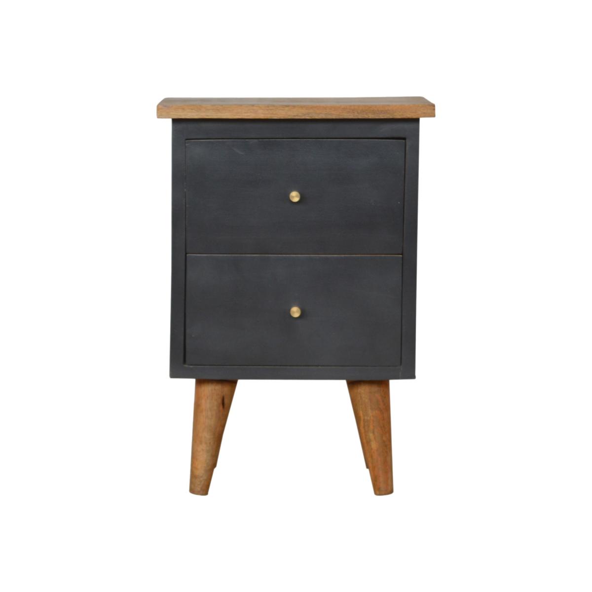 This bedside table has been constructed from 100 solid mango wood and finished with an oak-ish finish top and legs. The body of the bedside has been finished in hand-painted charcoal black paint and features shiny knobs on the 2 drawers for easy access. This bedside is bound to spice up your bedroom.