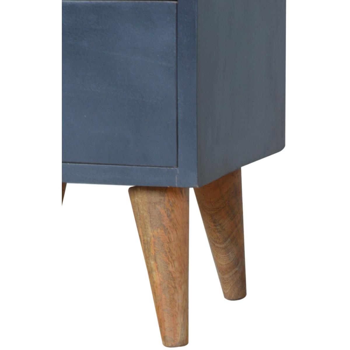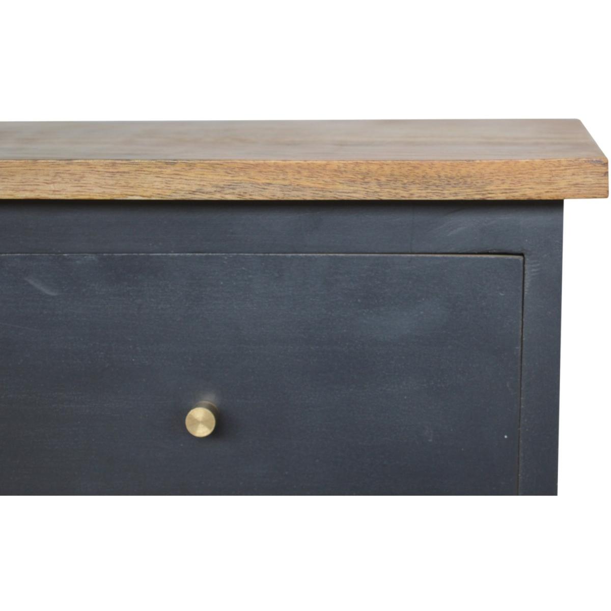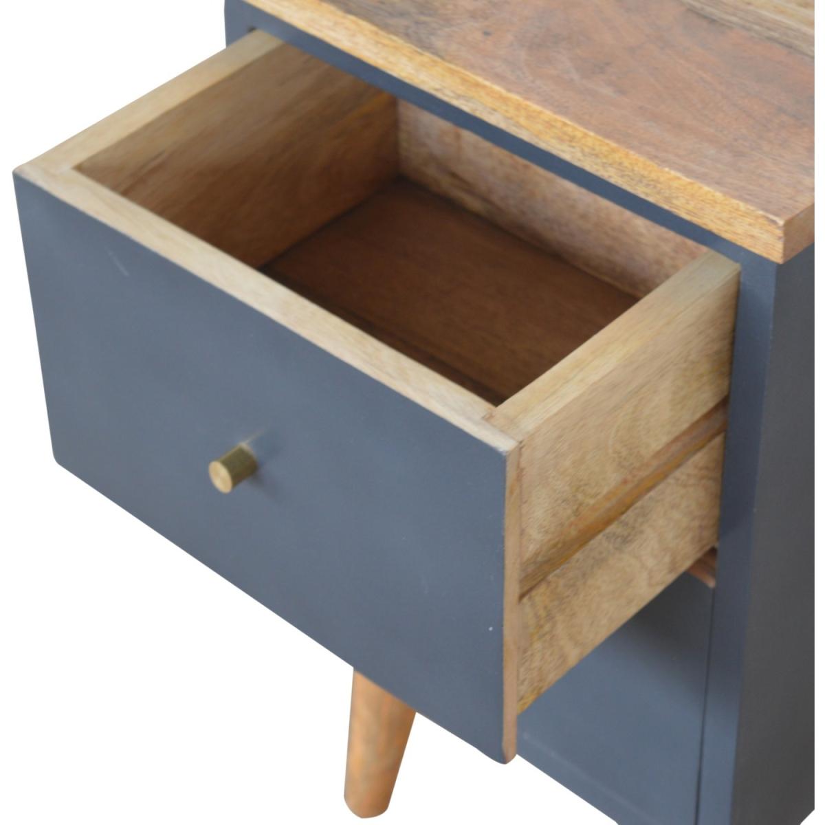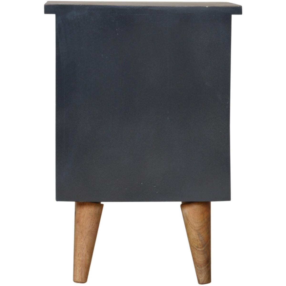 This bedside table has been constructed from 100 solid mango wood and finished with an oak-ish finish top and legs. The body of the bedside has been finished in hand-painted charcoal black paint and features shiny knobs on the 2 drawers for easy access. This bedside is bound to spice up your bedroom.