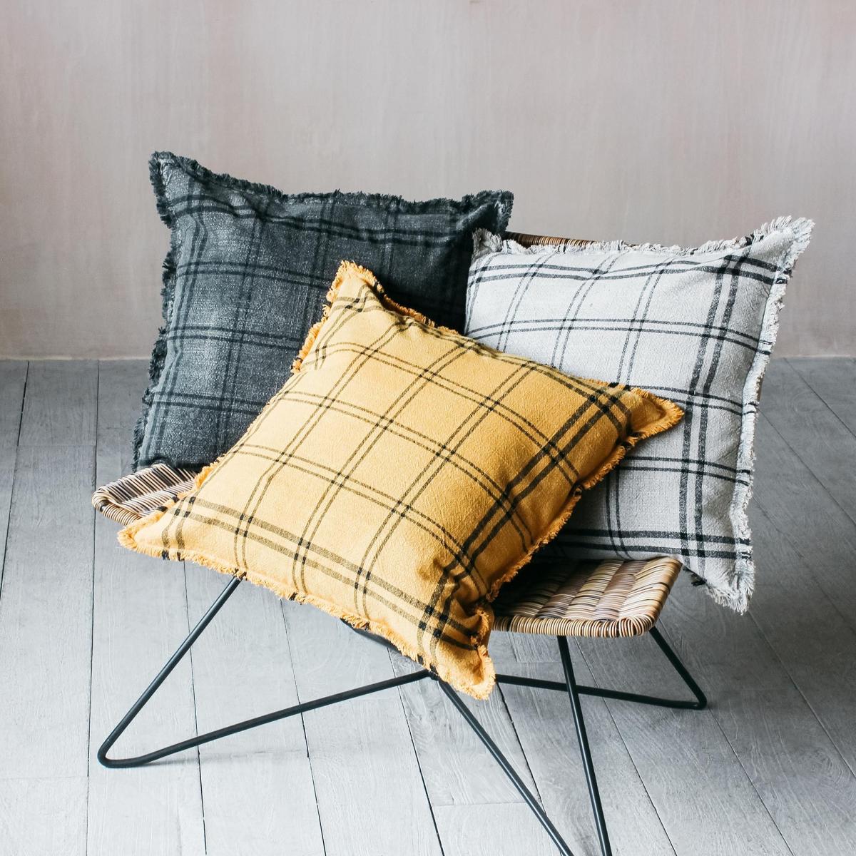 Settle into the comfiest sofa lined with plump cushions printed with a wide gingham check and finished with a tufted edge. Grey (MEV1018).Mustard (MEV1019).Charcoal (MEV1020).H50 x W50cm. Made of cotton and polyester. Cover is machine washable at 40 degrees. Zip closure.