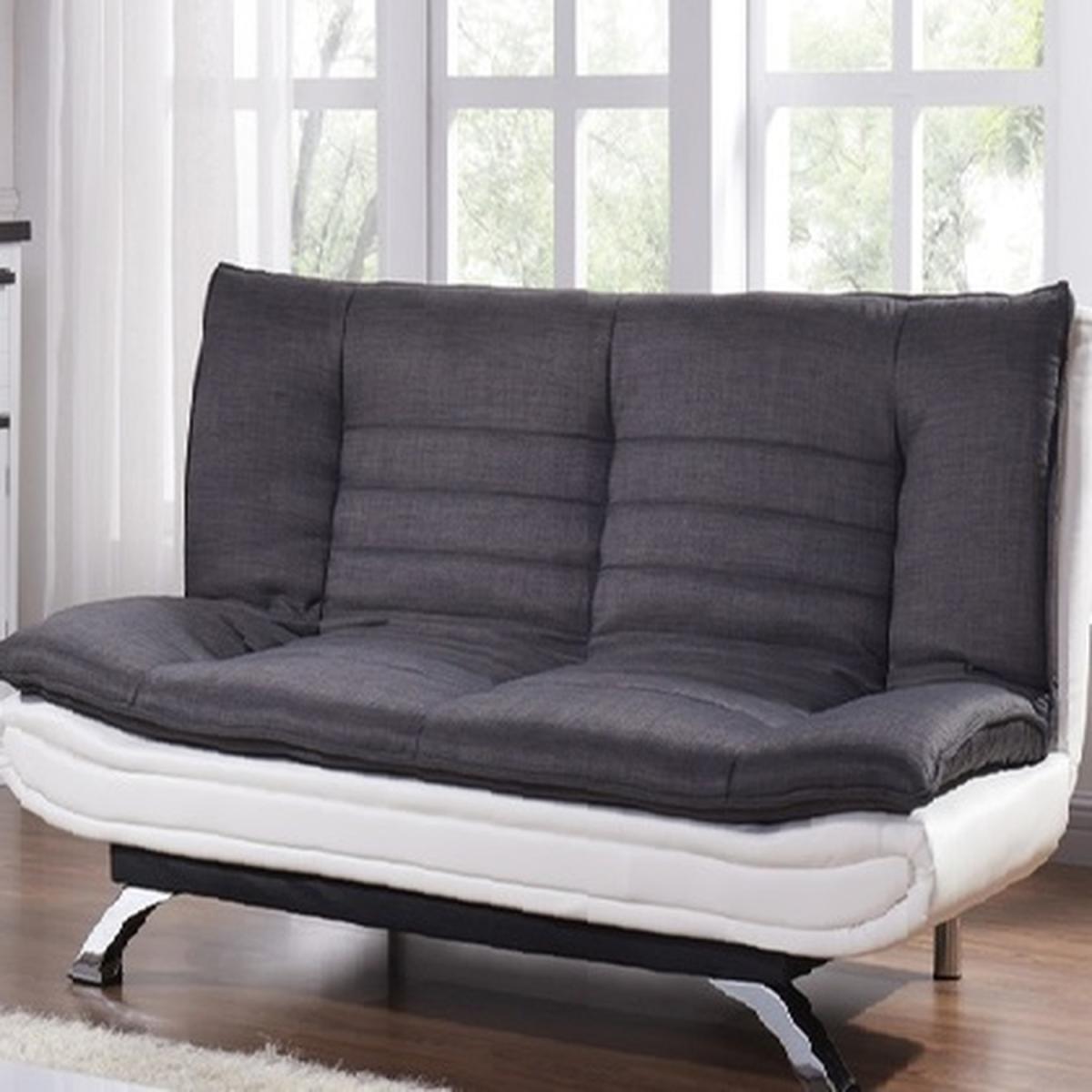 This stylishly modern sofa bed with an elegant curved design would make a sophisticated addition to the contemporary home. Beautifully upholstered with a charcoal grey fabric top and a white faux leather base, this sofa bed effortlessly converts from a comfortable 3 seater sofa into an ideal bed for two, perfect for when you have unexpected guests. Finished with polished chrome legs that are curved at the front and supporting legs at the back. This versatile fold down sofa bed is made with a simple click-clack mechanism allowing it to transform into a comfortable bed in seconds. Simply pull the backrest forward until you hear the click and then lay it down into a flatbed. Convert into a sofa again by raising the backrest until it clicks into place. This sofa has the option to be placed in either a sitting, reclining or sleeping position.