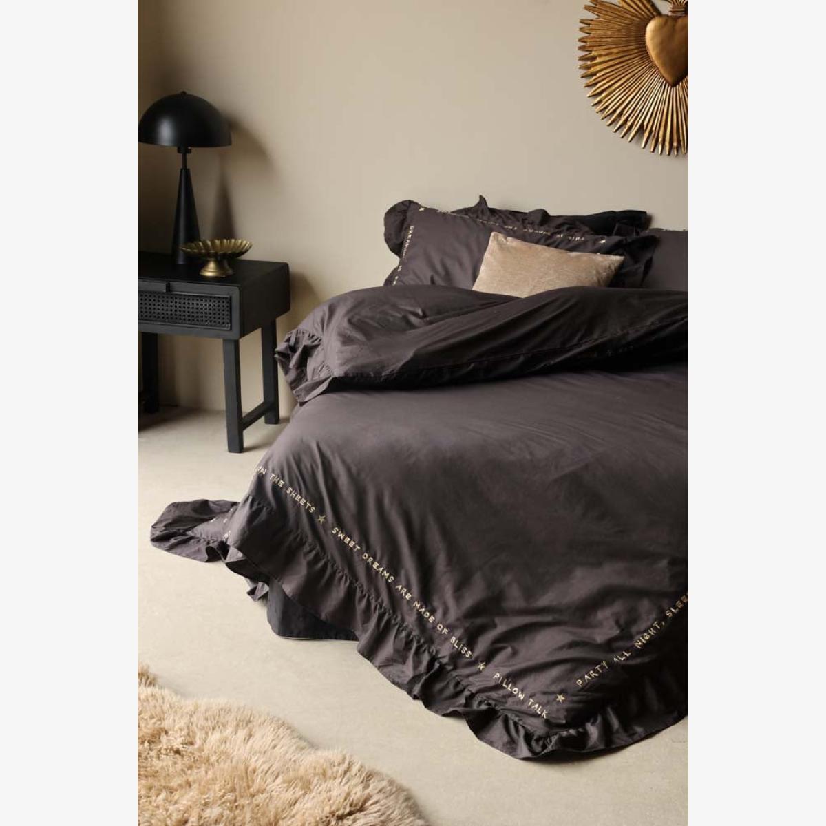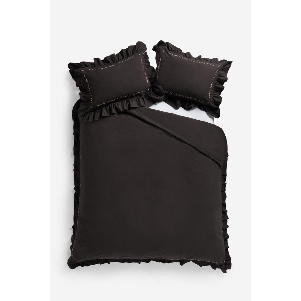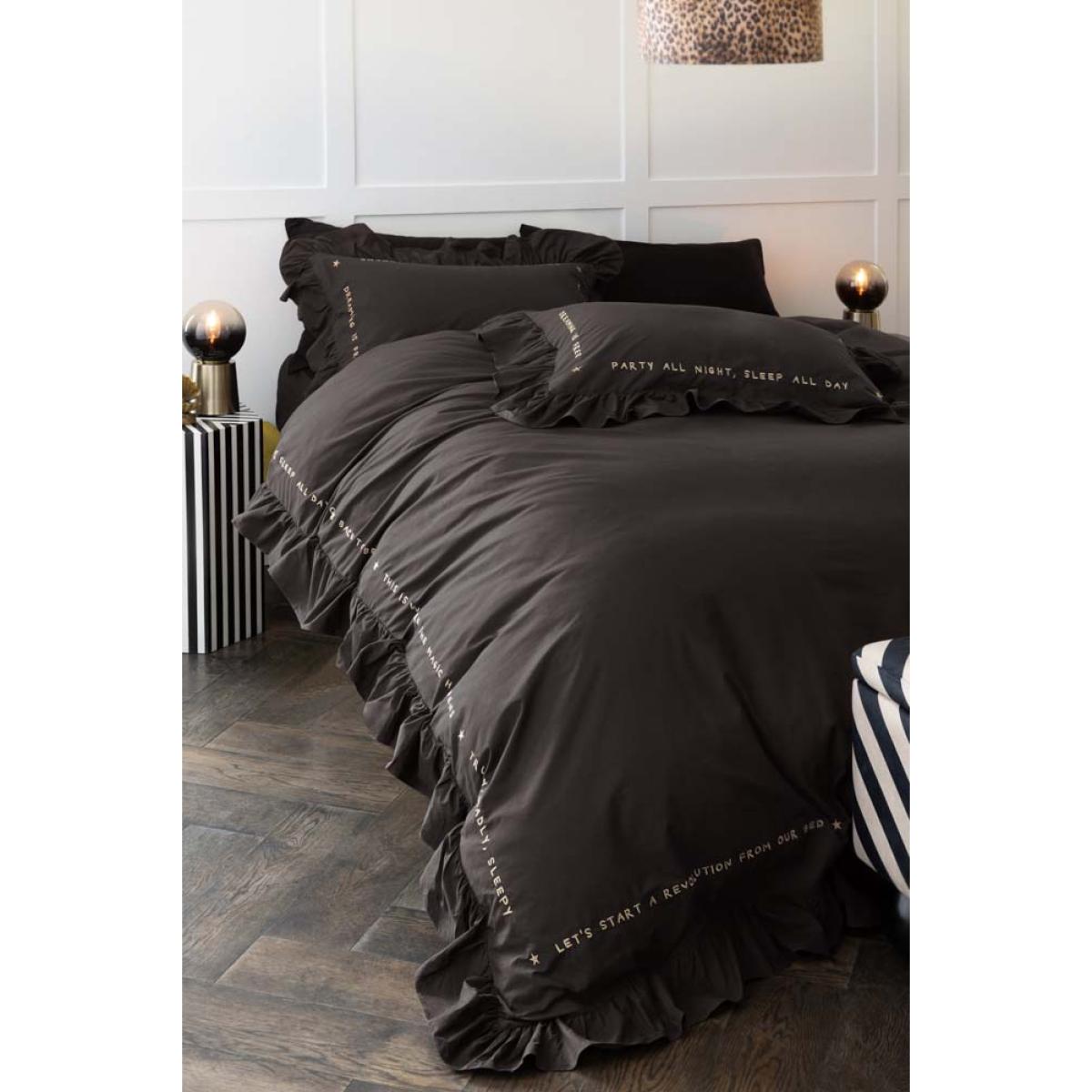 <!--td --> If you’re ready to shake things up in the bedroom department, we have just the thing. Black bed linen can create a dramatic and sophisticated look in the boudoir, especially when paired with lighter-coloured pillows or throws to create contrast and add accents of colour. If you’re feeling grown up, go for white, cream, grey, or pastel hues. If your inner Cindy Lauper (circa 1980) is in charge, then anything goes – go crazy with that colour palette! The 200-thread count cotton lends a quality feel that’s a pleasure to sleep in, while the oversized frilled pillowcases add a feeling of abundance and luxury. What we love most about this bedding, however, are the pithy little statements (‘Dreaming is free’ or, more saucily, ‘This is where the magic happens.’) They add a real sense of fun to this cotton bed linen set that can be echoed in the styling of the rest of the room - introduce metallic elements such as gold, silver, or bronze in the form of lamps or photo frames, or think prints with geometric patterns, florals, or subtle stripes. Finish with a velvet throw to add the ultimate in boudoir chic and you have a space with unrivalled va-va-voom. Now all you need to do is lie back and enjoy... - Charcoal Grey Mega Frill Duvet Cover and Pillowcase Set- Available in single, double, king and super king - Available in black and white Plain on reverse 200-thread count - Gold embroidered sleep slogans - Oversize frill-edge oxford pillowcases