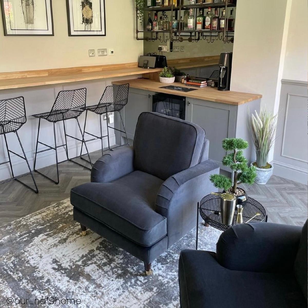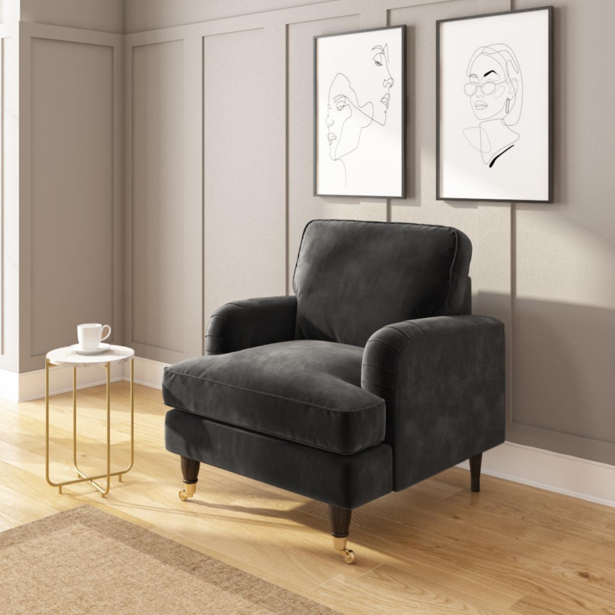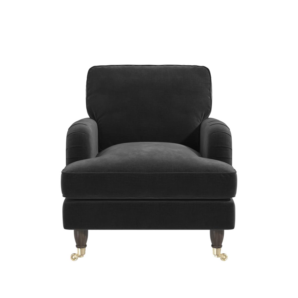 Dimensions H85 x W78 x D86 cm Discover maximum comfort and minimum maintenance with this gorgeous armchair. This plush Payton armchair offers traditional styling with a modern twist thanks to its dark wooden legs with gold accent front castors and classic ruched saddle arms. Beautifully tailored and upholstered in Charcoal grey velvet making it the perfect statement piece. Adding this trend-setting piece to your home is easy. There's minimum assembly; it's just a case of fixing the legs into position. Features. Plush velvet armchair in charcoal grey Ideal for your living room snug or study. Gold castors and dark wooden legs complete the look. Foam filled cushions create optimal comfort. Find the matching items just search Payton Removable cushion covers – use a damp cloth to clean Minimum assembly – just attach the legs..