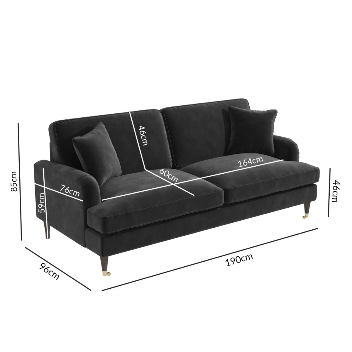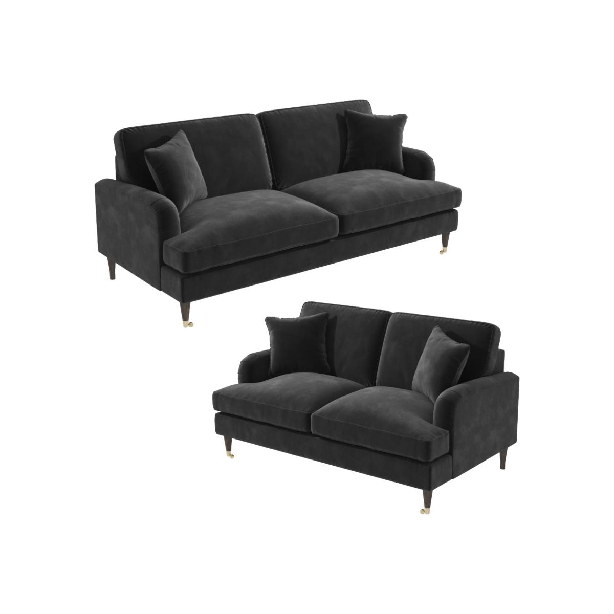 This bundle includes : Payton Charcoal Grey Velvet 3 Seater Sofa1 x Payton Charcoal Grey Velvet 2 Seater Sofa Features we love Comes with 3 seater sofa and 2 seater sofa Beautifully upholstered in an irresistibly soft-to-touch velvet fabric Saddle arms, tailored piping and deep, plump, seating gives it a modern silhouette Accompanied by two matching throw cushions for added style and comfort Stylish dark wood legs with gold accent front castors for easy placement Both the seat and back cushions are filled with comfortable and spongey foam Cushion covers are removeable. To clean, we recommend using a damp cloth All about me Discover maximum comfort and minimum maintenance with these gorgeous sofas. These charcoal grey Payton three-seater + two seater sofas offer traditional styling with a modern twist thanks to its dark wooden legs with gold accent front castors and classic ruched saddle arms. Beautifully tailored and upholstered in grey velvet making it the perfect statement piece. Adding this trend-setting piece to your home is easy. There's minimum assembly; it's just a case of fixing the legs into position. Need to know 3 seater Overall dimensions: H85 x W190 x D96 cm 3 seater Seating dimensions:W164 x D60 cm 3 seater Packed dimensions: No. of Boxes 1 - Weight 54kg – H61 x W192 x D98 cm 2 seater Overall dimensions:H85 x W150 x D96 cm 2 seater Seating dimensions:W124 x D60 cm 2 seater Packed dimensions: No. of Boxes 1 - Weight 50kg – H61 x W152 x D98 cm Colour: Charcoal Grey velvet Finish: Velvet upholstery and wooden legs Material: Velvet (100% polyester), wooden frame and legs and metal castors Filling: Foam Assembly required: Yes