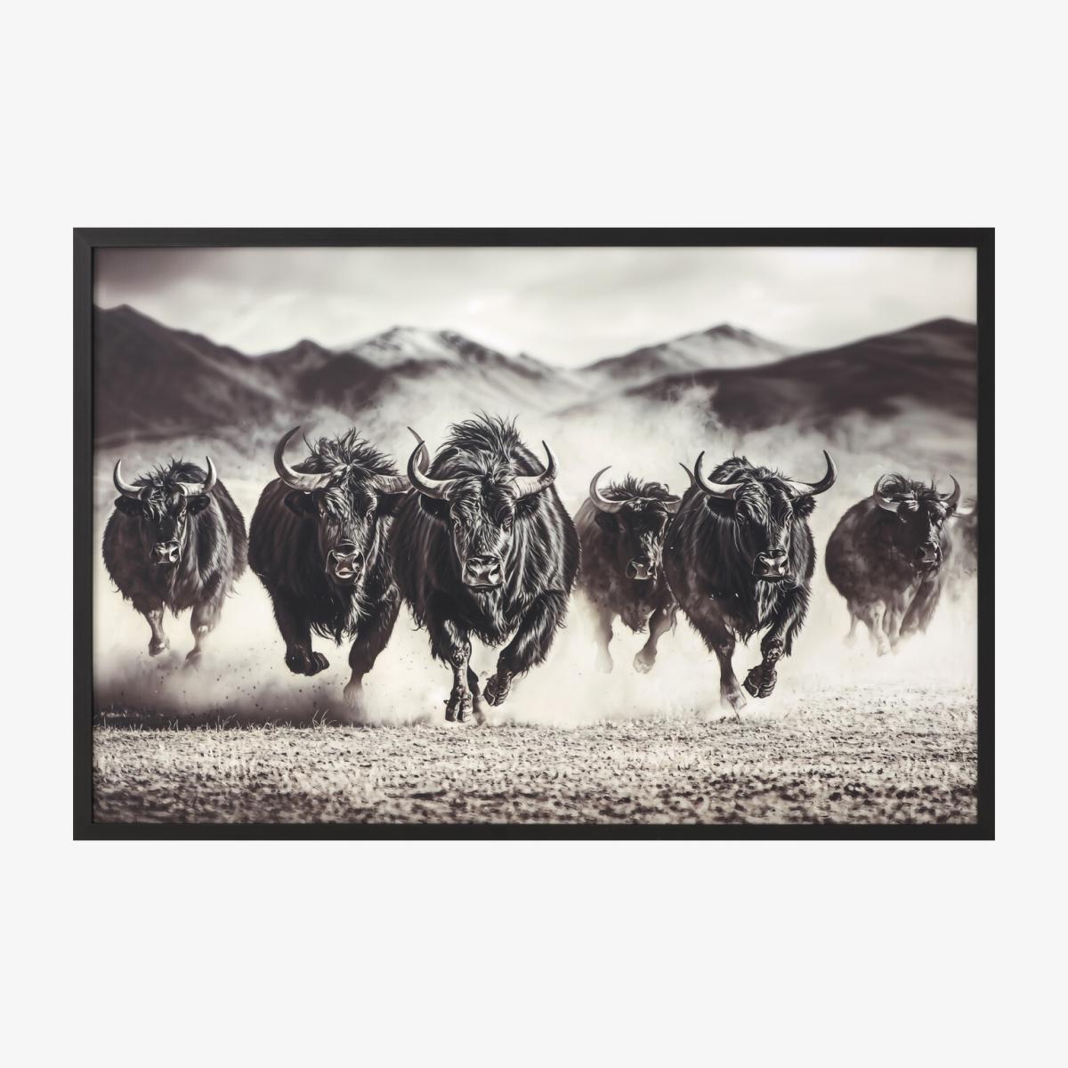 Bring the wild into your home with this Charging Bisons Framed Gloss Art. This striking piece captures the raw power and motion of bison in full charge, set against a dramatic landscape that adds depth and energy to any room. Finished with a sleek gloss coating, it pops with rich detail and vibrant contrast. For added convenience, it comes with hooks for easy hanging.