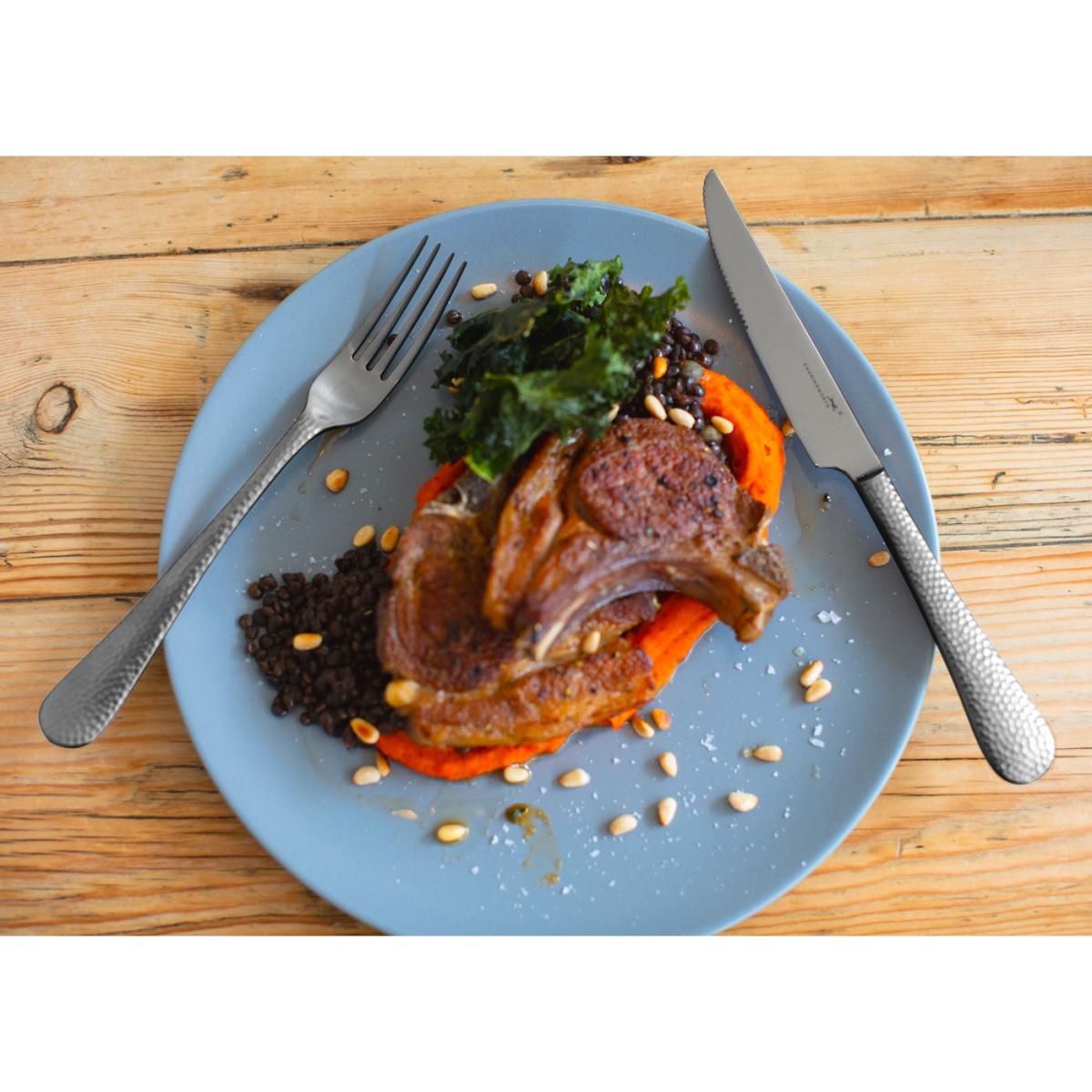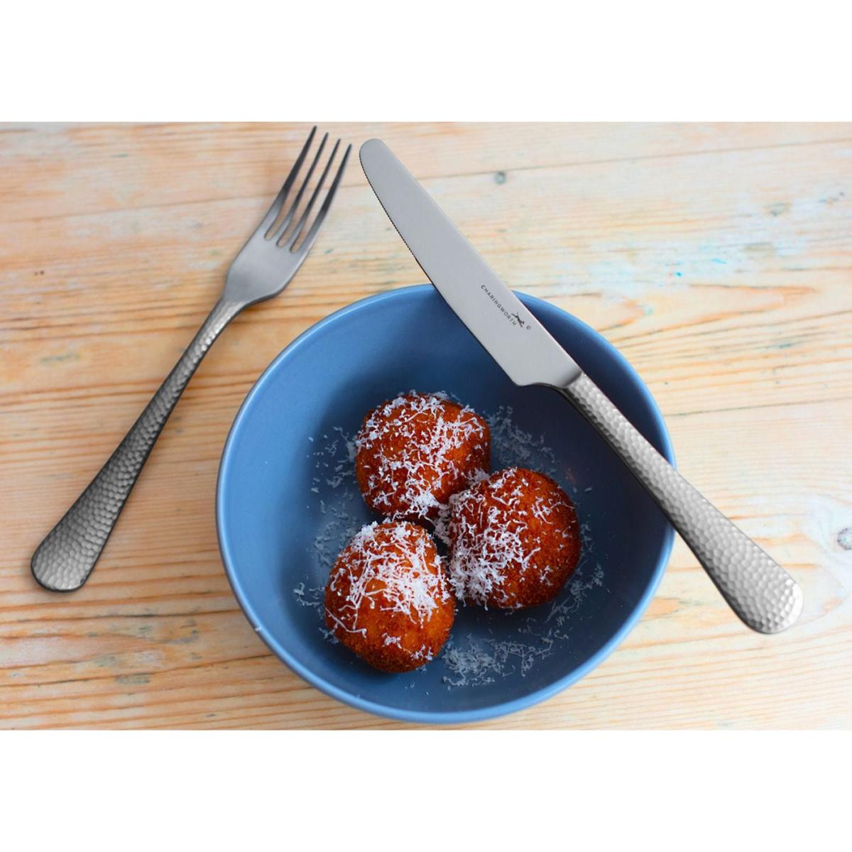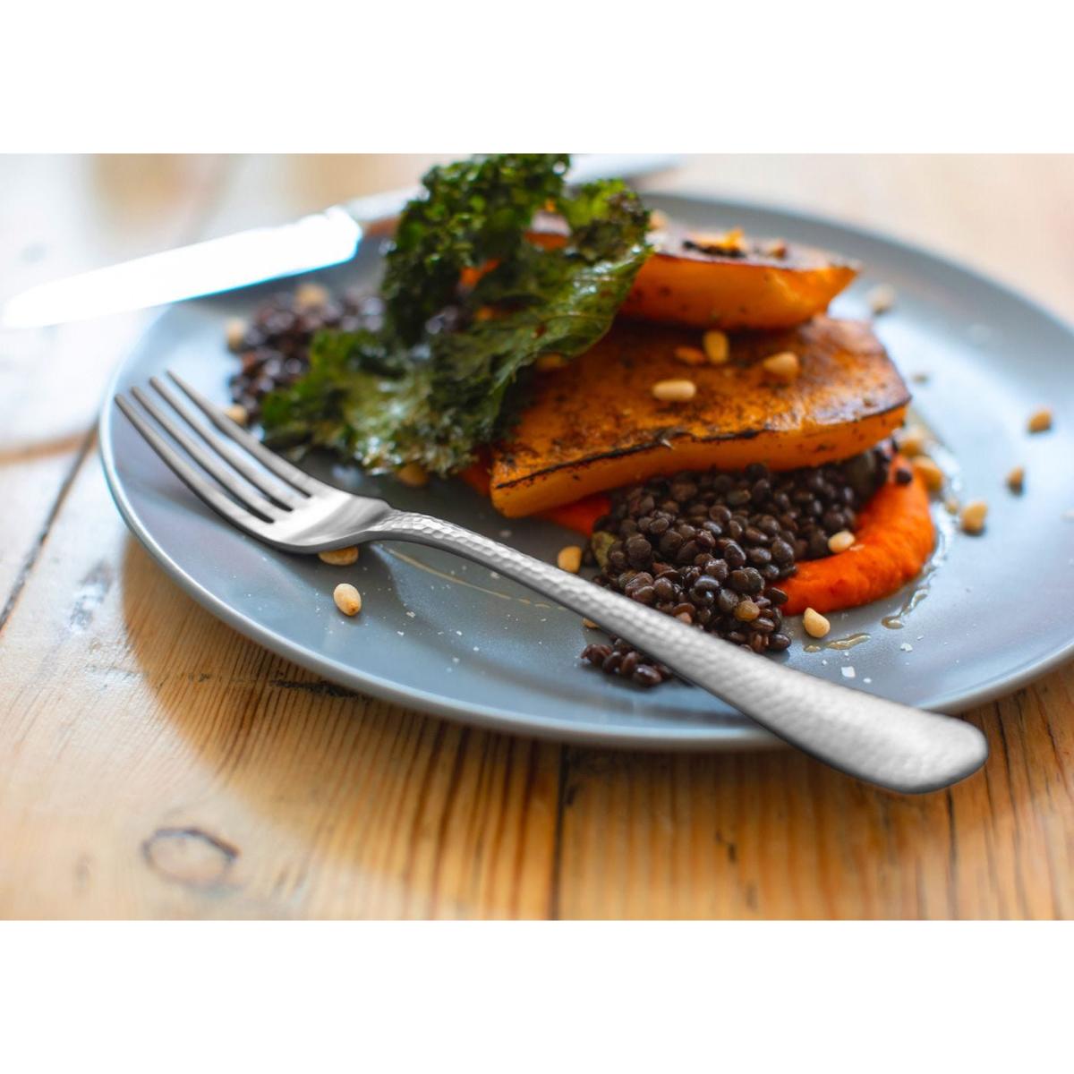 Each of the 24 pieces in the Planish Satin Cutlery Set was designed by Charingworth at its studio in the heart of the Cotswolds. The dimpled design takes inspiration from the process used to mould and shape metal, and as such the cutlery is crafted using industry-standard stainless steel. Its well-balanced, comfortable grip means each piece of cutlery sits nicely in the hand