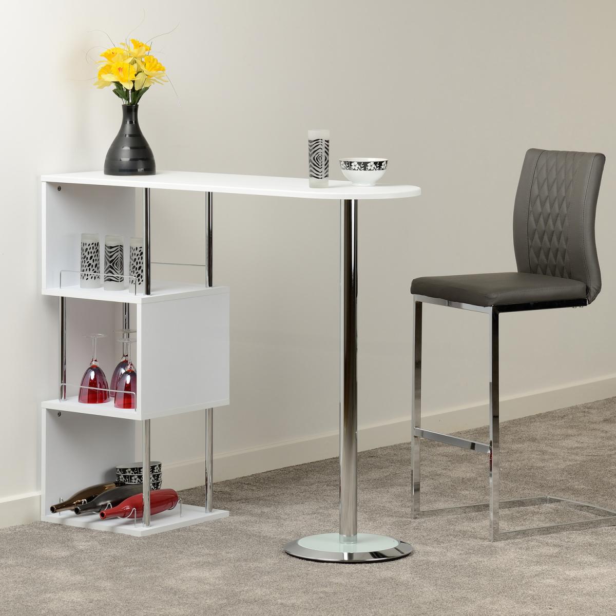 I love this bar table for its sleek, contemporary design and versatile white finish, making it a great addition to both modern and minimalist interiors. It works particularly well in compact spaces like small kitchens, home bars, or open-plan living areas where space is at a premium. For styling, consider pairing it with colourful bar stools or adding a simple tray with some glassware and a statement bottle to create an inviting drinks station. Practical tips include using the shelf underneath for storing glassware or accessories, which helps keep the tabletop clutter-free. It’s an adaptable piece that can be dressed up or down depending on your decor, making it both functional and stylish.
