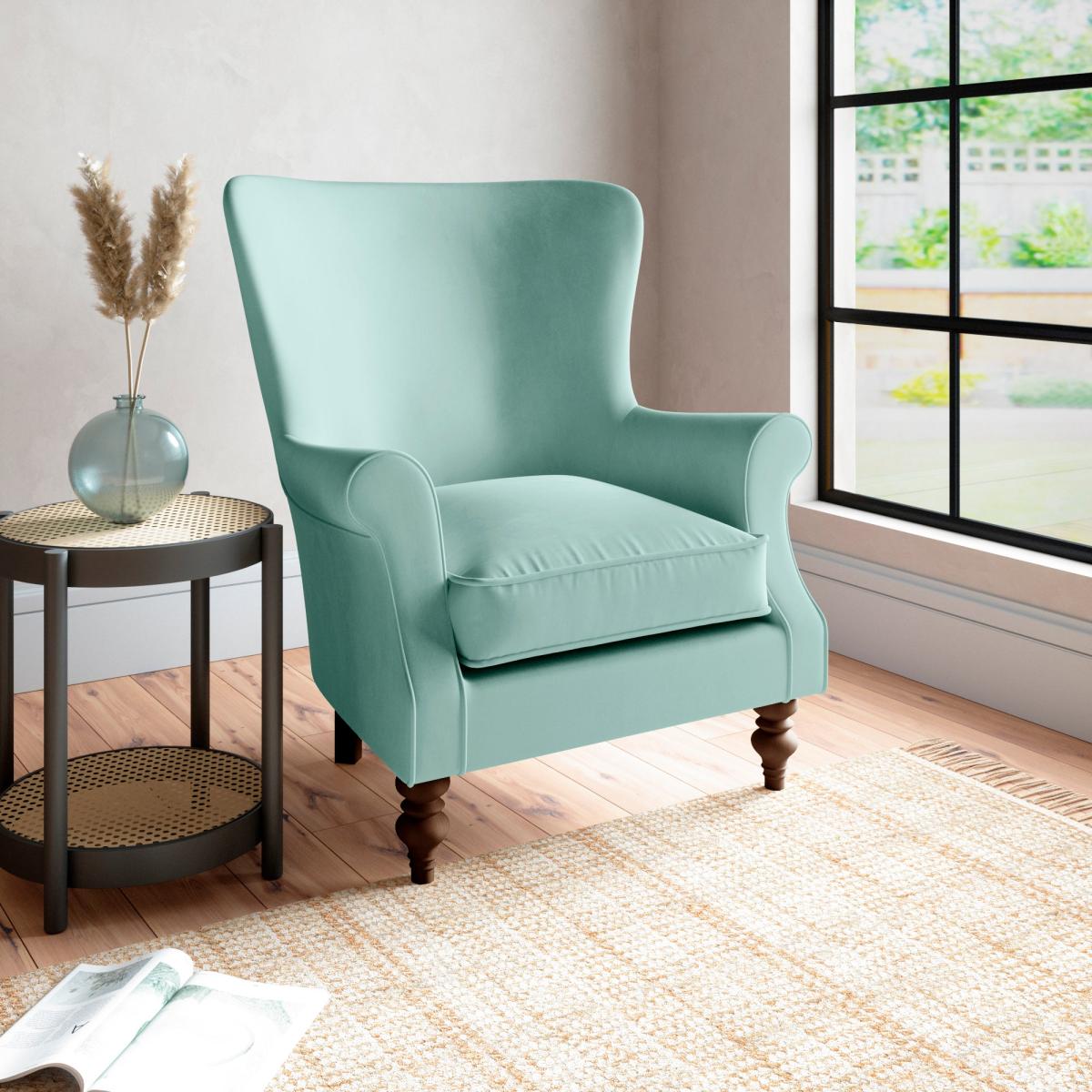 Upholstered in a soft touch velvet fabric, the classic Charlbury armchair is designed to offer luxurious comfort with its Qualofill Blue filled seats. Offering an elegant design, this timeless armchair features a wingback design with scrolled arms, scalloped back, and front turned show-wood feet. The Charlbury armchair is also available in a range of different colours, fabrics and sizes and offers easy assembly; just attach the feet and you’re ready to relax. Made with recycled materials.