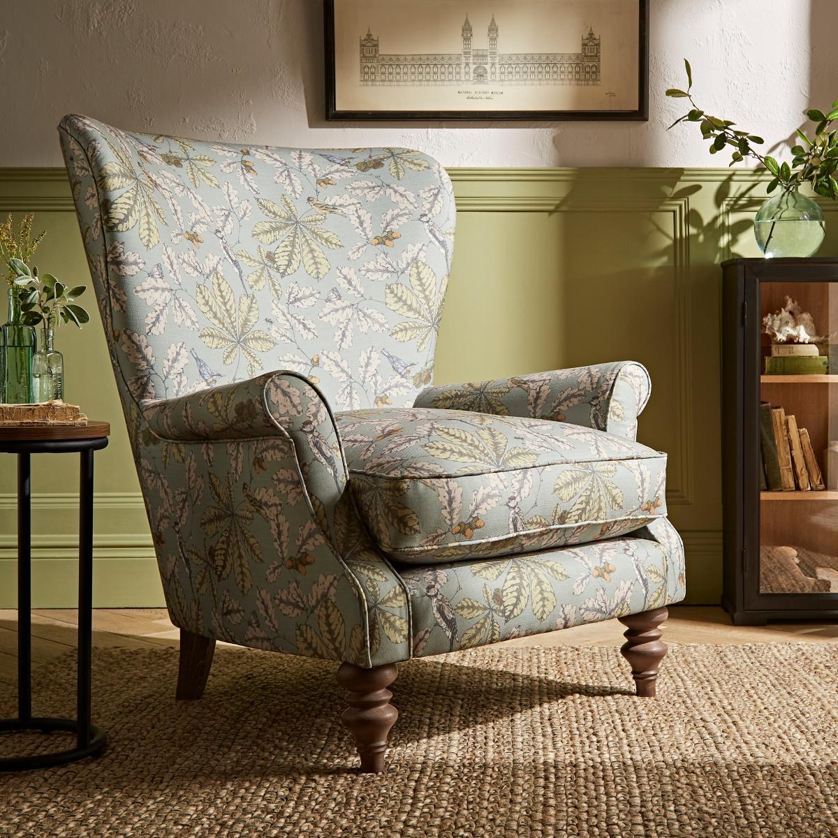 In Collaboration with the Natural History Museum. The Charlbury Wing Chair is finished in a stunning Arboretum Print, inspired by the leafy wonderlands of the UK’s woodlands during the beautiful autumn season. The timeless wingback silhouette of this armchair and elegant wood legs provide a classic look that suits any home. This armchair can be purchased with a matching footstool for a coordinated look and even greater comfort. Made from responsibly sourced timber and recycled materials, you can relax the night away in style and with good conscience. Natural History Museum x Dunelm. The Charlbury Wing Chair is part of the Woodlands collection. Autumn is a truly majestic time, whether foraging for conkers or feeling the crunch of newly fallen leaves underfoot, woodlands are a wonderful place to connect with nature. The UK’s woodlands are rich and diverse supporting an incredible array of wildlife from woodland flowers to birds and butterflies. These leafy wonderlands not only provide homes for wildlife but they are also an important tool in the fight against climate change. They are hugely effective in soaking up carbon from the atmosphere and provide a natural solution to the climate crisis. Through our collection with the Natural History Museum, we want to celebrate the UK’s incredible woodland habitats and highlight the need to protect them for future generations to enjoy. © The Trustees of the Natural History Museum, London 2022. All Rights Reserved.