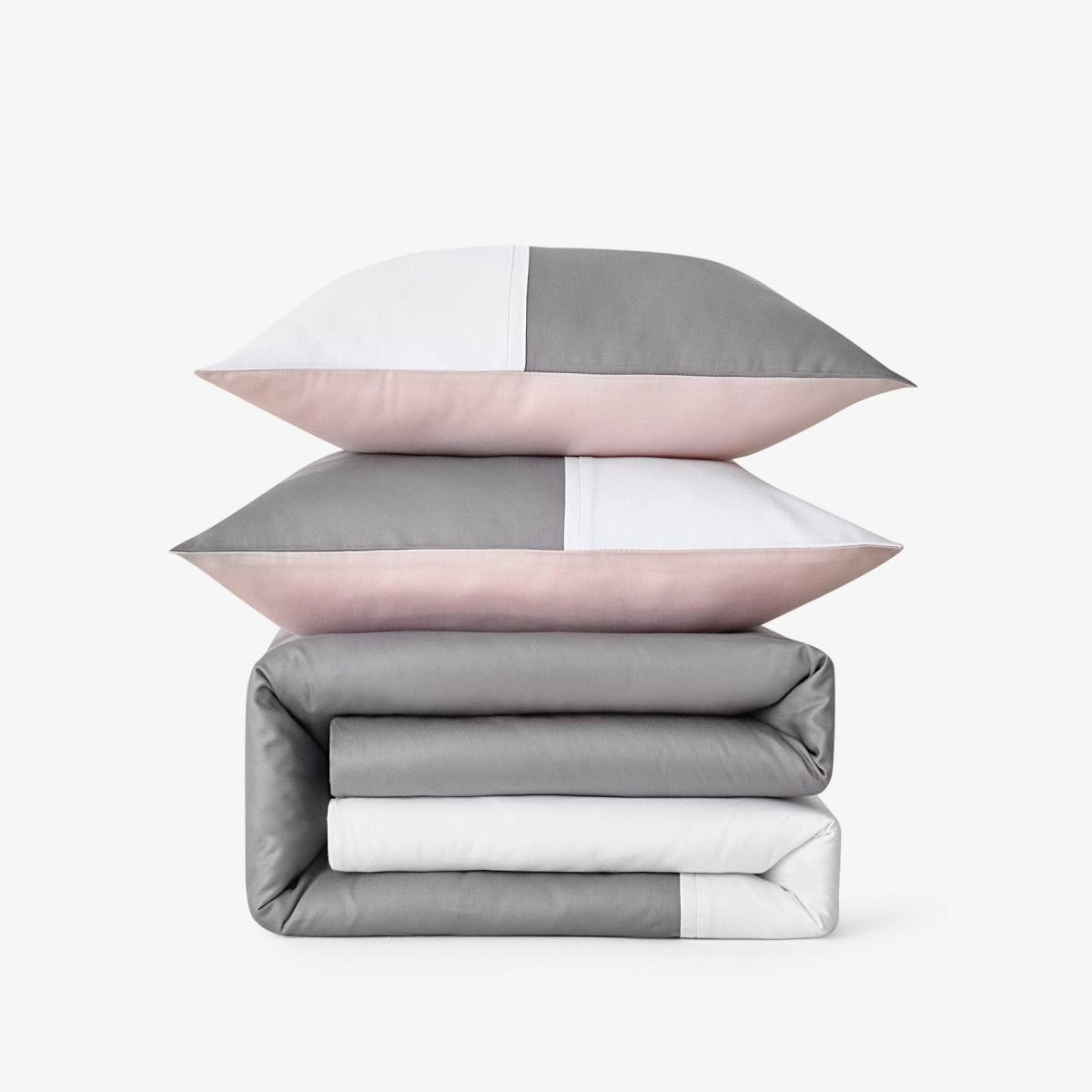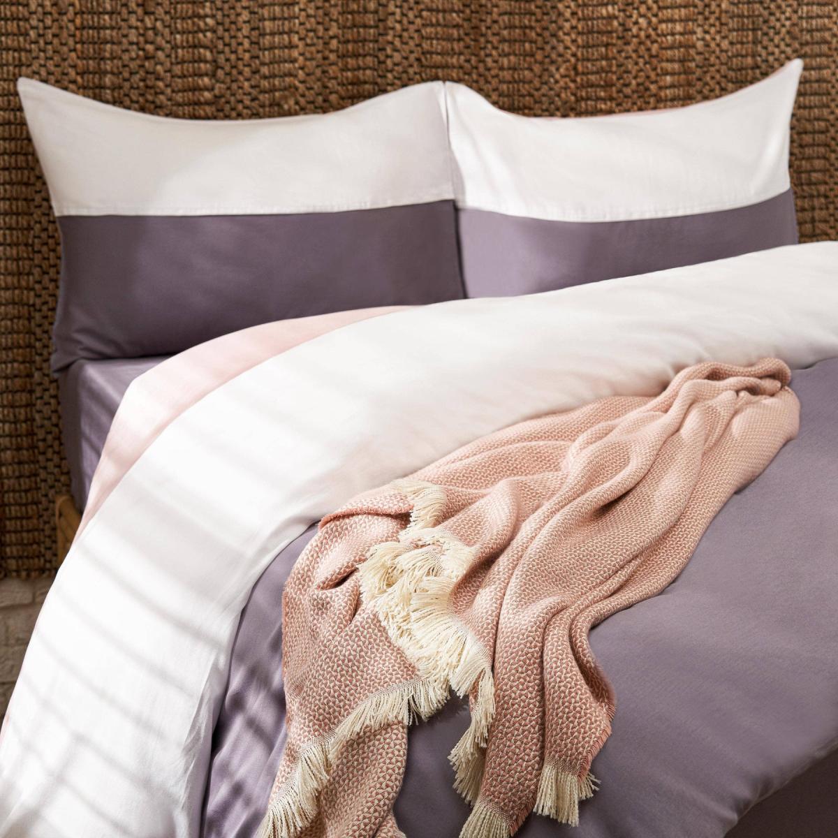 Make a bold and modern statement with our Charles cotton sateen king duvet set. Featuring a stylish colour block combination married with the feel of hotel-quality bedding, your space will feel and look refreshed. The 210-thread-count sets are crisp and cool, guaranteeing a good night's sleep. Our king-size bed set is made of 100% Turkish cotton sateen and comes complete with two pillowcases and a duvet cover. Each of the two colour block options, brown and beige or powder pink and grey, suggests a soothing take on modern hues.