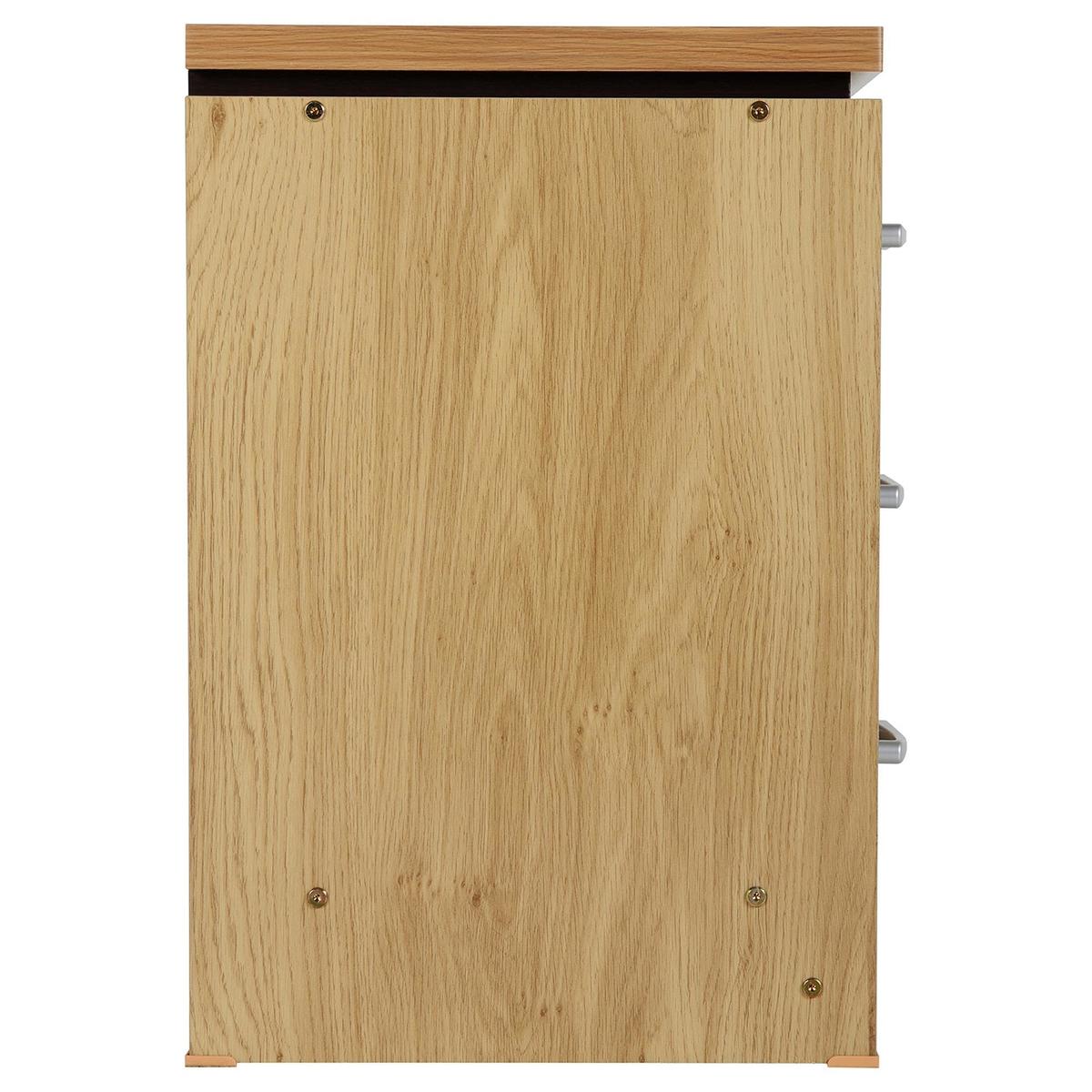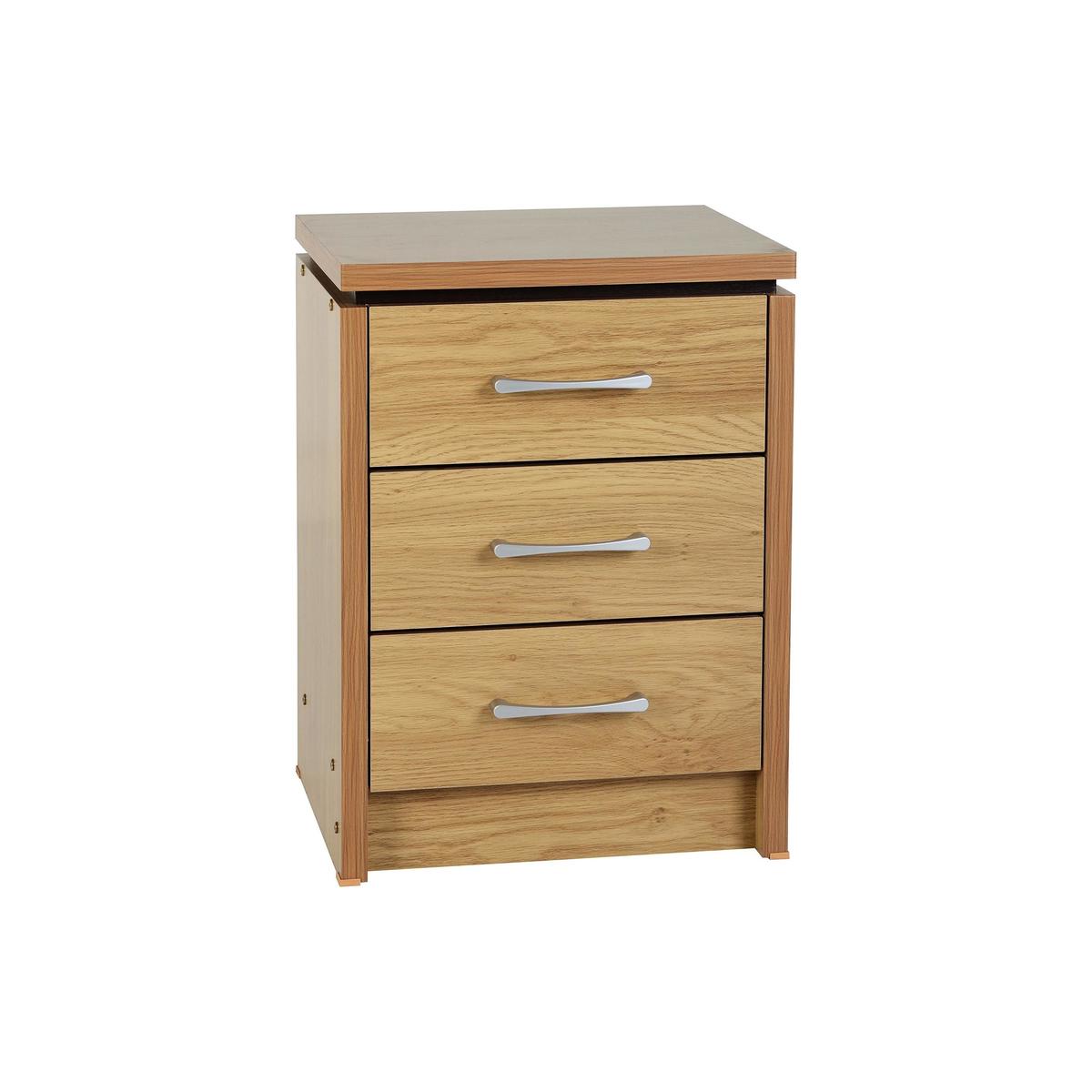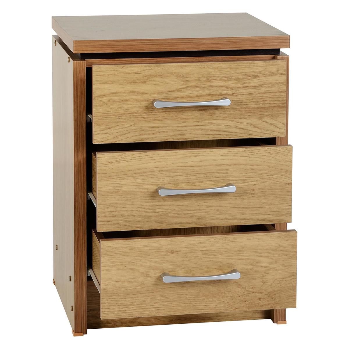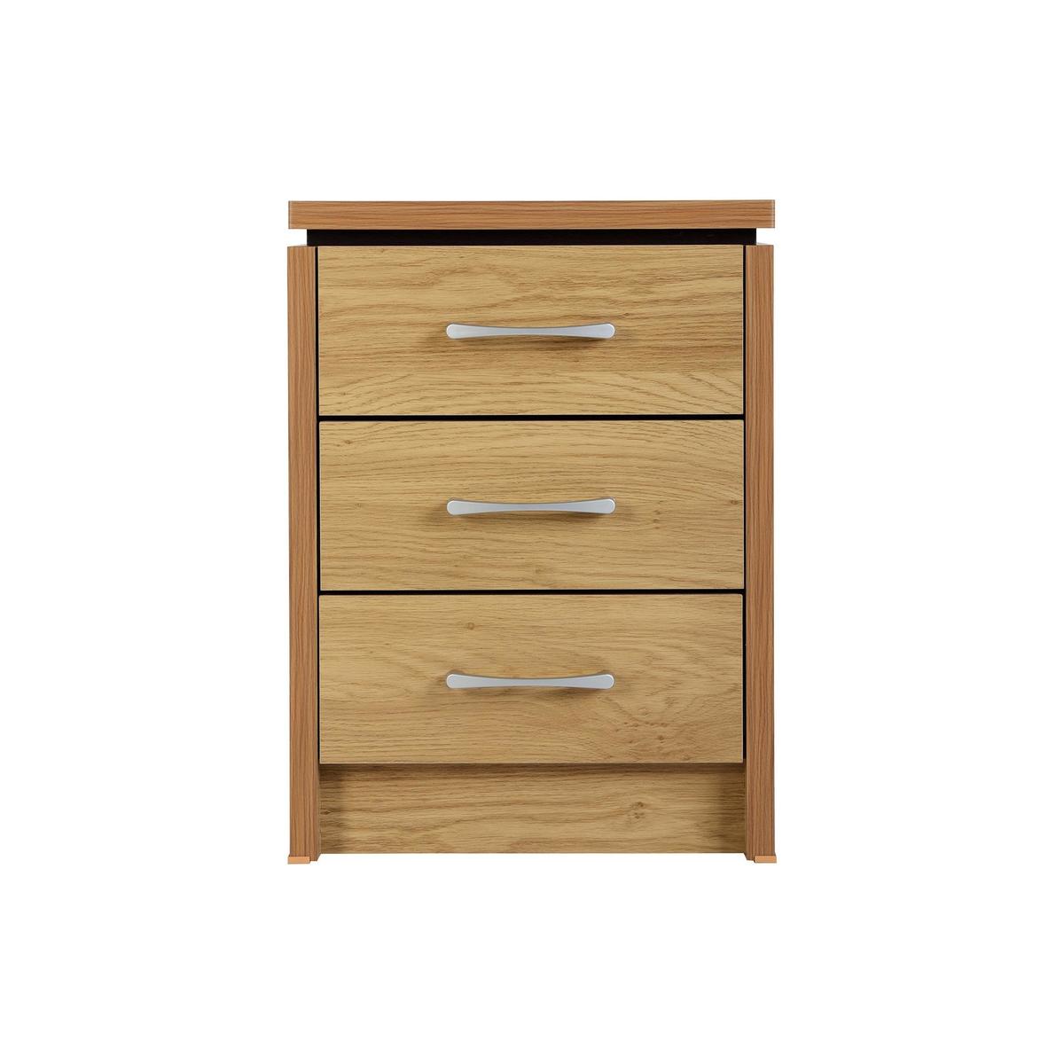 A 3 drawer bedside cabinet crafted from wood with a natural oak veneer and contrasting silver handles. Keep your bedtime essentials close at hand with the Charles 3 Drawer Bedside. Crafted from wood with a natural oak veneer and a subtle walnut trim, this bedside cabinet will look great in any bedroom. There are 3 drawers with plenty of space for diaries, pens or other things that might be lying around! Please note, unfortunately we cannot deliver this item to the Channel Islands.