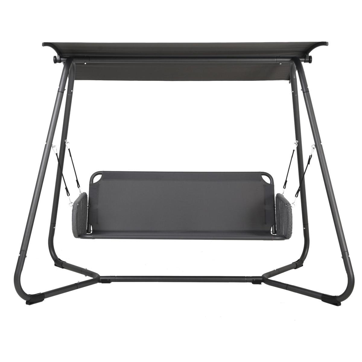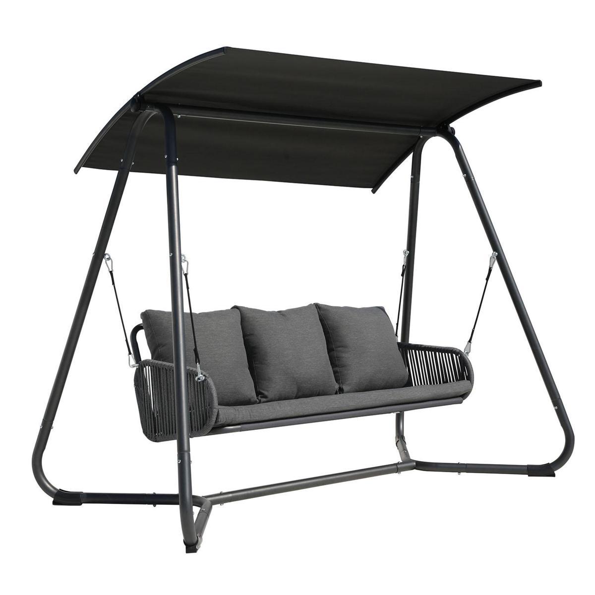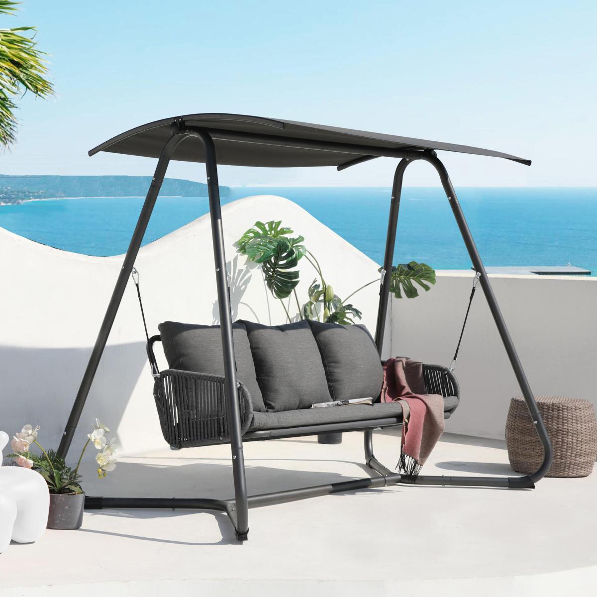 Offering a comfortable and stylish place to sit outdoors for up to three people, this modern swing seat features a sturdy steel frame, complete with a polyester canopy and a stylish rope arm rest design. The swing seat also comes with a padded seat cushion and three back cushions for added comfort. Please note, it is recommended to store this swing seat in a cool dry indoor space during the winter and unexpected weather conditions.