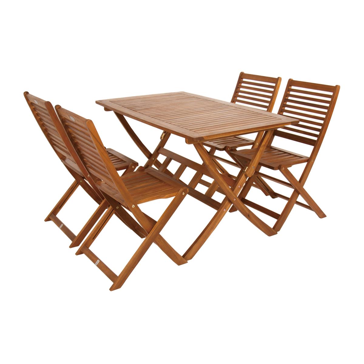 This Hardwood Furniture set is made from quality FSC Acacia Hardwood making it ideal for alfresco dining and still suitable for patios and gardens of most sizes. This set includes a rectangular table and 4 wooden chairs, both the items can be folded and put away for easy compact storage.