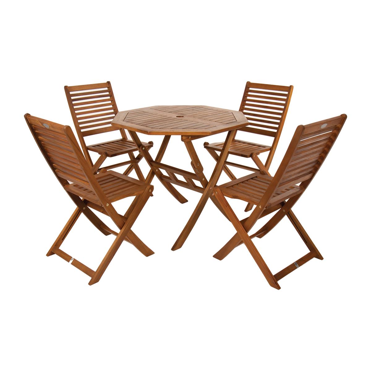 Ideal for alfresco dining, this value wooden octagonal table and chairs set is suitable for patios and gardens of most sizes. It includes 4 hardwood folding chairs for easy compact storage. Parasols and umbrellas can be purchased separately.