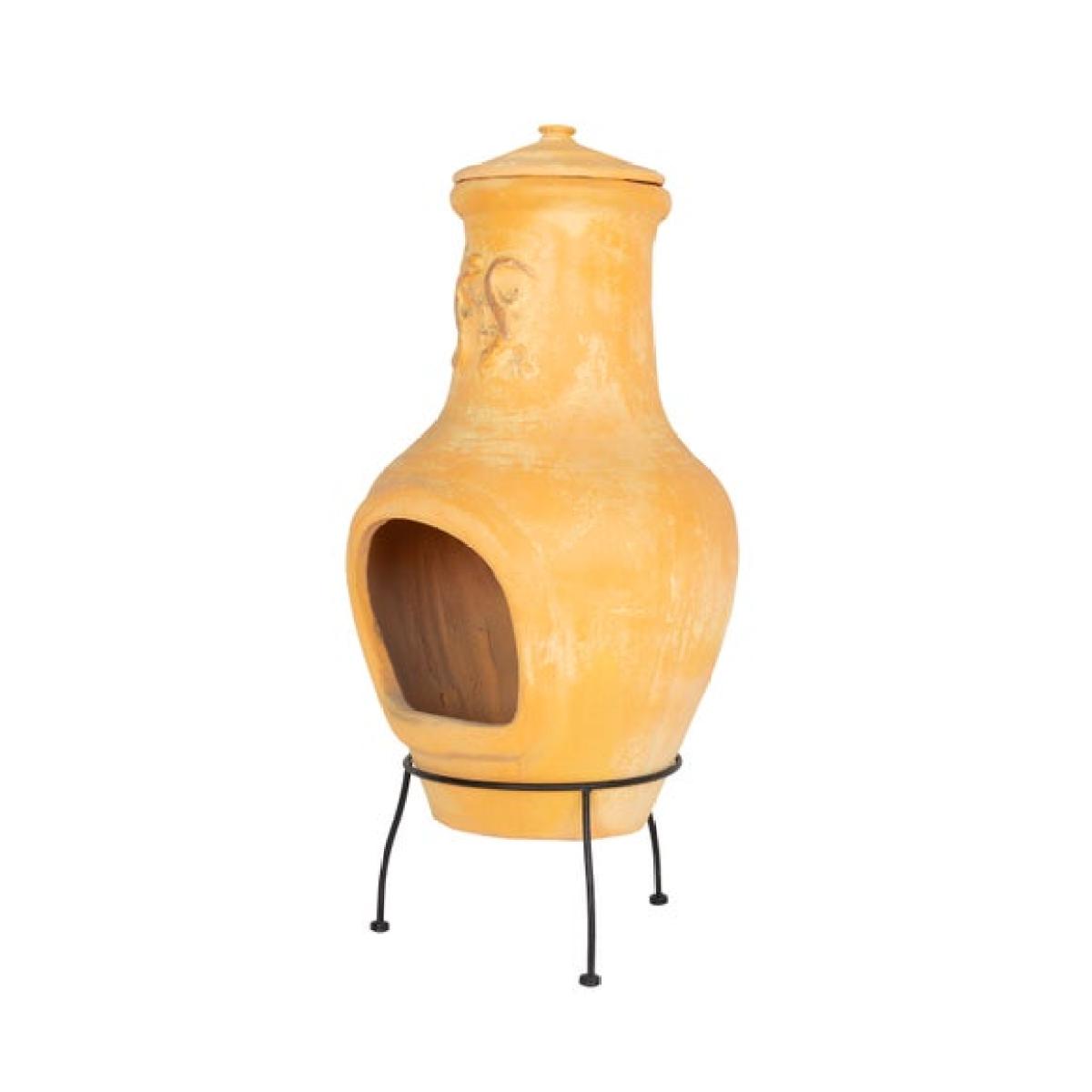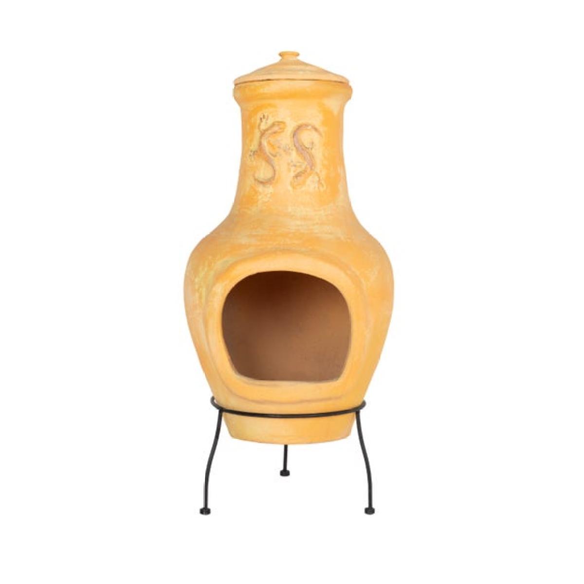 * Classic chiminea * Natural clay frame * Steel legs Bring rustic warmth and artisan charm to your garden with a beautifully crafted clay chiminea. The natural terracotta absorbs and releases heat for a gentle, even glow, perfect for cooler evenings outdoors. A distinctive lizard motif adds character while the sturdy steel stand keeps everything secure. Complete with a rain lid for protection, it is designed for year-round enjoyment and easy maintenance.