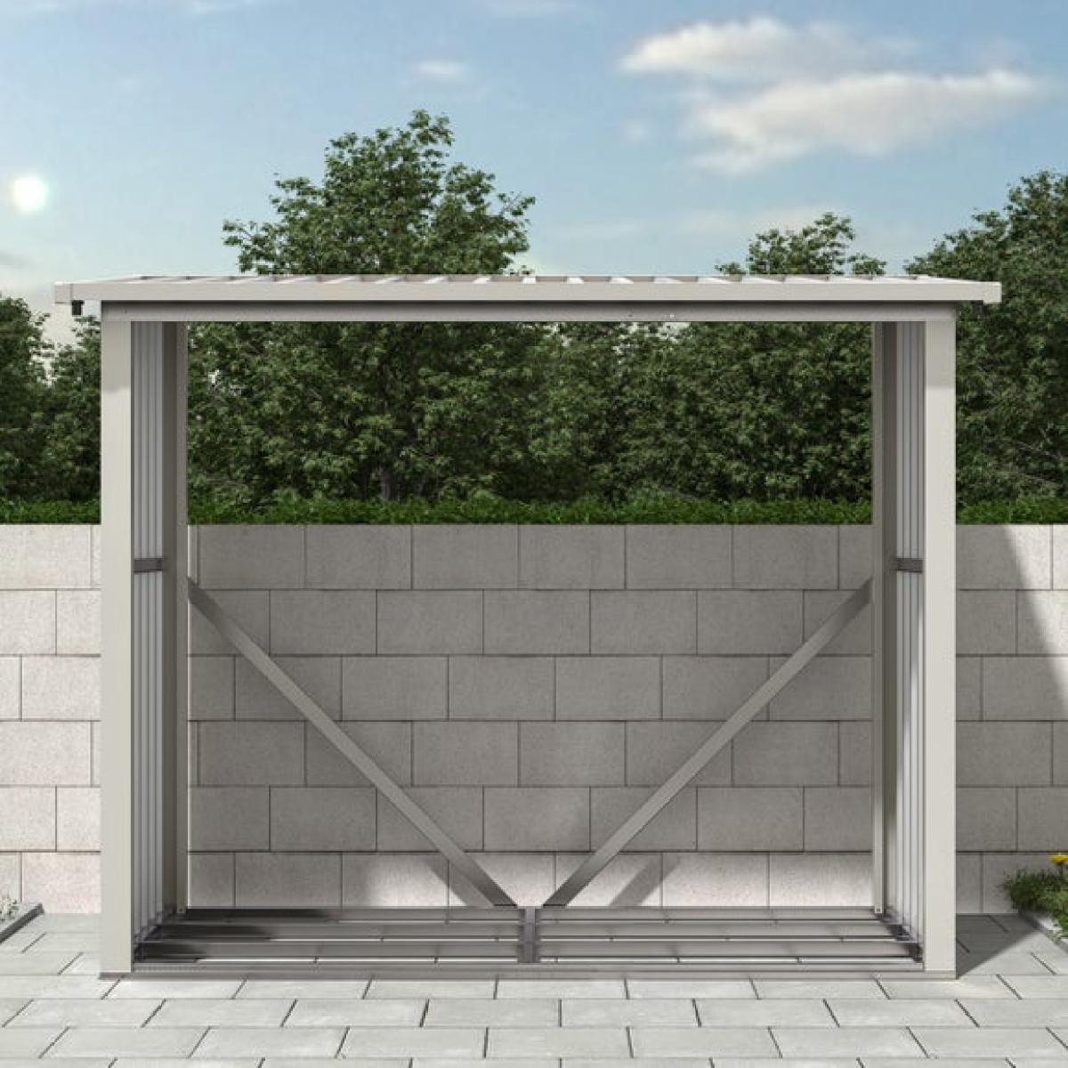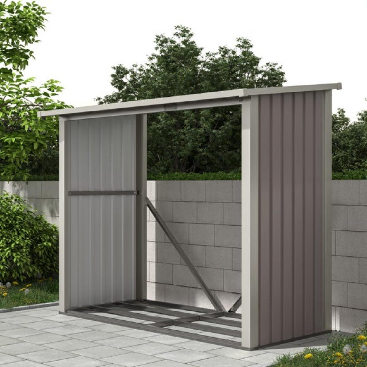 * Large log shed * Steel frame * Supporting panels at the back Keep your firewood neat and dry with this log store shed. Designed with a slanted roof and integrated guttering, this practical piece helps rainwater drain away quickly, protecting your logs from moisture. The raised floor improves air circulation, ensuring your wood stays in the best condition for burning during the colder months. Made from strong steel with a light grey finish and beige trim, this log store is built to last and adds a smart, tidy look to any outdoor space.