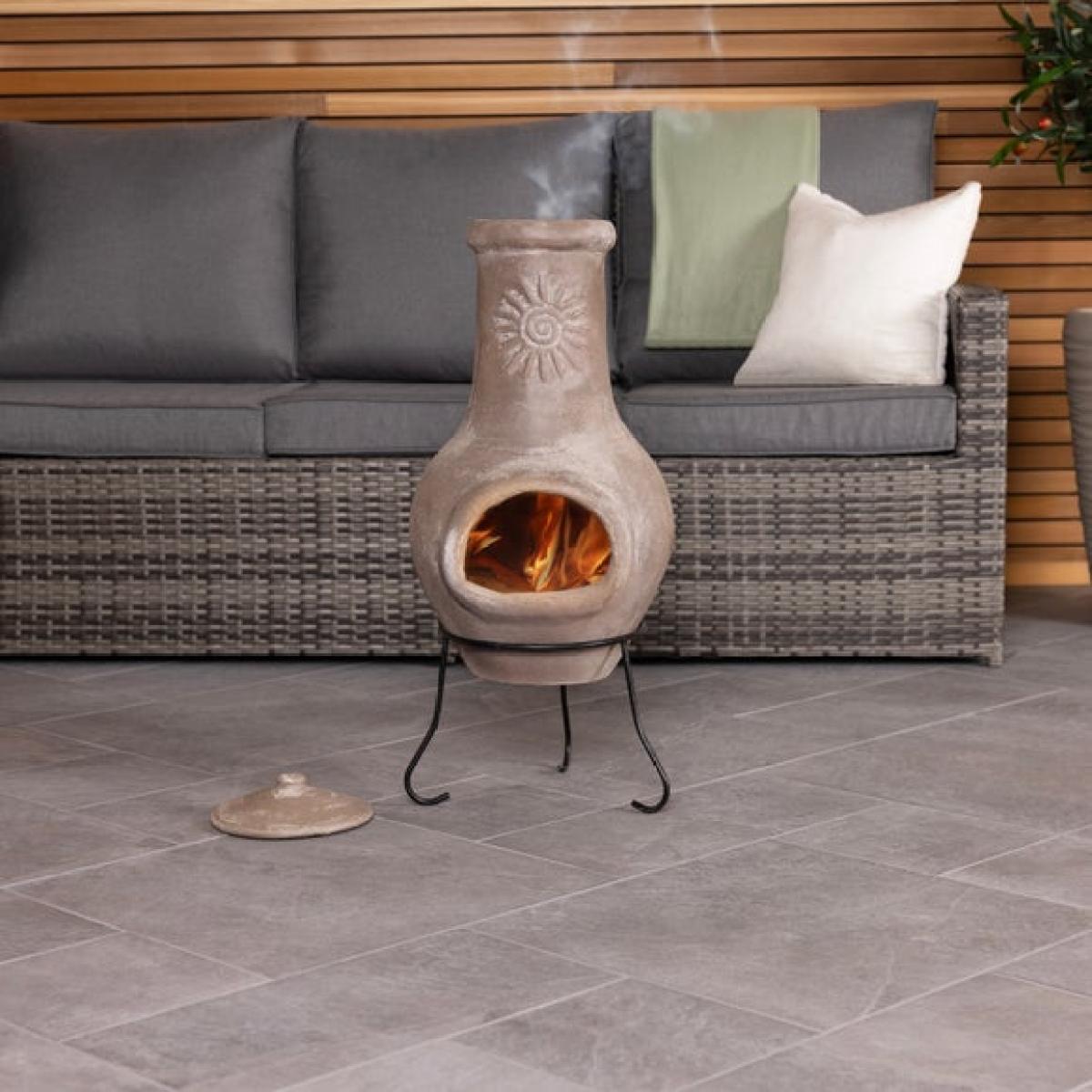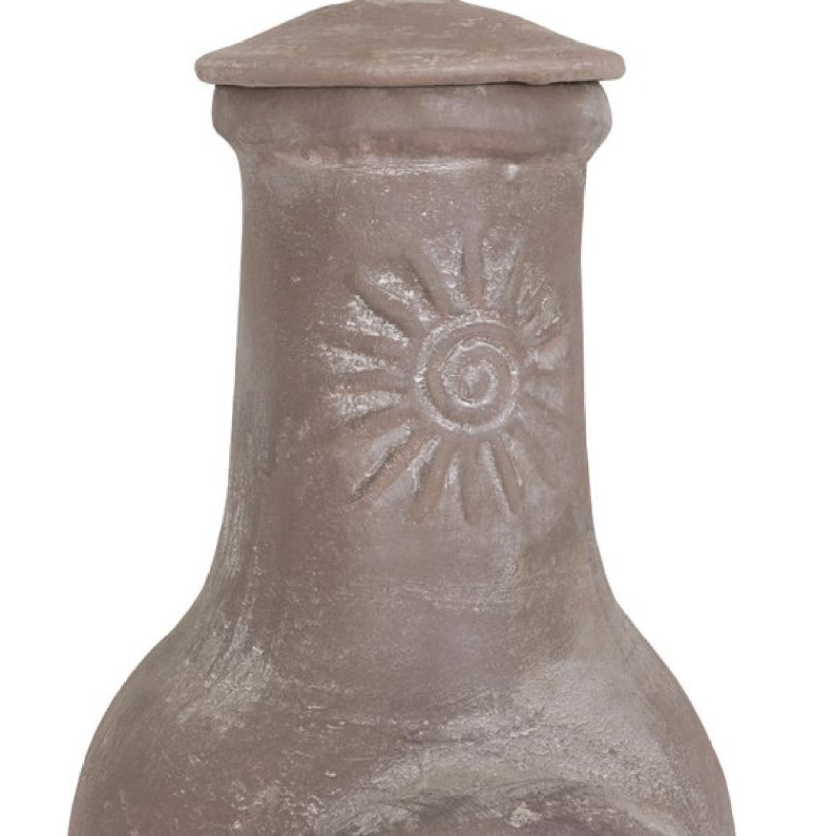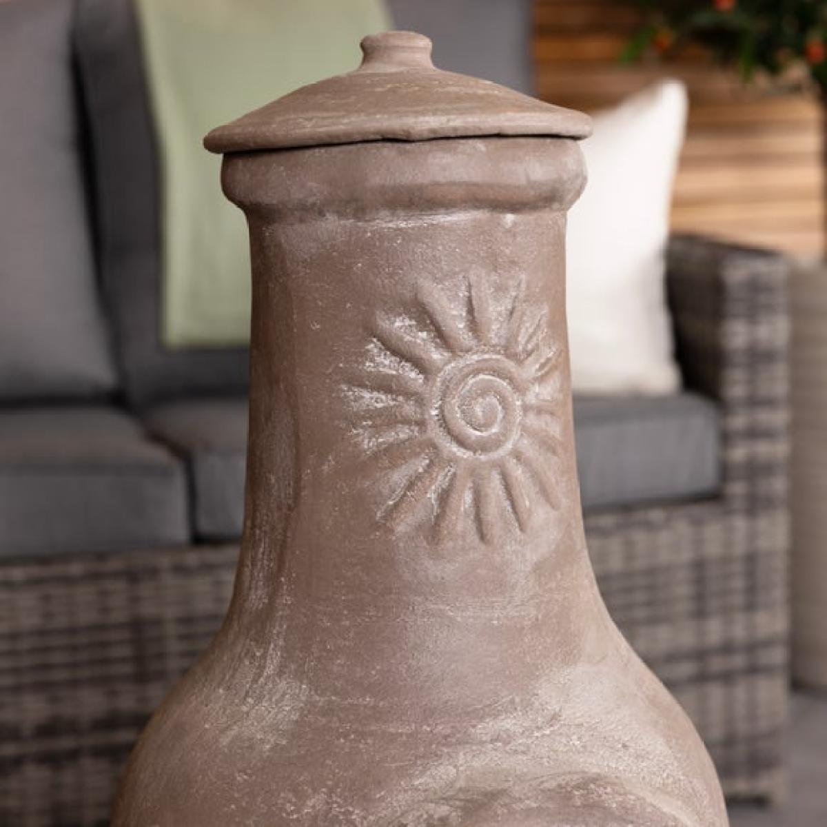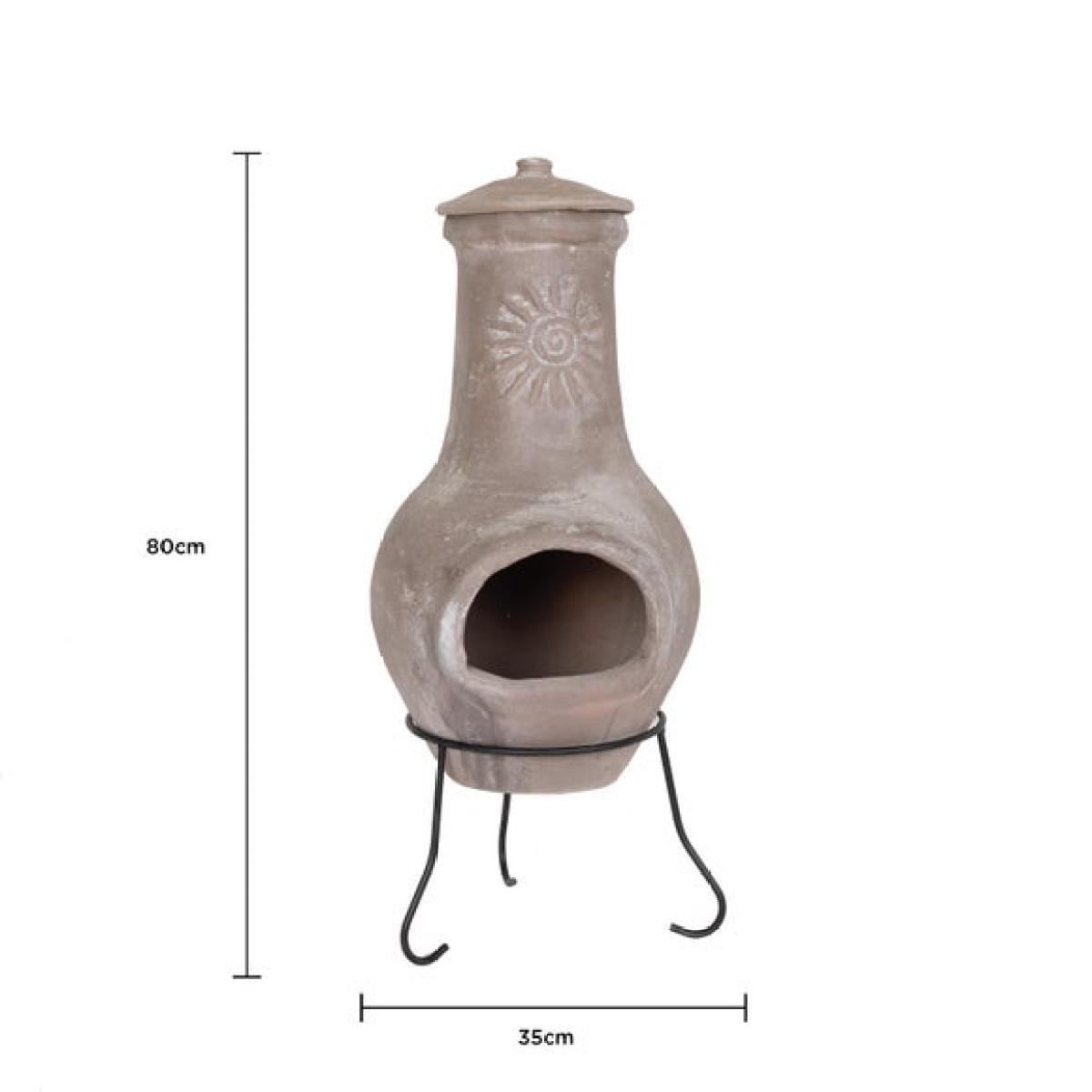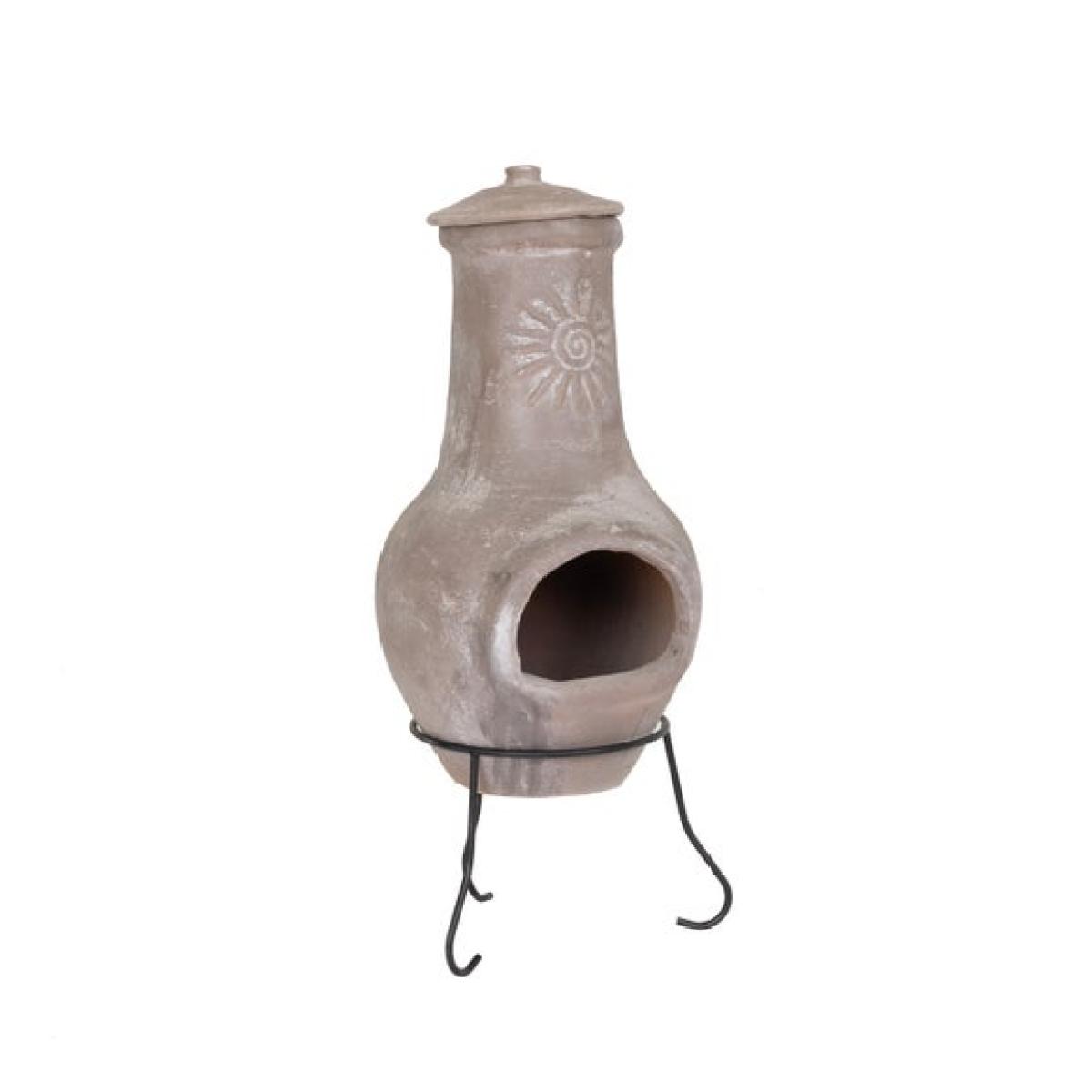 * Classic style chiminea * Natural clay * Metal legs * Wood or coal fuel Create a warm and inviting atmosphere in your garden with this chiminea. Featuring a traditional sun motif and a rustic clay finish, this charming piece is perfect for adding character to any outdoor space. Its natural clay body absorbs and radiates heat beautifully, while the sturdy steel stand keeps it secure and stable. Complete with a protective lid for year-round use, this chiminea burns wood efficiently, making it both practical and stylish for cosy evenings outdoors.