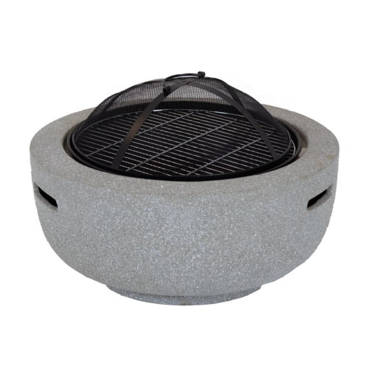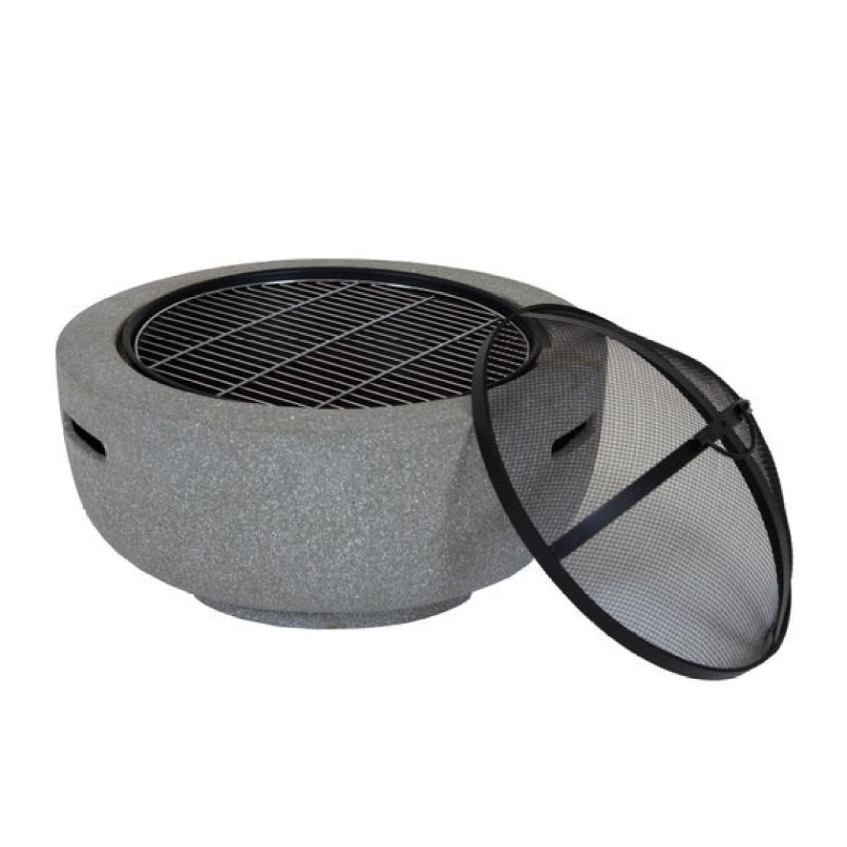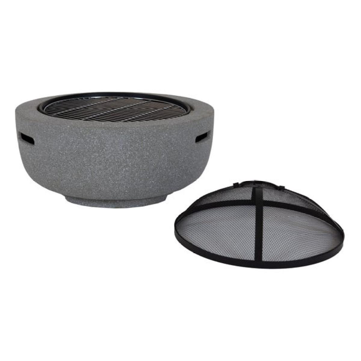 * Metal fire pit * Stone effect * Durable steel Bring a soft stone effect and practical design to your garden with this round fire pit. Lightweight yet strong, it is easy to move and simple to assemble. The mesh cover adds safety while the included grill opens up options for casual cooking.
