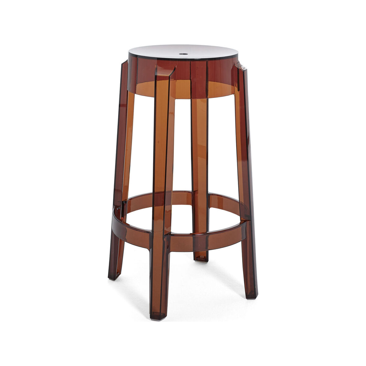 Icon by Philippe Starck… The Charles Ghost stool was born from the neo-classic lines of the Louis Ghost armchair. It combines classic lines inspired by the 16th century using a modern material: polycarbonate. A Grand Siècle style revisited thanks to this ultra-durable plastic material that allows this stool to be equally comfortable indoors and out. The lines of the legs are rounded and slightly curved. This high stool has great charisma and a strong personality. It imposes its elegance in modern or more classic environments. Stackable, stable and solid, it’s both refined and easy to live with! Polycarbonate is a very resistant, unbreakable material, but its surface remains fragile to micro-scratches, which are all the more accentuated by its transparent character. For cleaning, do not use a sponge with a scraper, but a soft sponge.