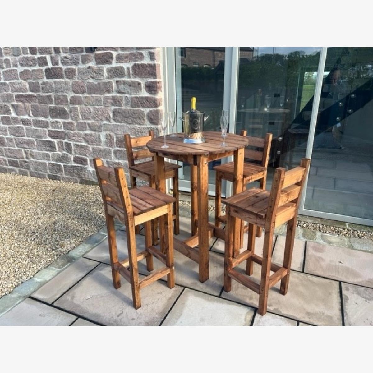 This Tall Round Bar Table with 4 x back supported Bar Stools is perfect for a growing family to relax and enjoy the warmer months, a ideal feature to add next to your garden pond or overlooking your flower beds and provides extra seating for when guests come over for a BBQ. Crafted from sturdy Scandinavian Redwood dipped in oil-based preservative with rustproof zinc bolts, this bench perfectly combines style and practicality. Enjoy this bench as soon as it arrives thanks to the assembly service from Charles Taylor's professional delivery team. Features: Stylish modern design Deluxe back supported stool Commercial constructed Great for hospitality venues Ideal for any patio 10 year rot free guarantee Treated with an oil based water repellent preservative All materials FSC-Sourced Dimensions: Table: H 1110mm x Dia 860mm Stool: H 1100 mm x W 400mm x D 430mm All screens vary in colour reproduction and whilst every effort has been made to display the colour as accurately as possible it is for guidance only.
