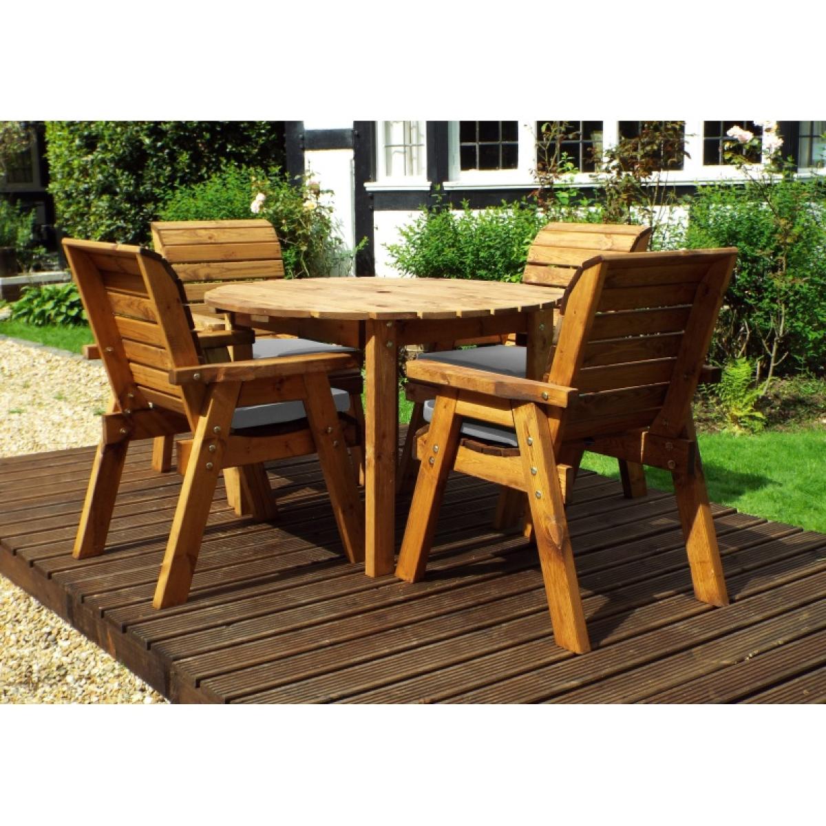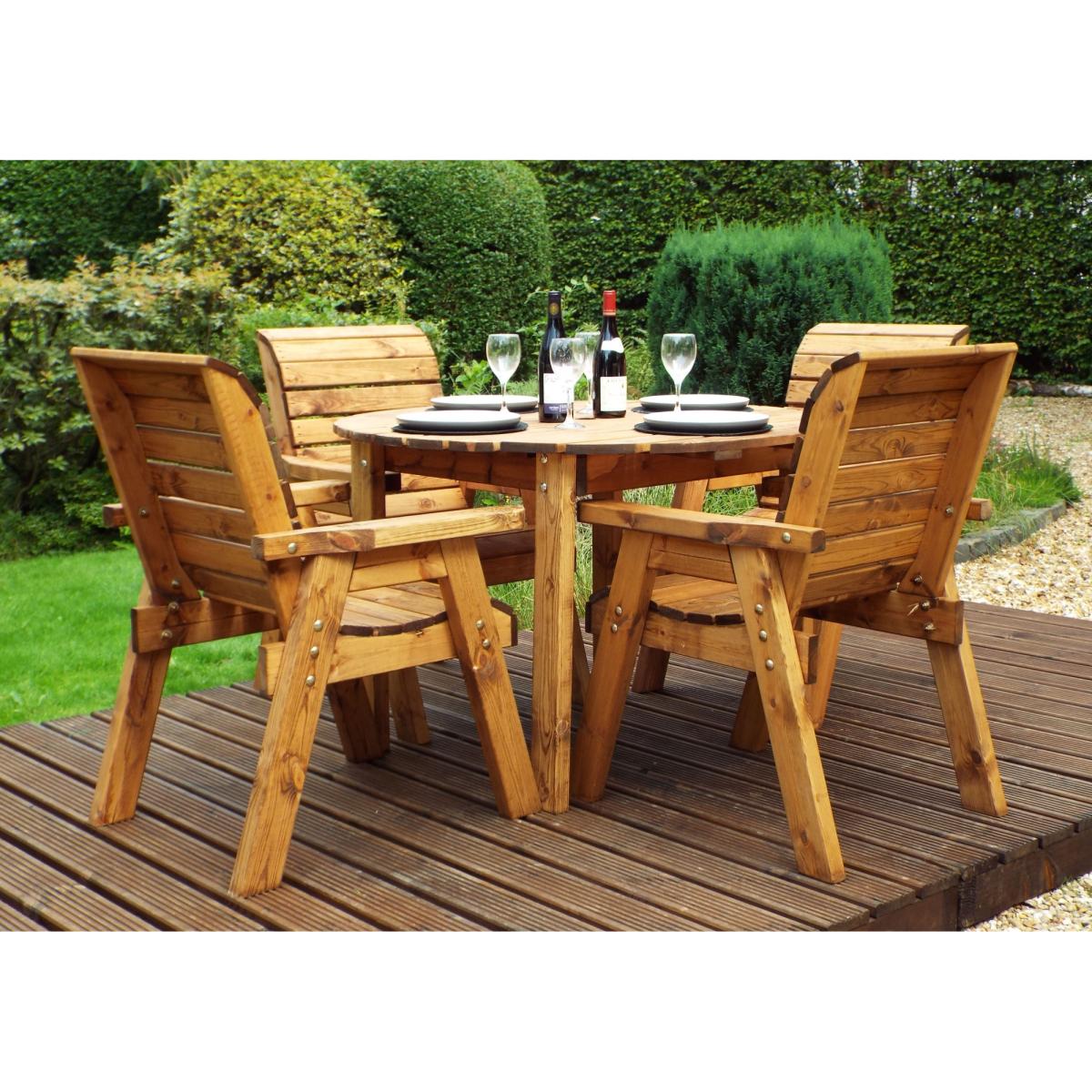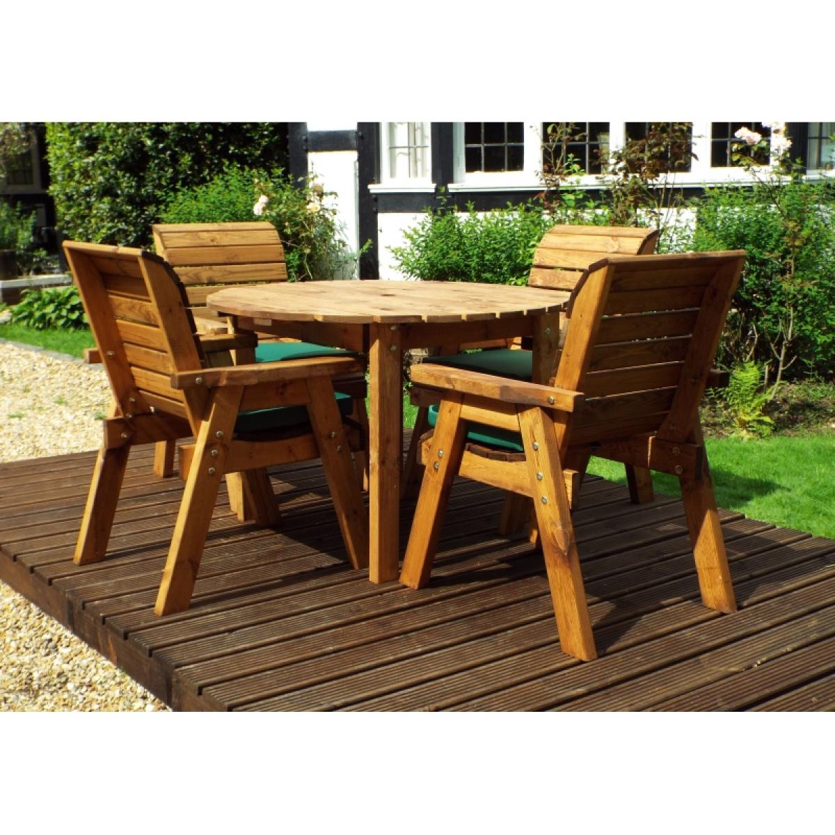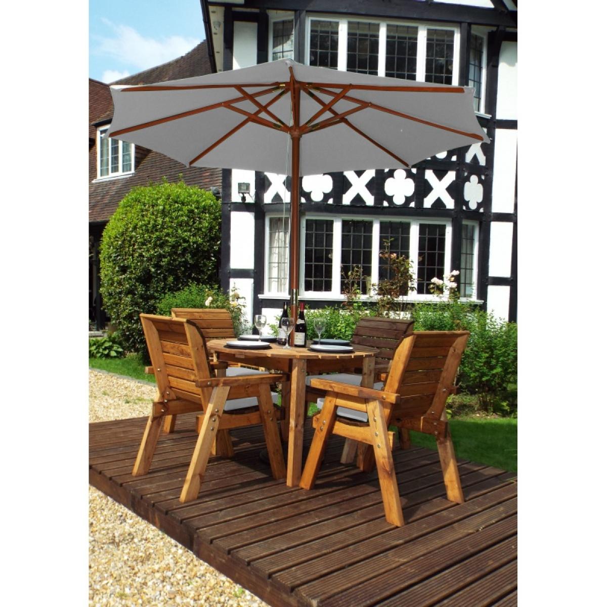 This Charles Taylor four seater round table set is a great addition to your outdoor space for a touch of style and somewhere to relax. This outdoor dining set is constructed from tough and durable timber so it's built to last, giving you years of outdoor enjoyment. The set comes complete with seat cushions, a cushion storage bag, a matching 2.7m parasol and a parasol base. Perfect for decking out your garden with everything you need. Set Includes: 1 x Round Table 4 x Chairs 4 x Chair Cushions (Green, Grey or Burgundy) 1 x Parasol (Green, Grey or Burgundy) 1 x Parasol Base 1 x Cushion Storage Bag Features: Four traditional chairs One circular table Complete with hole for parasol Traditional four seater dining set 10 year rot free guarantee Treated with an oil based water repellent preservative All materials FSC-Sourced Specifications: Dimensions: D 2300mm x W 2300mm x H 980mm Weight: 82kg Seat Height: 460mm Internal arm width: 510mm All screens vary in colour reproduction and whilst every effort has been made to display the colour as accurately as possible it is for guidance only.