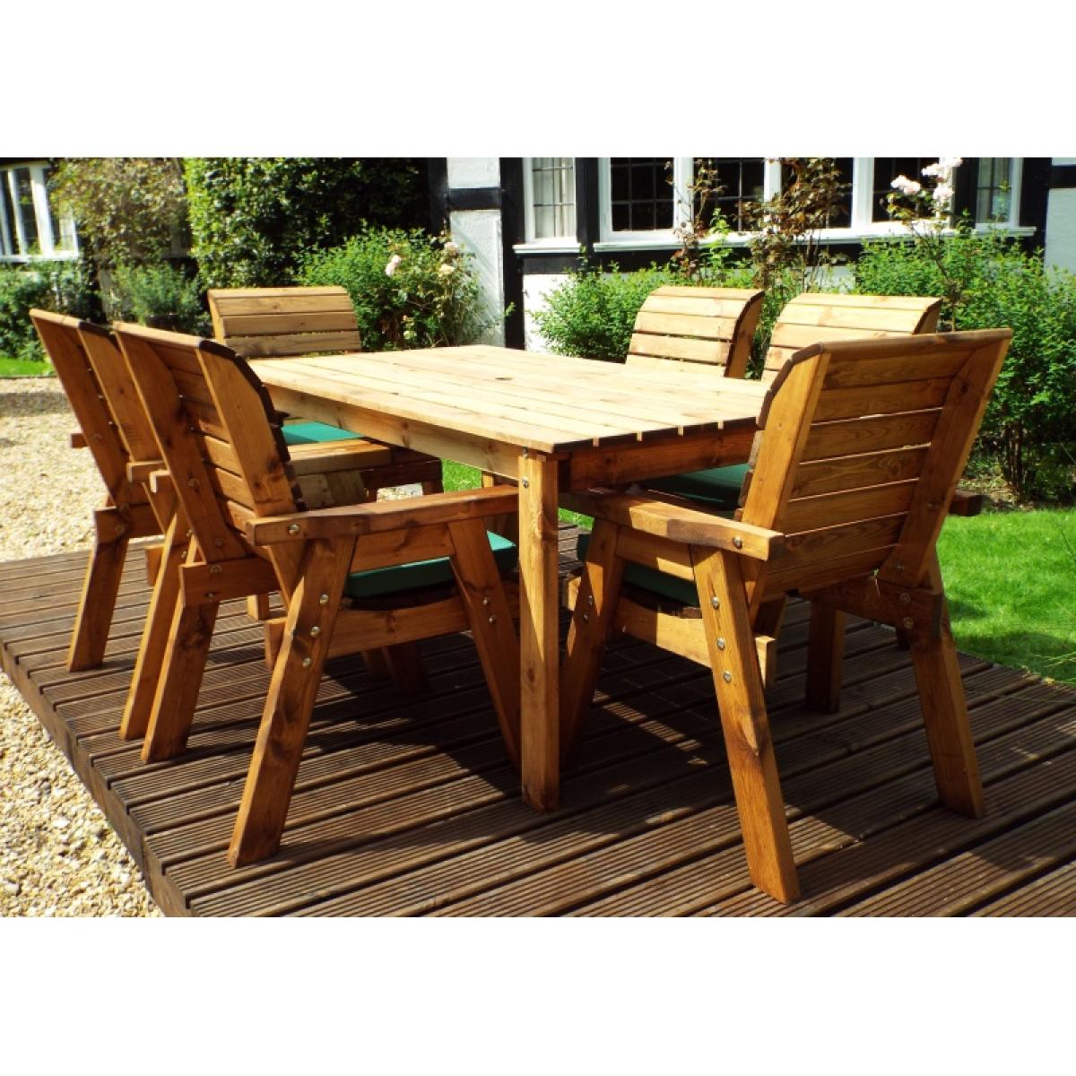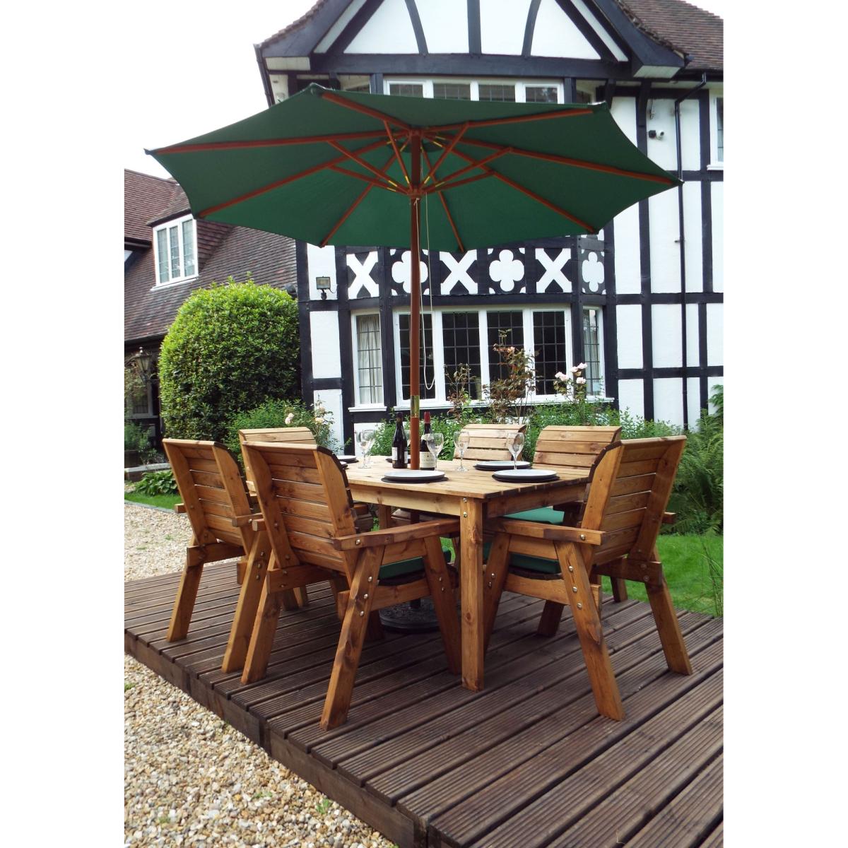 This Charles Taylor six seater rectangular table set is a great addition to your outdoor space for a touch of style and somewhere to relax. This outdoor dining set is constructed from tough and durable timber so it's built to last, giving you years of outdoor enjoyment. The set comes complete with seat cushions, a cushion storage bag, a matching 2.7m parasol and a parasol base. Perfect for decking out your garden with everything you need. The grey cushions and matching parasol give you a complete and altogether look to compliment your outdoor décor. With seat cushions providing comfort, the 2.7m parasol giving you shade and the parasol base holding it in place, this set has everything you need for relaxing in your garden. Set Includes: 1 x Rectangular Table 6 x Chairs 6 x Chair Cushions (Green, Grey or Burgundy) 1 x Parasol (Green, Grey or Burgundy) 1 x Parasol Base 1 x Cushion Storage Bag Features: Six traditional chairs One rectangular table (L-1800 , W-950mm) Complete with hole for parasol 10 year rot free guarantee Treated with an oil based water repellent preservative All materials FSC-Sourced Specifications: Dimensions:D 2450mm x W 2900mm x H 980mm Weight: 120kg Weight limit per chair: 130kg Seat height off ground: 460mm Internal arm width: 510mm All screens vary in colour reproduction and whilst every effort has been made to display the colour as accurately as possible it is for guidance only.