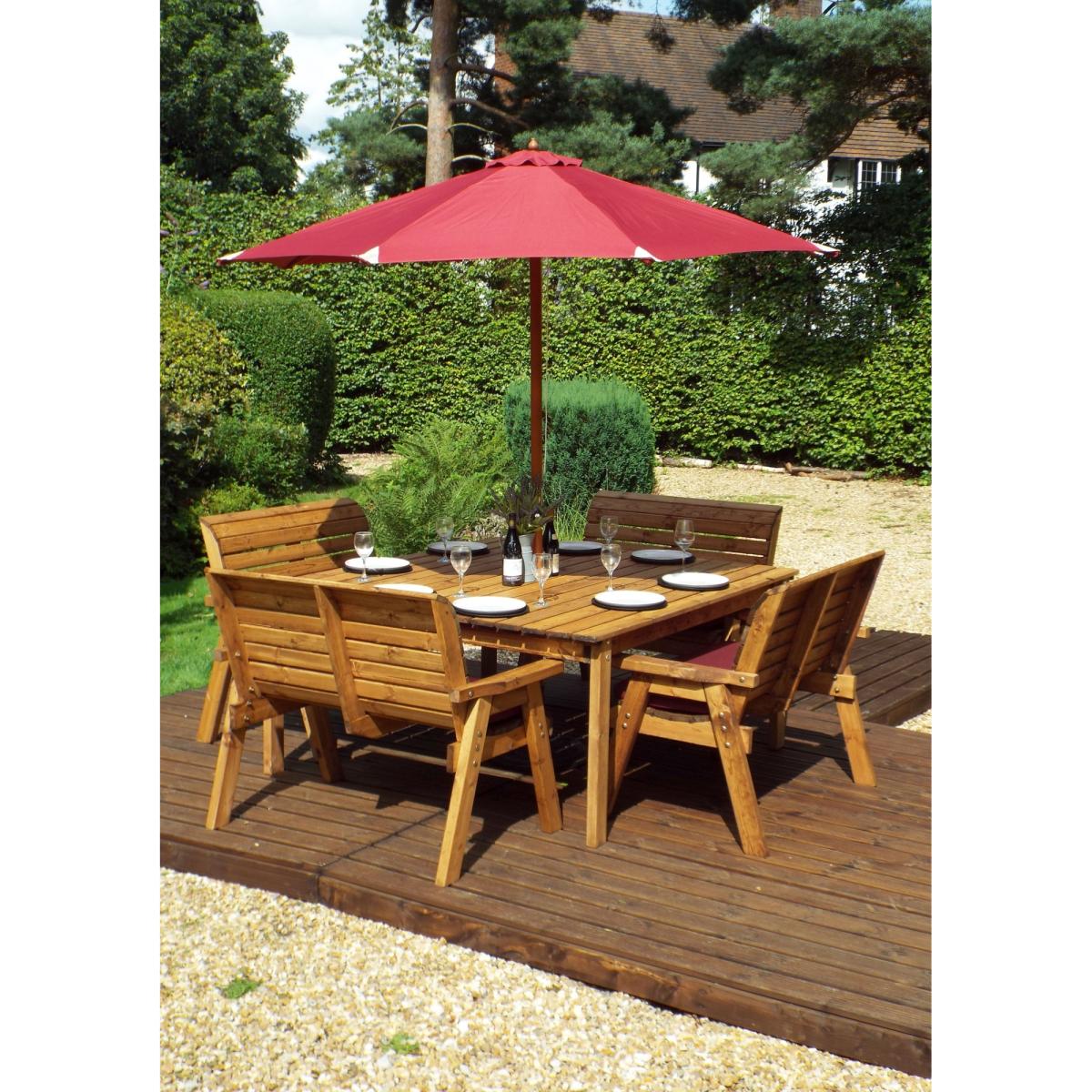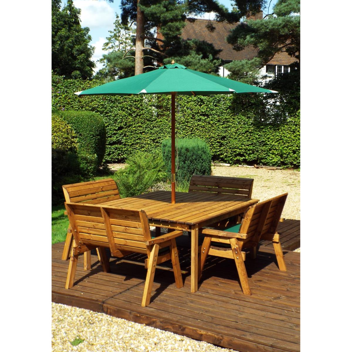 This Charles Taylor eight-seater square table set is a great addition to your outdoor space for a touch of style and somewhere to relax. This outdoor dining set is constructed from tough and durable timber so it's built to last, giving you years of outdoor enjoyment. The set comes complete with seat cushions, a cushion storage bag, a matching 2.7m parasol and a parasol base. Perfect for decking out your garden with everything you need. The burgundy, green or grey cushions and matching parasol give you a complete and altogether look to compliment your outdoor décor. With seat cushions providing comfort, the 2.7m parasol giving you shade and the parasol base holding it in place, this set has everything you need for relaxing in your garden. Set Includes: 1 x Table 4 x 2 Seater Benches 4 x Bench Cushions (Green, Grey or Burgundy) 1 x Parasol (Green, Grey or Burgundy) 1 x Parasol Base 1 x Cushion Storage Bag Features: 4 x Benches Square table (1600 x 1750mm) Comes with hole for parasol 10 year rot free guarantee Treated with an oil based water repellent preservative All materials FSC-Sourced. Specifications: Dimensions: D 2500mm x W 2500 mm x H 980mm Weight: 132kg Weight limit per bench: 200kg Seat height off ground: 460mm Internal arm width: 1020mm All screens vary in colour reproduction and whilst every effort has been made to display the colour as accurately as possible it is for guidance only.