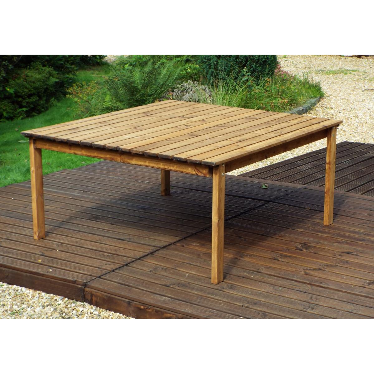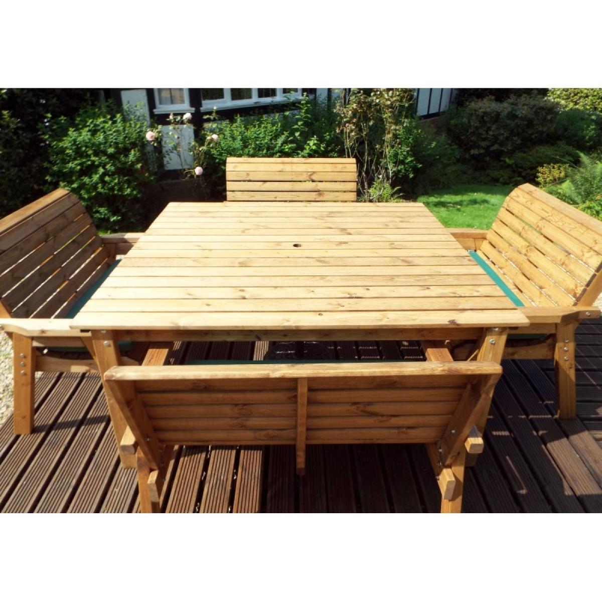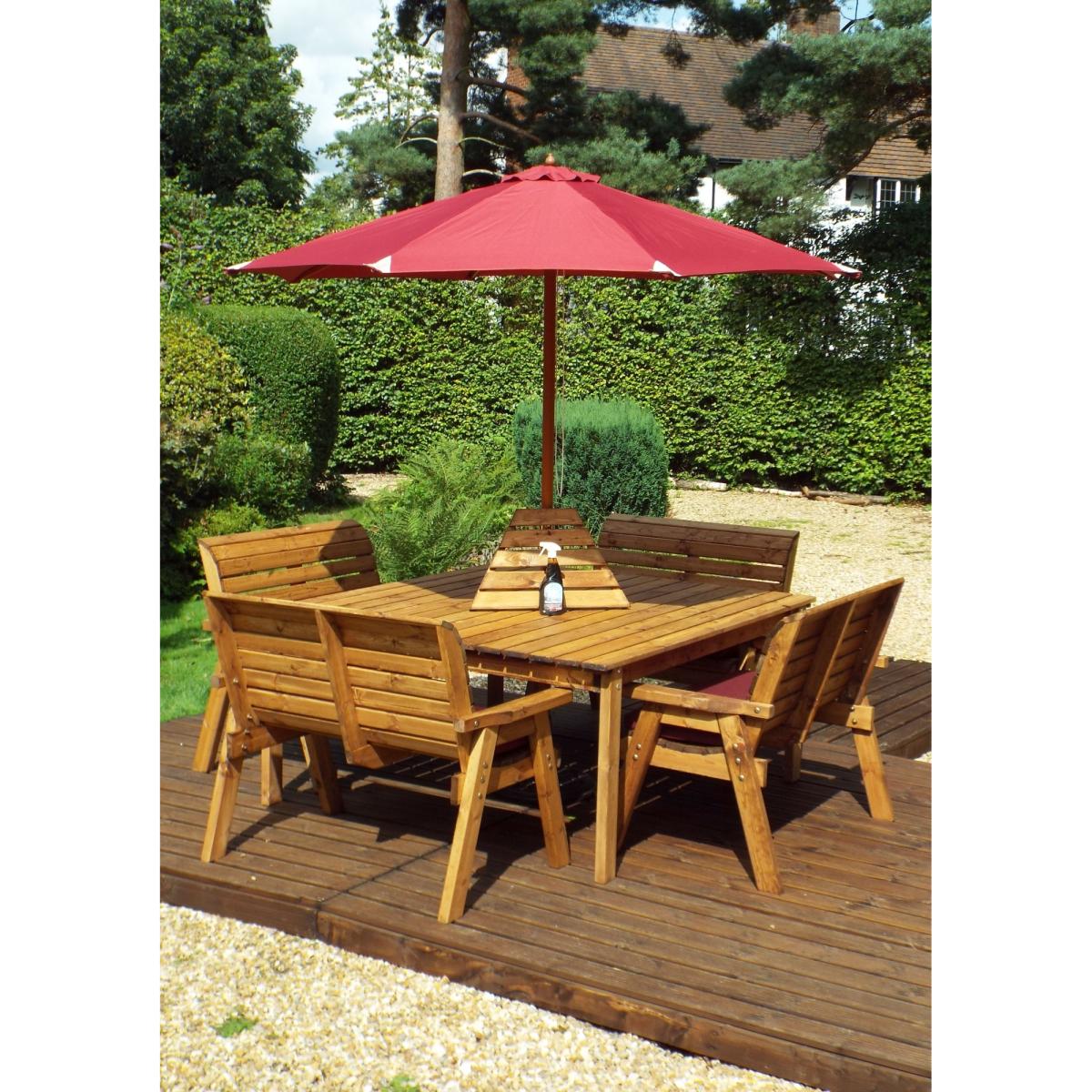 This Charles Taylor eight-seater square table set is a great addition to your outdoor space for a touch of style and somewhere to relax. This outdoor dining set is constructed from tough and durable timber so it's built to last, giving you years of outdoor enjoyment. The set comes complete with seat cushions, a cushion storage bag, a matching 2.7m parasol and a parasol base. Perfect for decking out your garden with everything you need. The burgundy, green or grey cushions and matching parasol give you a complete and altogether look to compliment your outdoor décor. With seat cushions providing comfort, the 2.7m parasol giving you shade and the parasol base holding it in place, this set has everything you need for relaxing in your garden. Set Includes: 1 x Table 4 x 2 Seater Benches 4 x Bench Cushions (Green, Grey or Burgundy) 1 x Parasol (Green, Grey or Burgundy) 1 x Parasol Base 1 x Cushion Storage Bag Features: 4 x Benches Square table (1600 x 1750mm) Comes with hole for parasol 10 year rot free guarantee Treated with an oil based water repellent preservative All materials FSC-Sourced. Specifications: Dimensions: D 2500mm x W 2500 mm x H 980mm Weight: 132kg Weight limit per bench: 200kg Seat height off ground: 460mm Internal arm width: 1020mm All screens vary in colour reproduction and whilst every effort has been made to display the colour as accurately as possible it is for guidance only.