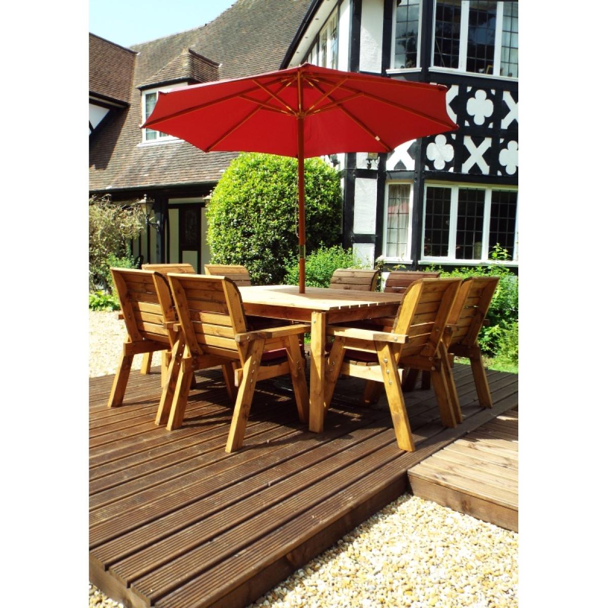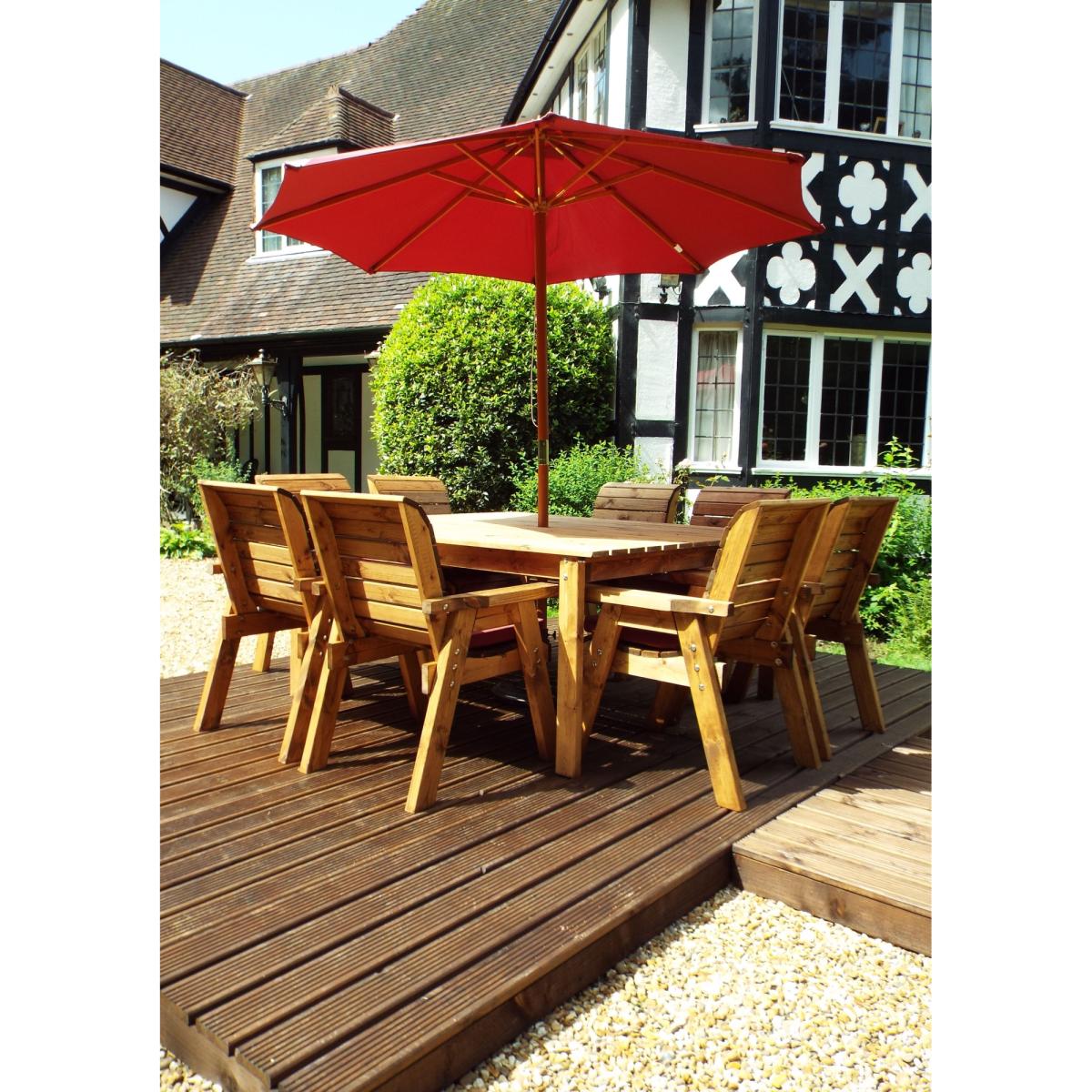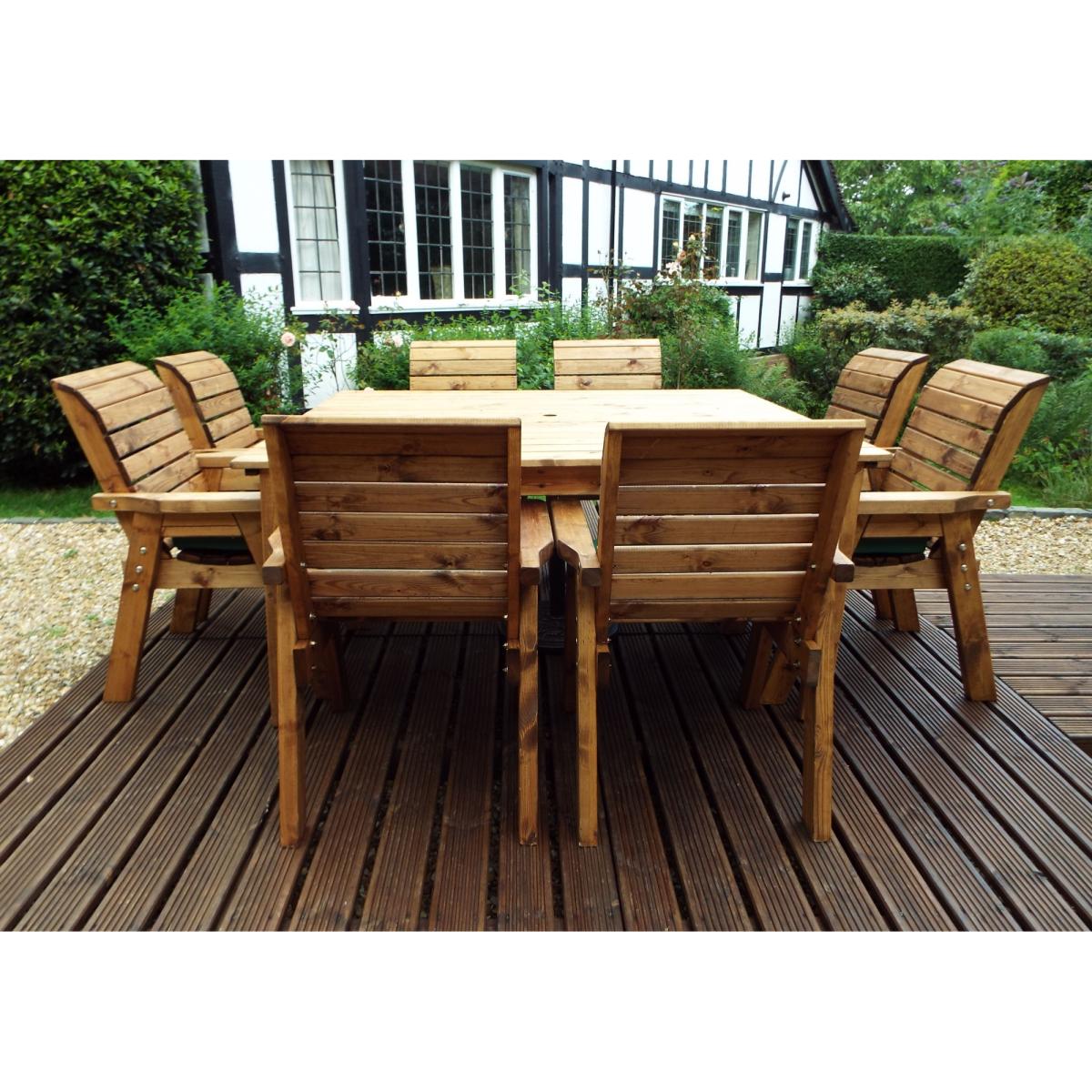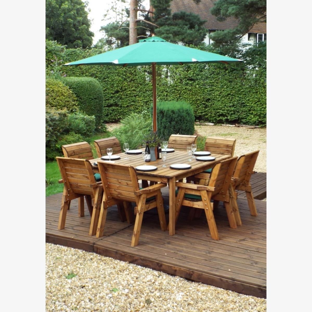 This Charles Taylor eight seater table and chair set is a great addition to your outdoor space for a touch of style and somewhere to relax. This outdoor dining set is constructed from tough and durable timber so it's built to last, giving you years of outdoor enjoyment. The set comes complete with seat cushions, a cushion storage bag, a matching 2.7m parasol and a parasol base. Perfect for decking out your garden with everything you need. Set Includes: 1 x Table 8 x Chairs 8 x Chair Cushions (Green, Grey or Burgundy) 1 x Parasol (Green, Grey or Burgundy) 1 x Parasol Base 1 x Cushion Storage Bag Features: 8 x Chairs One square table Comes with hole for parasol 10 year rot free guarantee Treated with an oil based water repellent preservative All materials FSC-Sourced Specifications: Dimensions: D 2500mm x W 2500mm x H 980mm Weight: 160kg Weight limit per chair: 130kg Seat height off ground: 460mm Internal arm width: 510mm All screens vary in colour reproduction and whilst every effort has been made to display the colour as accurately as possible it is for guidance only.