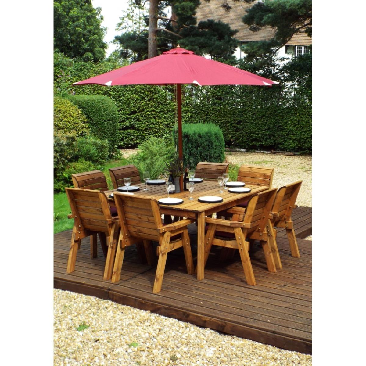 This Charles Taylor eight seater table and chair set is a great addition to your outdoor space for a touch of style and somewhere to relax. This outdoor dining set is constructed from tough and durable timber so it's built to last, giving you years of outdoor enjoyment. The set comes complete with seat cushions, a cushion storage bag, a matching 2.7m parasol and a parasol base. Perfect for decking out your garden with everything you need. Set Includes: 1 x Table 8 x Chairs 8 x Chair Cushions (Green, Grey or Burgundy) 1 x Parasol (Green, Grey or Burgundy) 1 x Parasol Base 1 x Cushion Storage Bag Features: 8 x Chairs One square table Comes with hole for parasol 10 year rot free guarantee Treated with an oil based water repellent preservative All materials FSC-Sourced Specifications: Dimensions: D 2500mm x W 2500mm x H 980mm Weight: 160kg Weight limit per chair: 130kg Seat height off ground: 460mm Internal arm width: 510mm All screens vary in colour reproduction and whilst every effort has been made to display the colour as accurately as possible it is for guidance only.