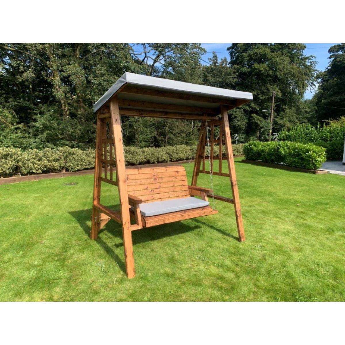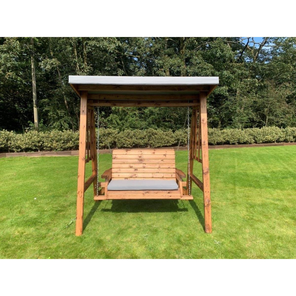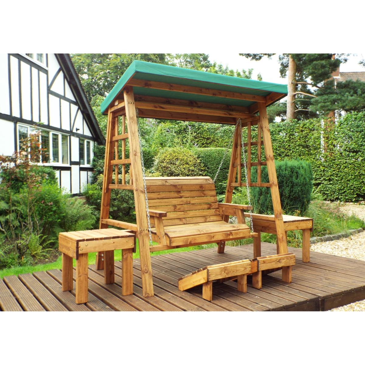Please note, the Footstools & Drinks Tables are for illustration purposes only, to show how the swing can be extended. These are not included in this price. A great addition to your garden, this two swinging seat and arbour from Charles Taylor is the ideal spot for relaxing and enjoying your outdoor space. For extra comfort this swing seat comes with waterproof cushions in a stylish grey, green or burgundy colour. On top of this unit sits a coloured waterproof canopy for an added splash of colour and to give the unit extra protection from the elements. Made from tough timber and fitted together with rustproof galvanised zinc bolting, this seat is built to last giving you years of outdoor enjoyment. Enjoy this seat as soon as it arrives thanks to the assembly service provided by Charles Taylor's professional delivery team. Set Includes: 1 x Dorset Two Seater Swing 1 x Bench Cushion (Green, Grey or Burgundy) 1 x Scatter Cushion (Green, Grey or Burgundy) Features: Stylish innovative design Complete with detachable cover Detachable seat 10 year rot free guarantee Treated with an oil based water repellent preservative All materials FSC-Sourced Specifications: Dimensions:D 1240mm x W 1700mm x H 1960mm Weight: 66kg Weight limit: 160kg Seat height off ground: 520mm Internal arm width: 1020mm All screens vary in colour reproduction and whilst every effort has been made to display the colour as accurately as possible it is for guidance only.
