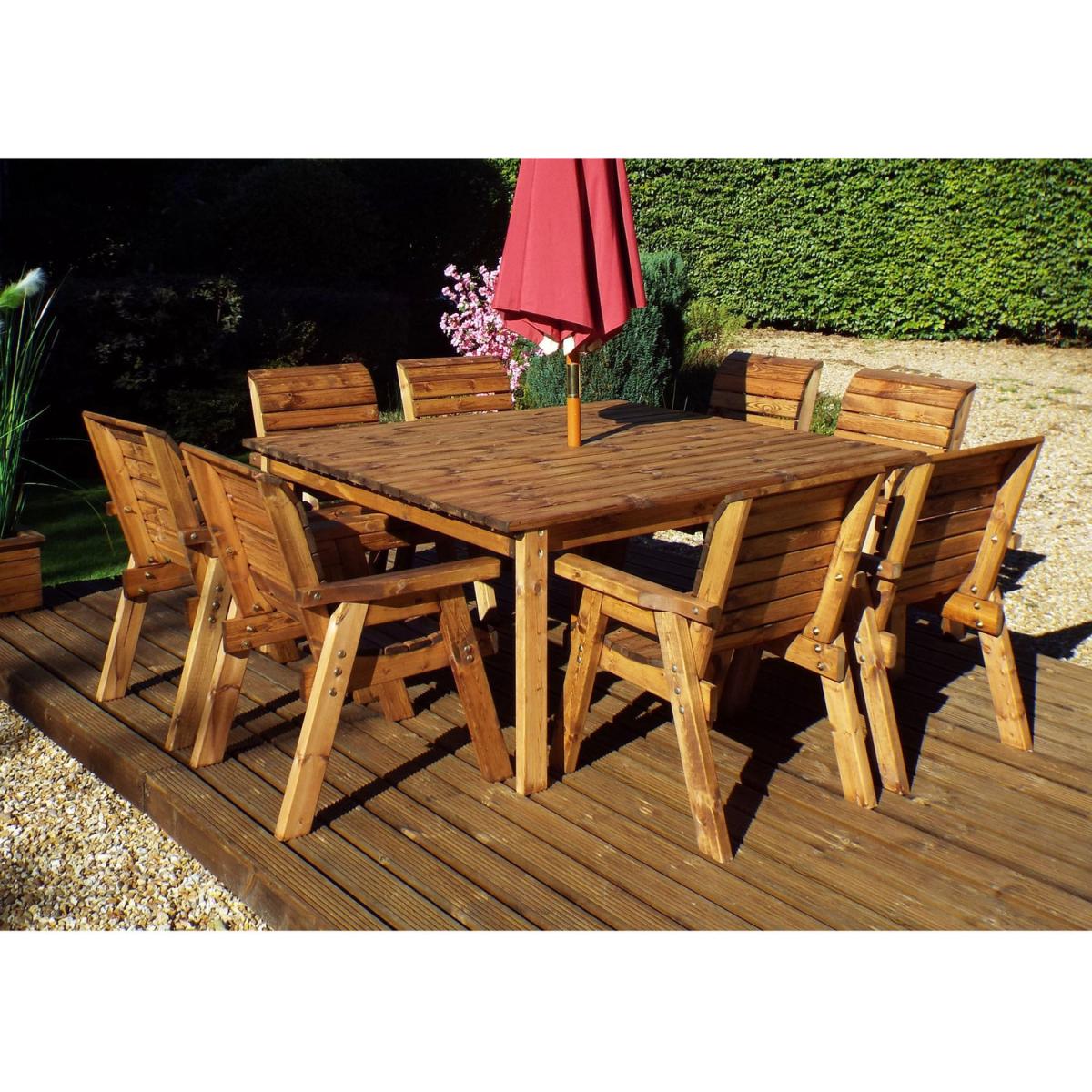 Take advantage of your outdoor space with this large, high-quality wooden dining set. Crafted from sturdy Scandinavian Redwood dipped in oil-based preservative with rustproof zinc bolts, this dining table perfectly combines style and practicality. Eight traditional chairs with one square table complete with ready drilled hole for parasol. The Individual seating option makes this ideal for spacious family dining during the summer months.