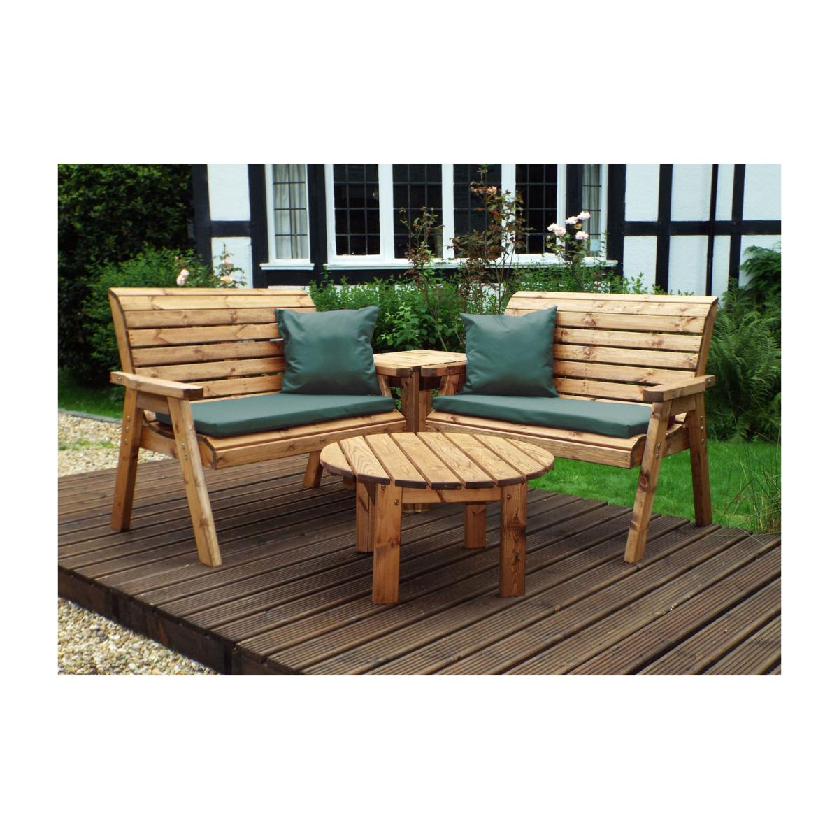Charles Taylor 4 Seat Solid Wood Outdoor Corner Unit Bench Set (2x Two Seat Benches and Corner Companion Table), Round Coffee Table, with Bench and Scatter Cushions. A beautiful and versatile addition to an outdoor space. Constructed at our factory in the UK and manufactured from Scandinavian Redwood. As the name implies, this timber grows in a cold climate. The slow growth associated with the low temperature produces a much denser, more robust wood which is perfect for outdoor Residential or Commercial Use i.e. Pubs, Parks, Care Homes, Schools etc.