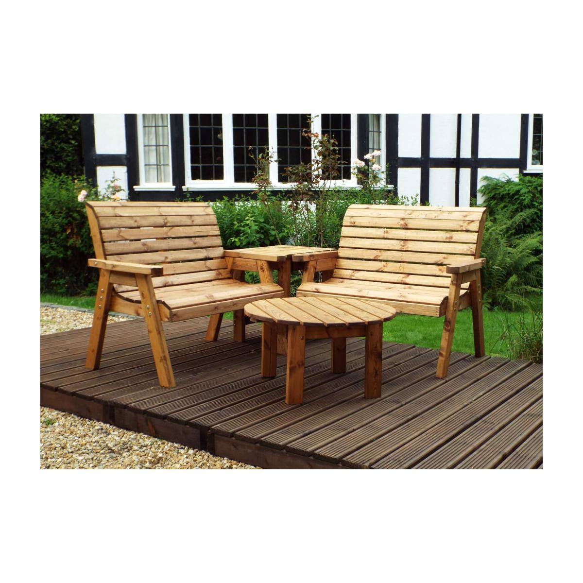 Charles Taylor 4 Seat Solid Wood Outdoor Corner Unit Bench Set (2x Two Seat Benches and Corner Companion Table) and Round Coffee Table. A beautiful and versitle addition to an outdoor space. Constructed at our factory in the UK and manufactured from Scandinavian Redwood. As the name implies, this timber grows in a cold climate. The slow growth associated with the low temperature produces a much denser, more robust wood which is perfect for outdoor Residential or Commercial Use i.e. Pubs, Parks, Care Homes, Schools etc.