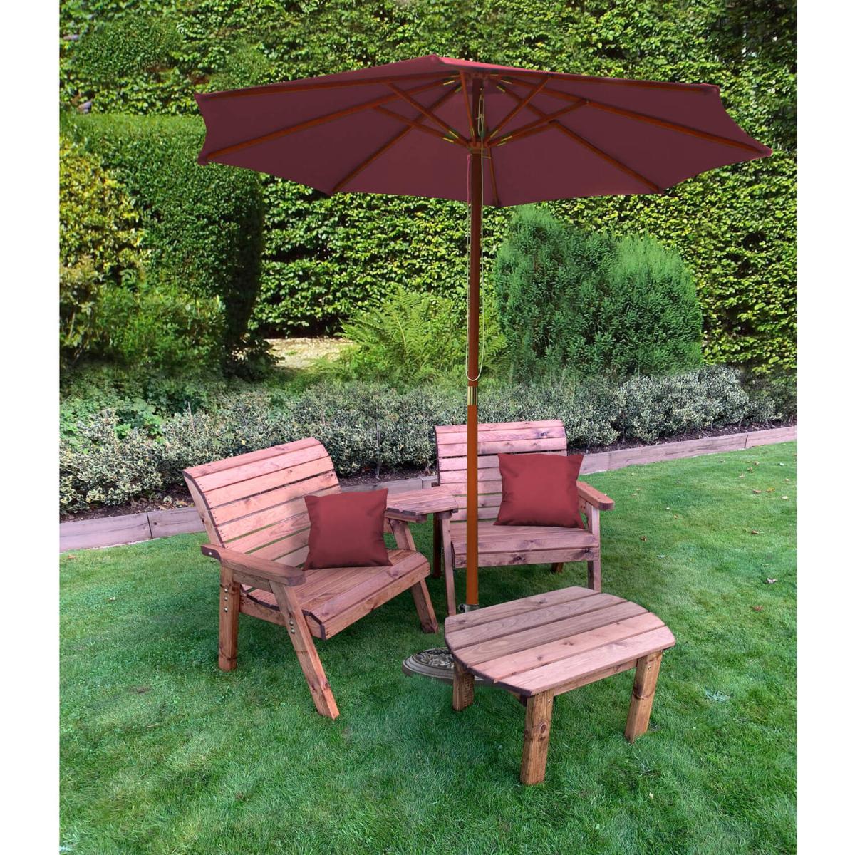 Charles Taylor Solid Wood Outdoor Grand Companion Set (2x Extra Wide Armchairs Connected with a Detachable Angled Centre Tray) with a Coffee Table, Scatter cushions, Parasol and Parasol Base. Perfect for a patio or decking area in the garden for a cup of tea and slice of cake with a friend or partner. Constructed and hand-finished at our factory in the UK and manufactured from Scandinavian Redwood. This timber grows in a cold climate and the slow growth associated with the low temperature produces a much denser, therefore more robust, wood which is perfect for outdoor Residential or Commercial Use i.e. Pubs, Parks, Care Homes, Schools etc.