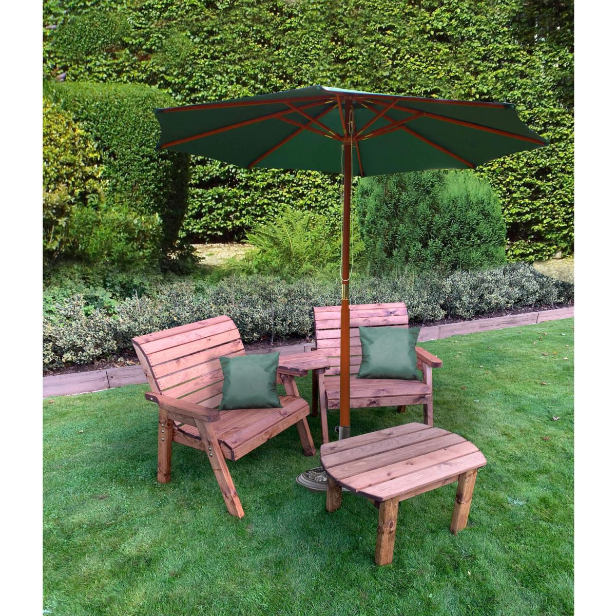 Charles Taylor Solid Wood Outdoor Grand Companion Set (2x Extra Wide Armchairs Connected with a Detachable Angled Centre Tray) with a Coffee Table, Scatter cushions, Parasol and Parasol Base. Perfect for a patio or decking area in the garden for a cup of tea and slice of cake with a friend or partner. Constructed and hand-finished at our factory in the UK and manufactured from Scandinavian Redwood. This timber grows in a cold climate and the slow growth associated with the low temperature produces a much denser, therefore more robust, wood which is perfect for outdoor Residential or Commercial Use i.e. Pubs, Parks, Care Homes, Schools etc.
