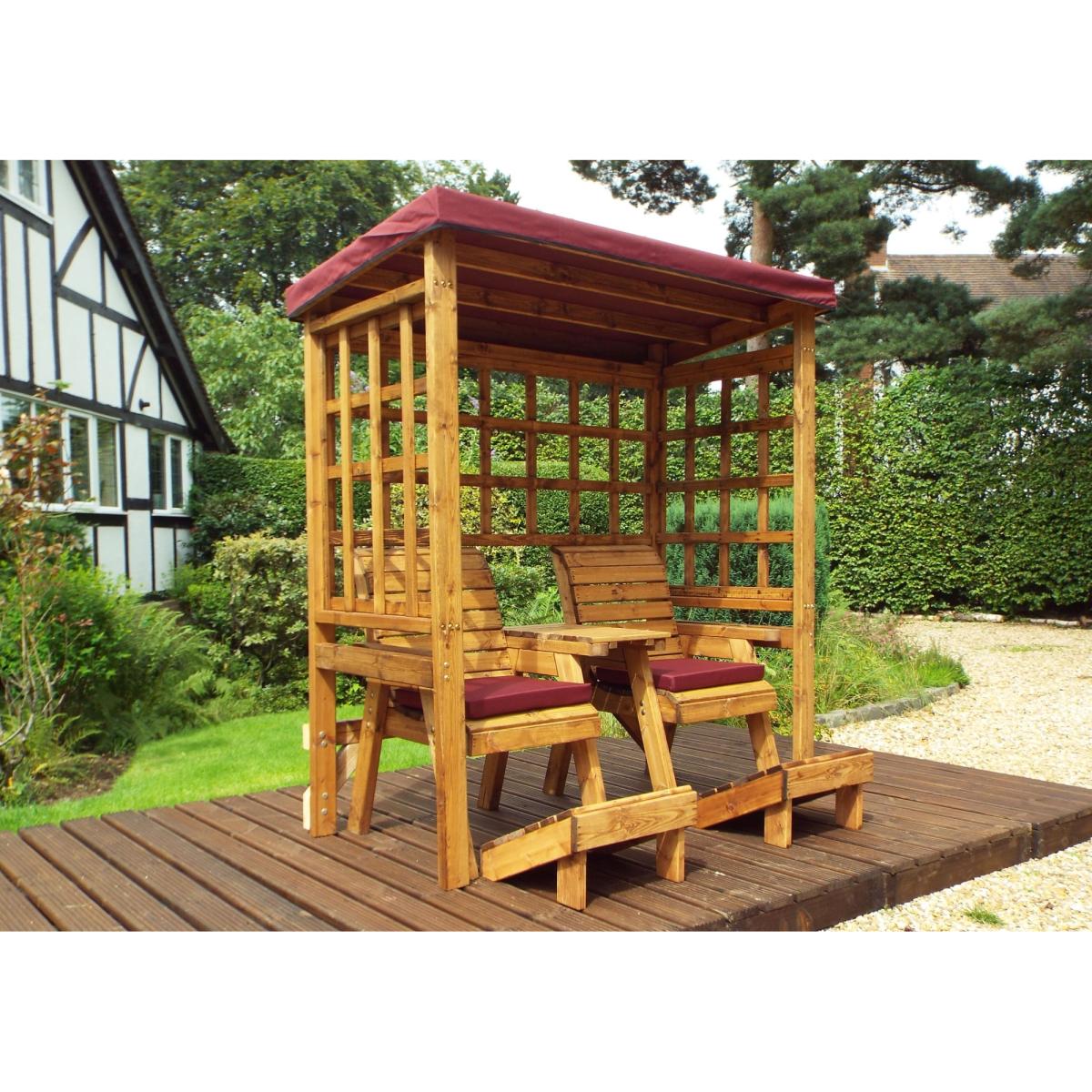 Please note, the Footstools and planters are for illustration purposes only, to show how the swing can be extended. These are not included in this price. This Charles Taylor Henley Twin Arbour is perfect for a growing family to relax and enjoy the warmer months, a ideal feature to add next to your garden pond or overlooking your flower beds and provides extra seating for when guests come over for a BBQ. Crafted from sturdy Scandinavian Redwood dipped in oil-based preservative with rustproof zinc bolts, this bench perfectly combines style and practicality. ;Enjoy this bench as soon as it arrives thanks to the assembly service from Charles Taylor's professional delivery team. Set Includes: 1 x Henley Twin Arbour 2 x Chair Cushion (Green, Grey or Burgundy) Features: Versatile removable seating Detachable Waterproof roof Complete with joining table Classic English design 10 year rot free guarantee Treated with an oil based water repellent preservative All materials FSC-Sourced Specifications: Dimensions: D 1720mm x W 810mm x H1930mm Weight: 72kg Weight limit per chair: 130kg Seat height off ground: 460mm Internal arm width: 510mm We advise removal of the canvas shade cover during inclement weather to prevent damage due to water pooling. All screens vary in colour reproduction and whilst every effort has been made to display the colour as accurately as possible it is for guidance only.