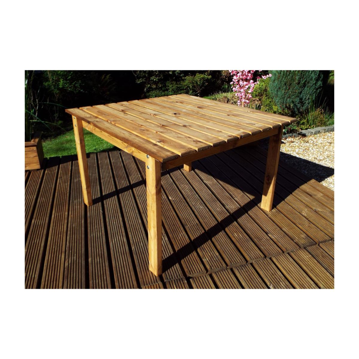 This summer make use of your garden with this high-quality wooden dining table. Crafted from sturdy Scandinavian Redwood dipped in oil-based preservative with rustproof zinc bolts, this dining table perfectly combines style and practicality. Perfect for the family of 4. The spacious garden table offers plenty of room for a family meal in the summer. Traditional Square table complete with ready drilled hole for parasol. Just add chairs from Charles Taylor to complete your bespoke dining preferences.