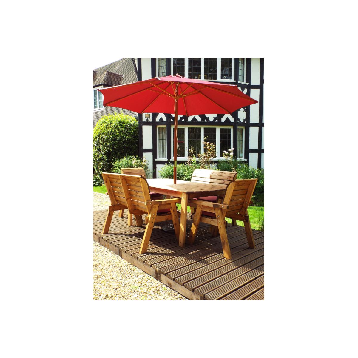 This Charles Taylor six seater rectangular table set is a great addition to your outdoor space for a touch of style and somewhere to relax. This outdoor dining set is constructed from tough and durable approved timber so it's built to last, giving you years of outdoor enjoyment. The set comes complete with seat cushions, a cushion storage bag, a matching 2.7m parasol and a parasol base. Perfect for decking out your garden with everything you need. Available in either a green or burgundy set, the cushions and matching parasol give you a complete and altogether look to compliment your outdoor dcor. With seat cushions providing comfort, the 2.7m parasol giving you shade and the parasol base holding it in place, this set has everything you need for relaxing in your garden.