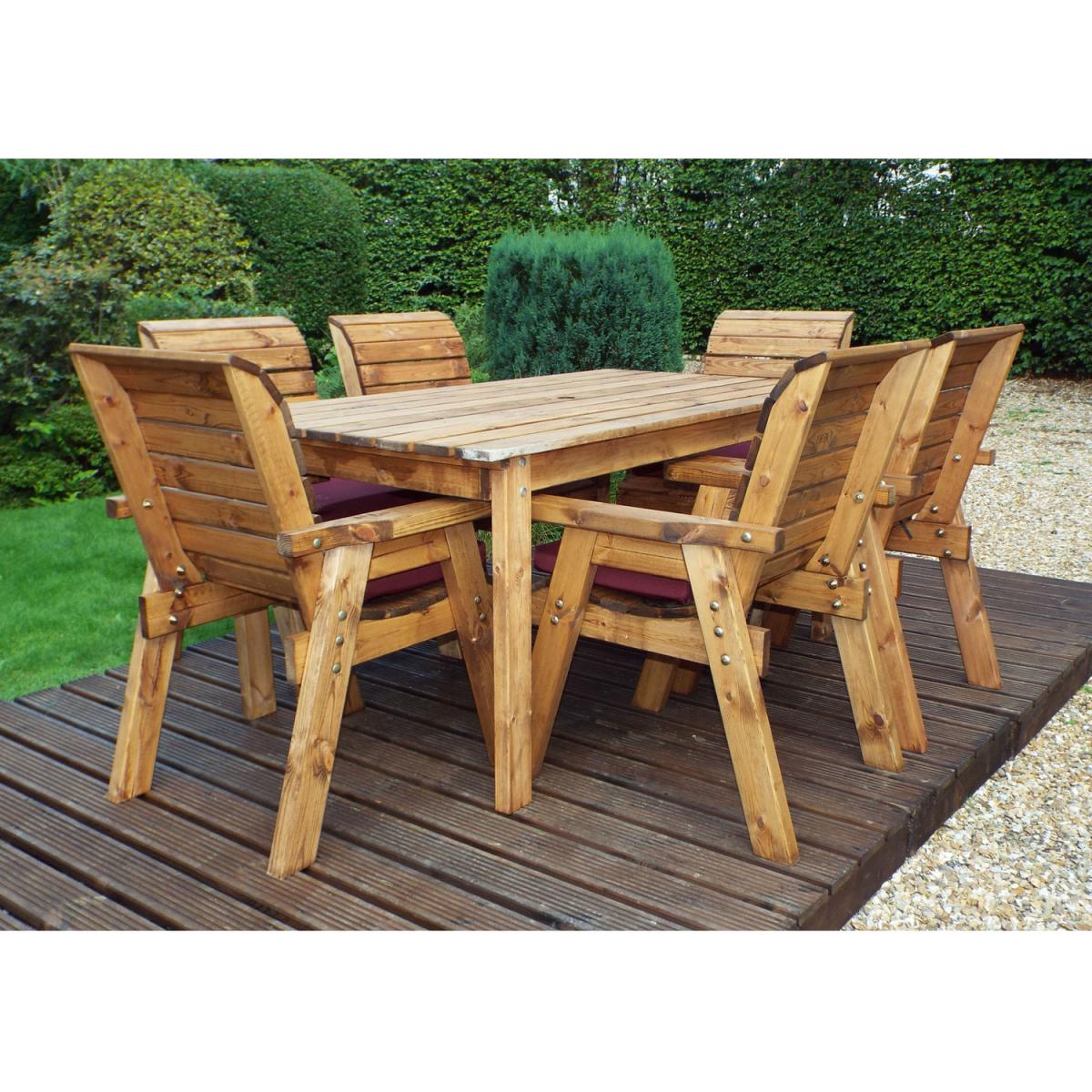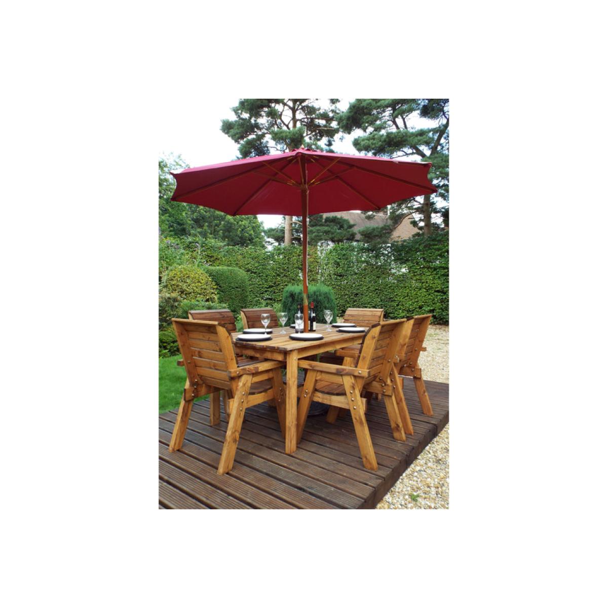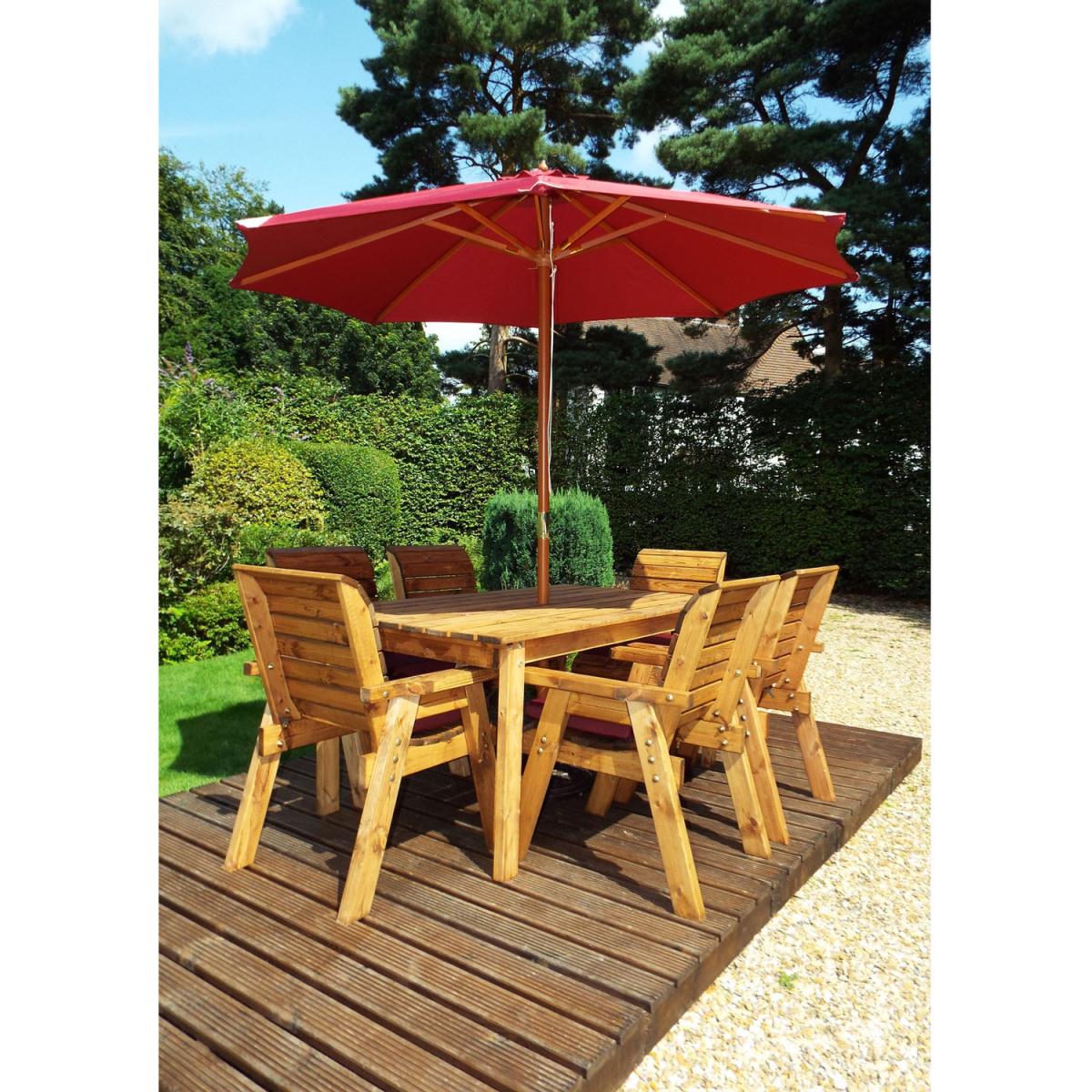 The Six Seater Traditional Table Set from Charles Taylor is a classic outdoor dining table and chairs. This superb outdoor garden furniture set provides 6 x Traditional Chairs, 1 x Traditional Rectangular Table to create a medium-sized outdoor dining area perfect for sunny days. Also included are 6 x seat cushions, parasol and parasol base. The table has a centre hole designed for use with parasols that can provide some needed shade on, particularly hot days. Charles Taylor offers the Garden Parasol in a choice of Green or Burgundy to match the chair cushions and the Parasol Base in a bronze-coloured decorative design. Handcrafted in the UK using quality materials from sustainable sources, this outdoor furniture uses solid Scandinavian Redwood treated with a weatherproof, oil-based Taylor Brown preservative, and high quality protected fittings to ensure this furniture looks great all year round.