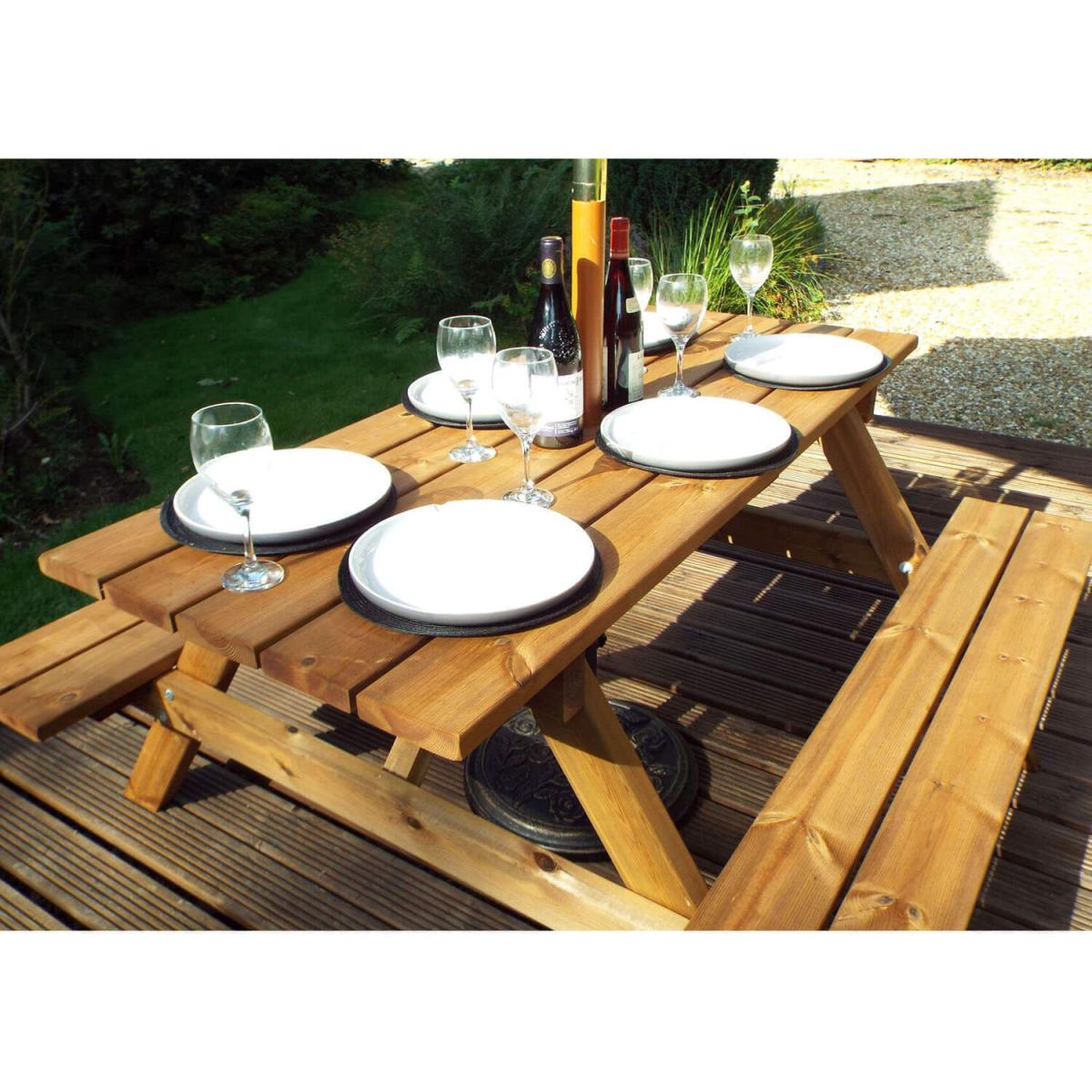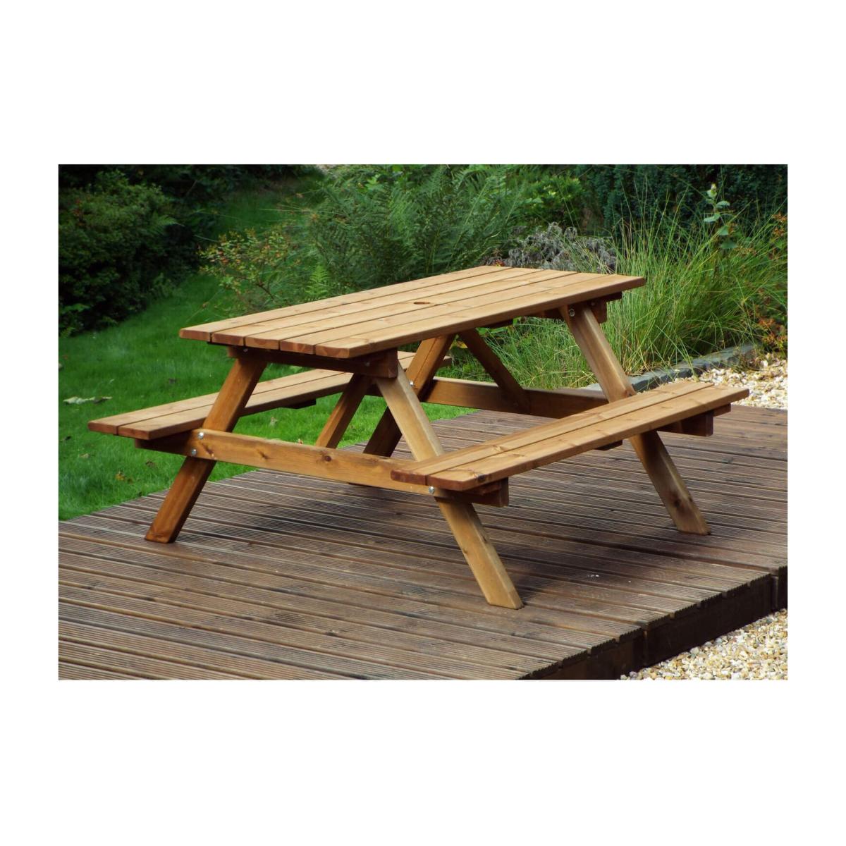Make use of your garden this summer with this large high-quality wooden picnic table with six seats. This listing is for a pallet of 12 units. Crafted from sturdy Scandinavian Redwood dipped in oil-based preservative with rustproof zinc bolts, this dining table perfectly combines style and practicality. Traditional Rectangular table complete with ready drilled hole for parasol. Just add chairs from Charles Taylor to complete your bespoke dining preferences.