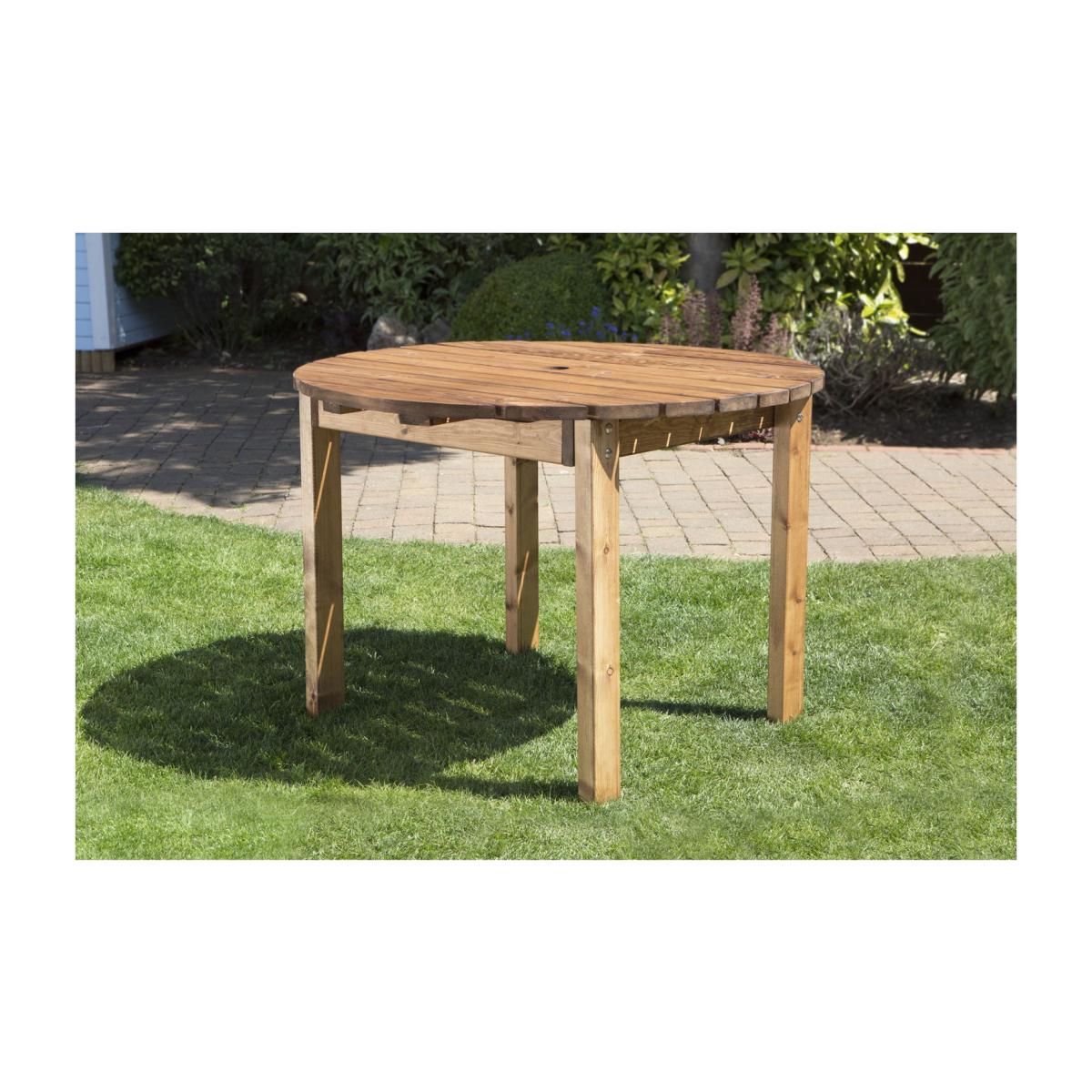 Take advantage of your outdoor space with this high-quality wooden dining table. Crafted from sturdy Scandinavian Redwood dipped in oil-based preservative with rustproof zinc bolts, this dining table perfectly combines style and practicality. Traditional Circular table complete with ready drilled hole for parasol. Just add chairs from Charles Taylor to complete your bespoke dining preferences. No assembly is required as this piece is fully assembled and will be ready for you to enjoy straight away.