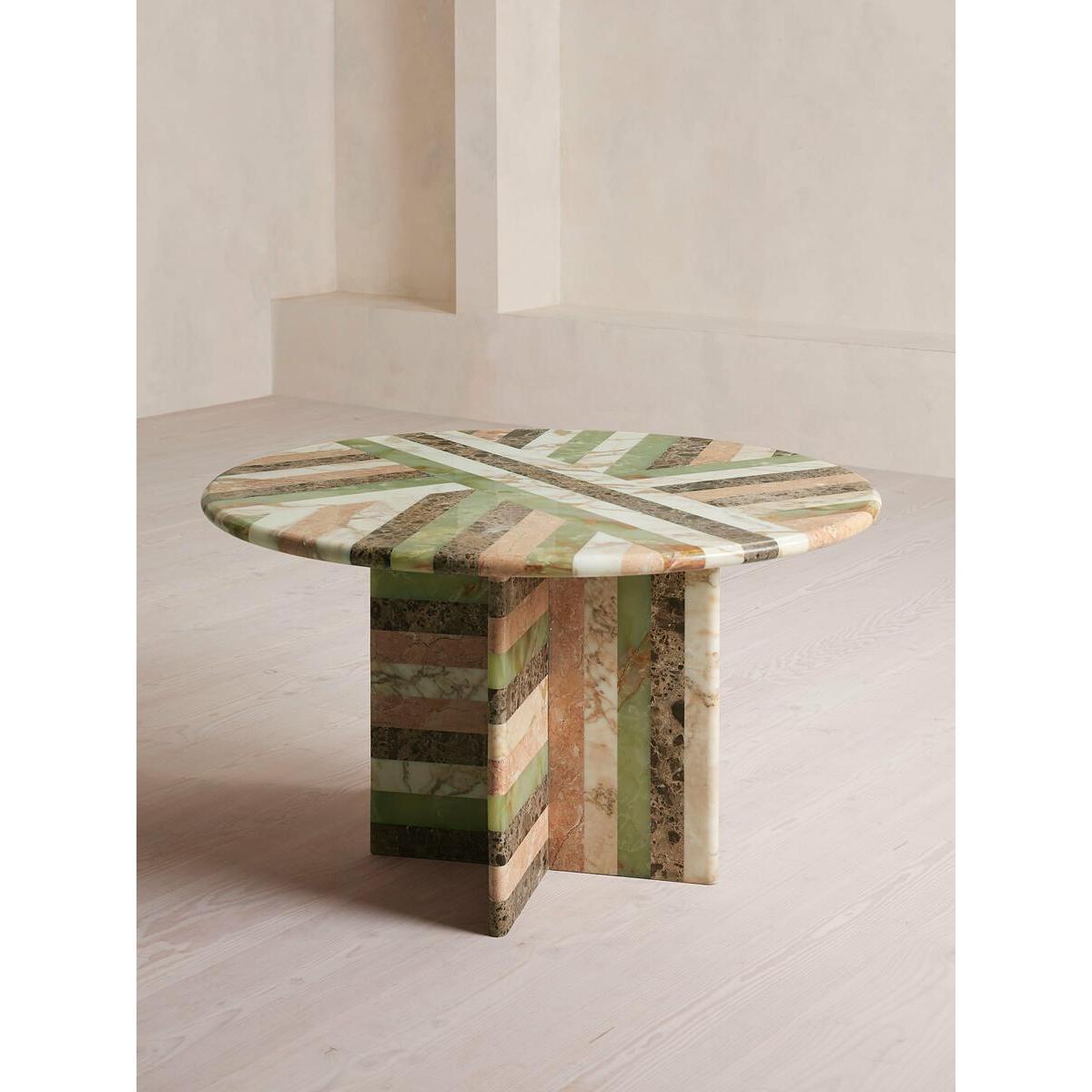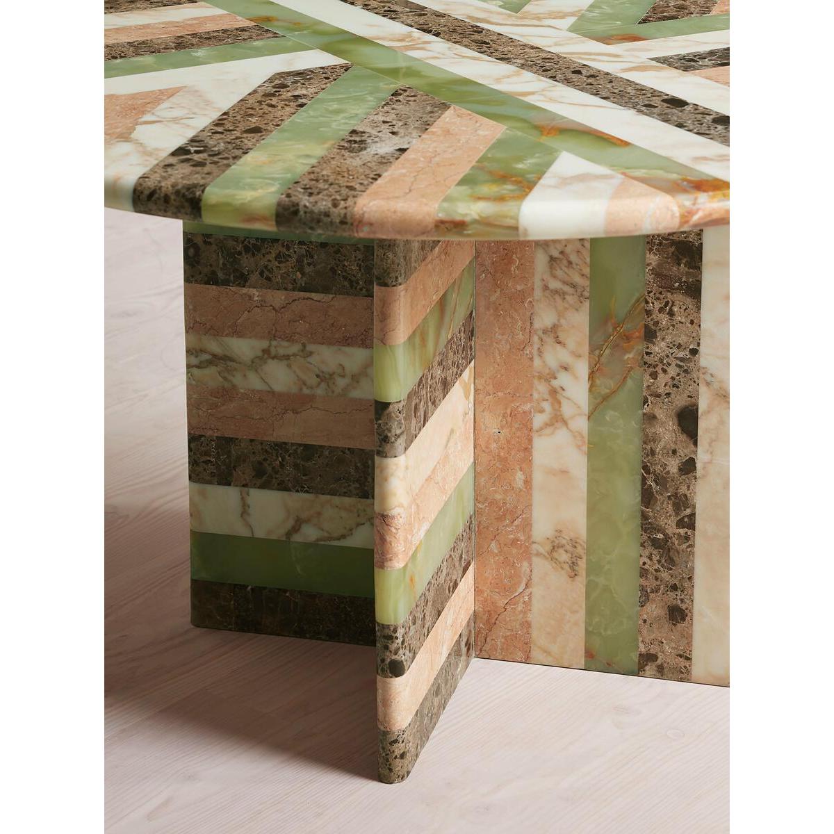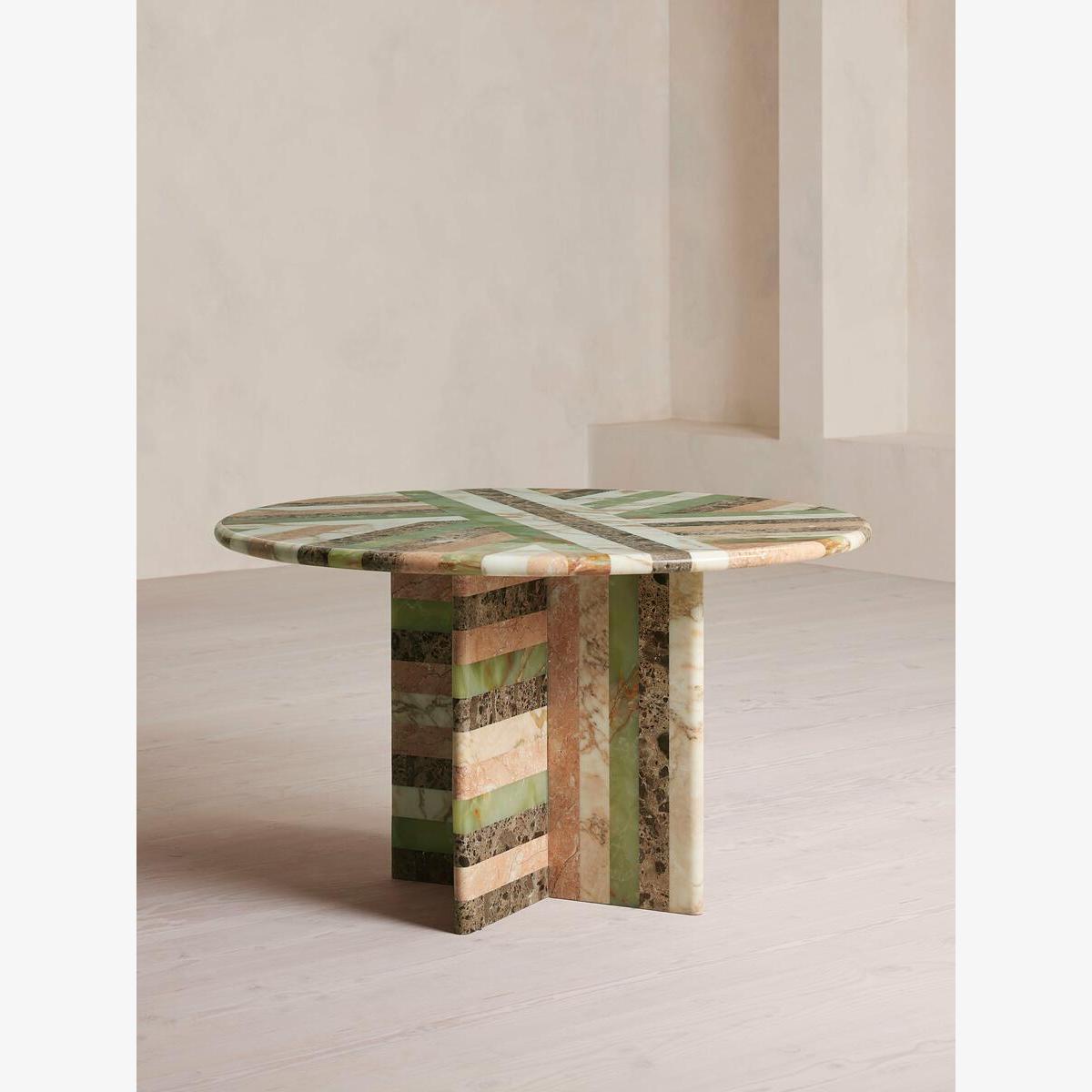 Our Charli dining table is a gallery-style piece in its own right. Echoing the vibrant mix of marbles and terrazzo finishes in Soho House Rome, this statement design is distinguished by four marbles that beautifully complement one another, while matching the rich colours of the House's interiors. A polished Dark Emperador marble sourced from Spain is met with green onyx in pale and light tones with veins of dark orange, rose gold and terracotta bringing depth to this stone. This is contrasted with Rosa Tea, a marble sourced from the Philippines in a salmon-pink hue, alongside Gold Carrara marble. Arranged in both linear and diagonal formations, this table is a striking way of showcasing marble in the home, and when not in use it draws the eye to the centre of the room. Statement marble dining table Polished Dark Emperador marble sourced from Spain Rosa Tea marble sourced from the Philippines Green onyx stone sourced from Pakistan Linear and diagonal formation Seats four to six people Inspired by the marble and terrazzo finishes in Soho House Rome