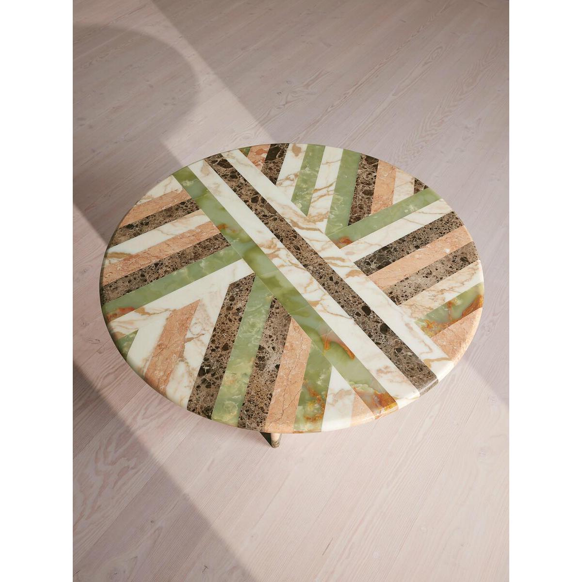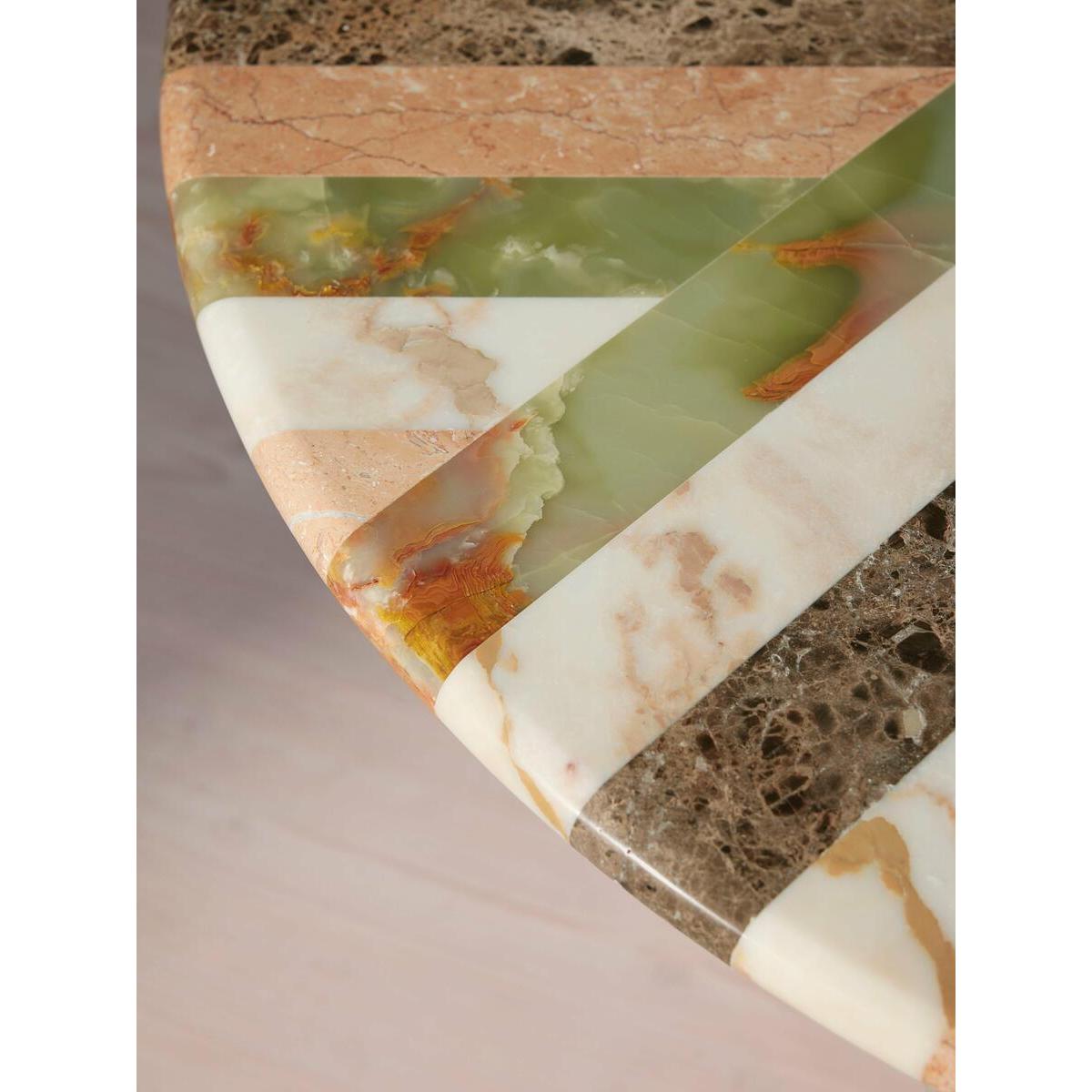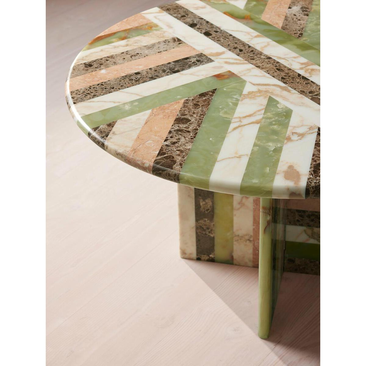 Our Charli dining table is a gallery-style piece in its own right. Echoing the vibrant mix of marbles and terrazzo finishes in Soho House Rome, this statement design is distinguished by four marbles that beautifully complement one another, while matching the rich colours of the House's interiors. A polished Dark Emperador marble sourced from Spain is met with green onyx in pale and light tones with veins of dark orange, rose gold and terracotta bringing depth to this stone. This is contrasted with Rosa Tea, a marble sourced from the Philippines in a salmon-pink hue, alongside Gold Carrara marble. Arranged in both linear and diagonal formations, this table is a striking way of showcasing marble in the home, and when not in use it draws the eye to the centre of the room. Statement marble dining table Polished Dark Emperador marble sourced from Spain Rosa Tea marble sourced from the Philippines Green onyx stone sourced from Pakistan Linear and diagonal formation Seats four to six people Inspired by the marble and terrazzo finishes in Soho House Rome