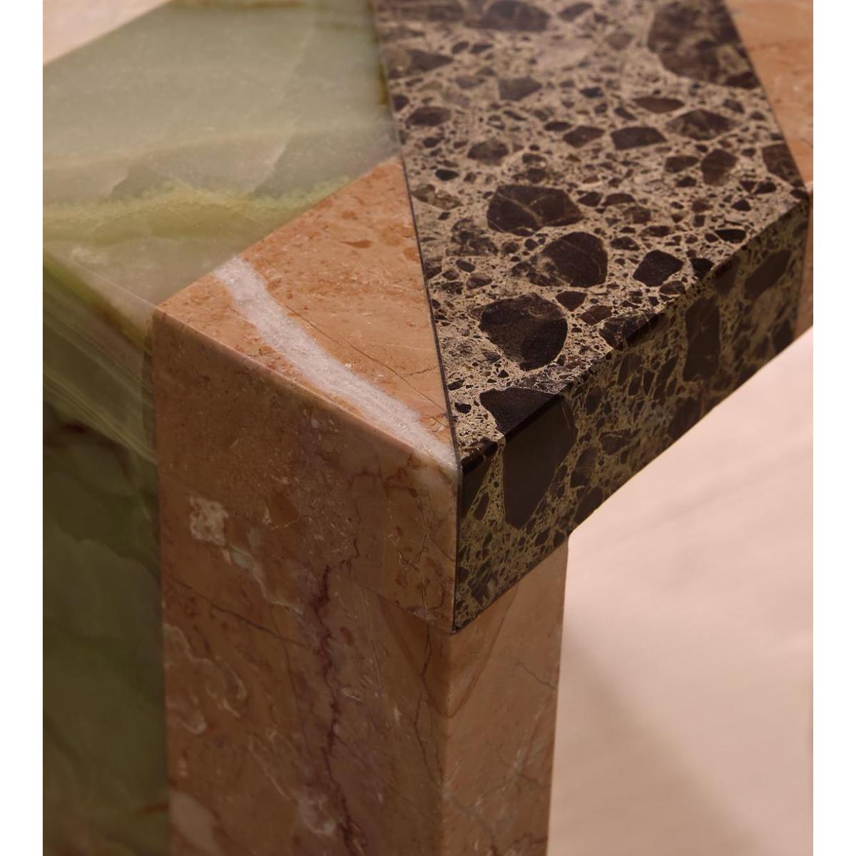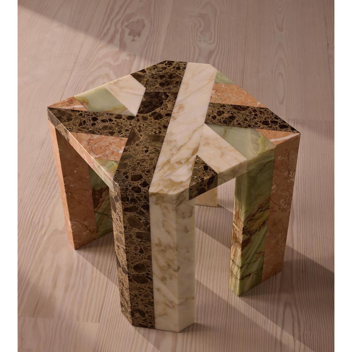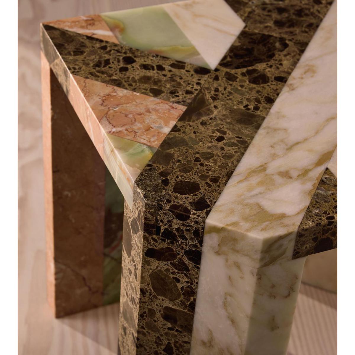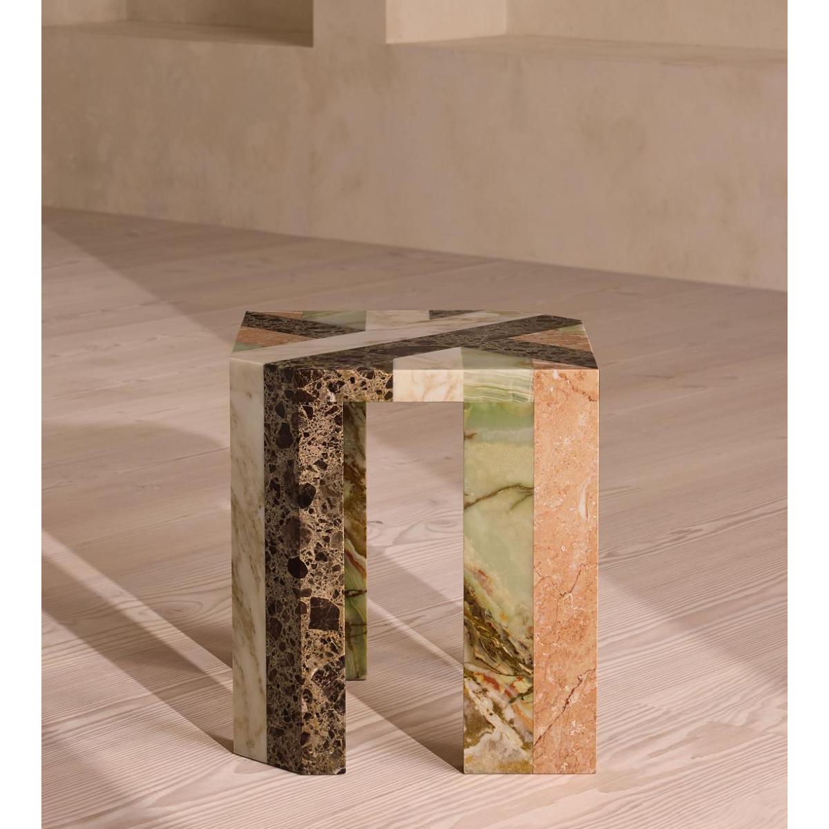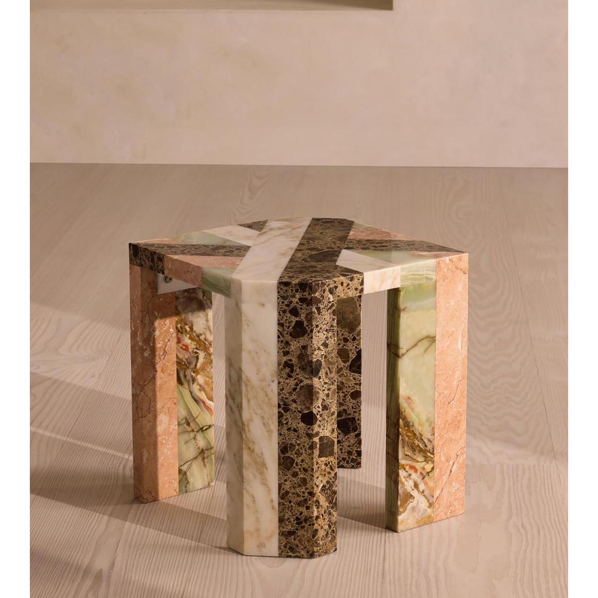 Brightly coloured, contrasting stones are pieced together to create an irregular silhouette. Inspired by the various marble finishes seen throughout Soho House Rome, the Charli side table is crafted from a mix of polished green onyx stone, and Golden Carrara, Dark Emperador, and Rosa Tea marbles.