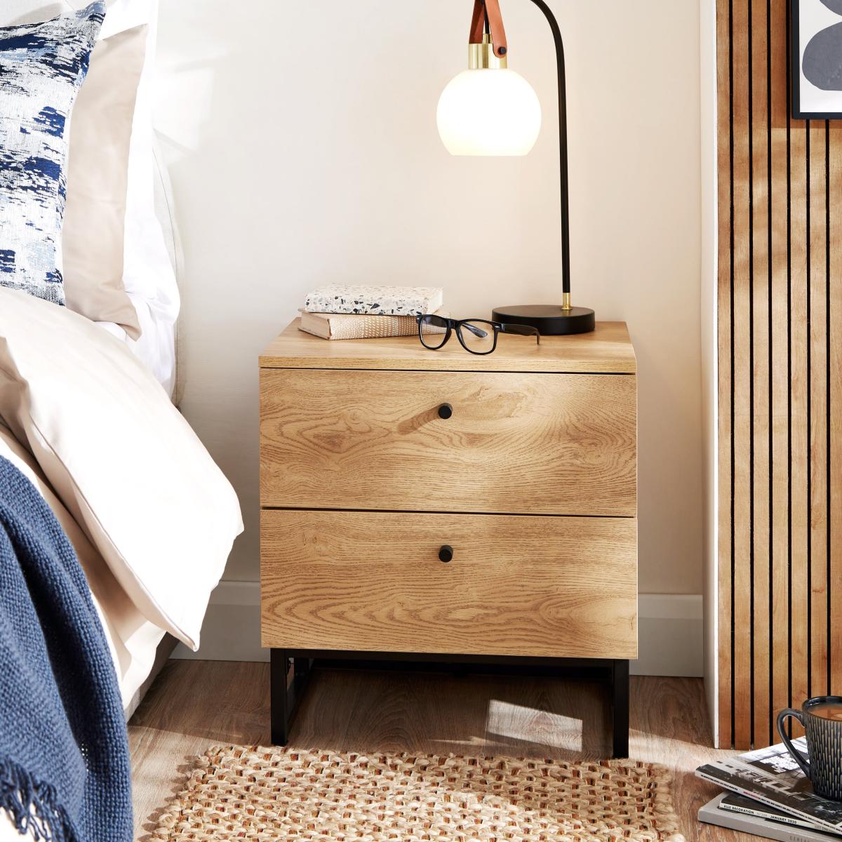 I love this bedside table for its clean, minimalist design and warm oak effect that adds a touch of natural sophistication to any bedroom. It works particularly well in Scandi or modern interiors, where its simple lines and neutral tone can complement both neutral palettes and more vibrant colour schemes. Practical styling tips include layering a few favourite books or a decorative tray on top, and using the drawers to keep essentials like chargers or reading glasses tucked away. Its versatile look allows it to blend seamlessly with various furniture styles, making it a reliable choice for adding function and understated style to your space.