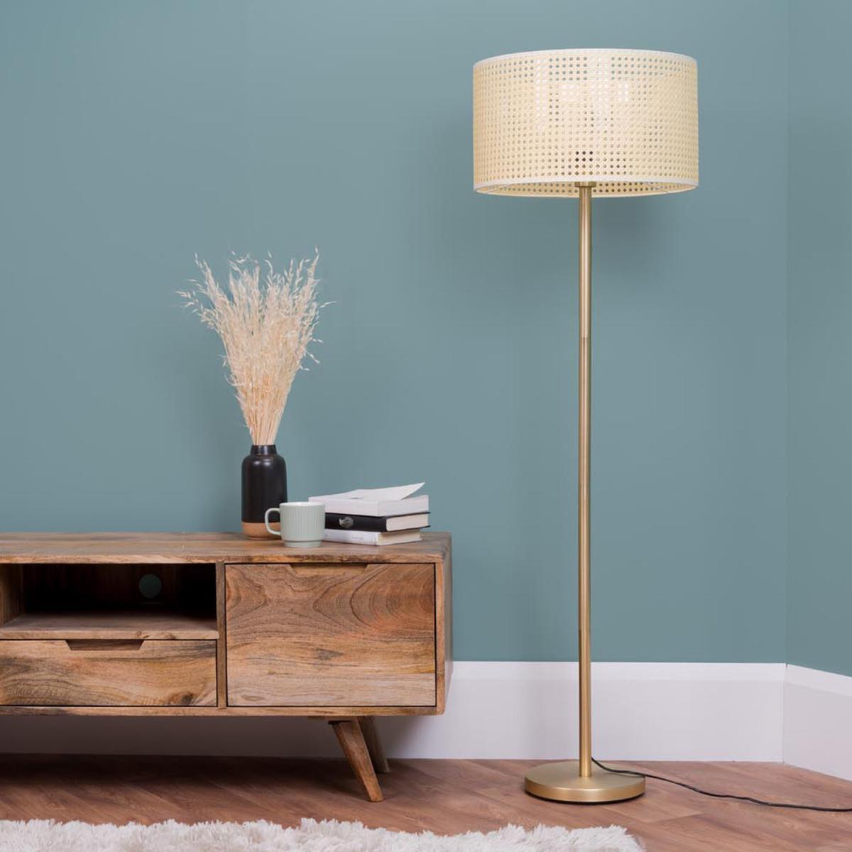 I love this floor lamp for its versatile blend of modern elegance and natural texture. The gold finish lends a touch of sophistication, making it a great statement piece in both contemporary and eclectic interiors. The wicker drum shade introduces warmth and a subtle coastal or boho vibe, so it works particularly well in living rooms, bedrooms, or even cosy reading nooks. For styling tips, pair it with soft textiles and neutral tones to let the warm brass and natural wicker shine, or mix with other metallic accents for a layered look. It's also practical to position near seating areas or by a sofa to add both ambient light and visual interest.