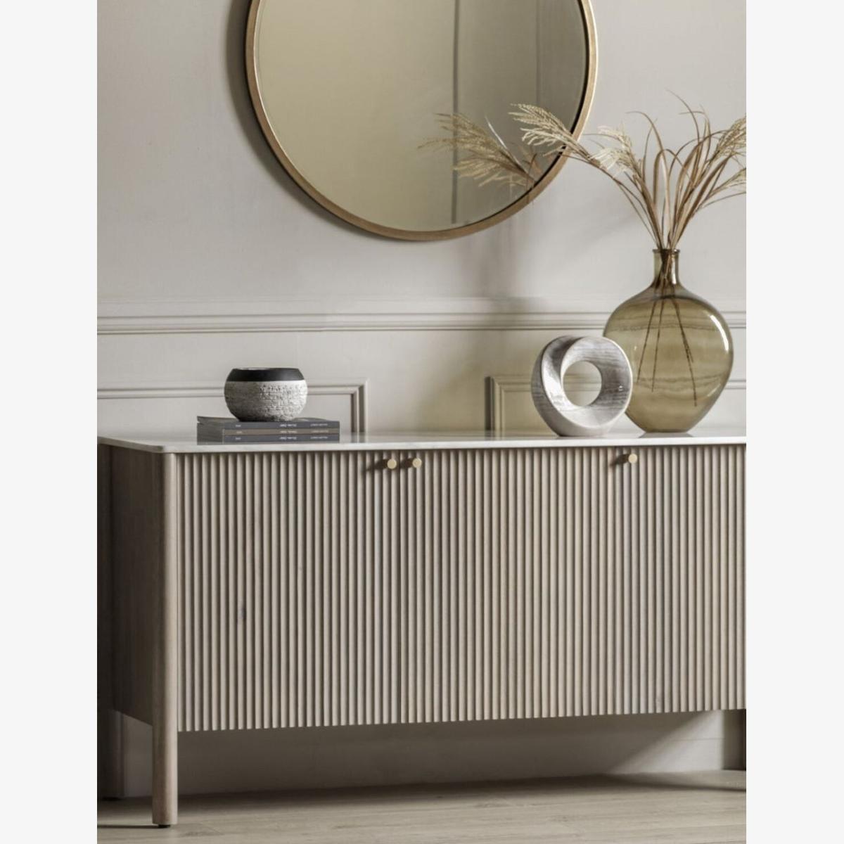 Offering a modern classic look, this stunning sideboard exudes timeless quality and beauty, whilst offering a practical storage solution. It is crafted from solid mango wood, with a striking vertical ribbed feature on the doors, and a polished Indian white Carrera marble top with classic grey/blue veins running through it. Matching pieces available. Offering a modern classic look, this stunning sideboard exudes timeless quality and beauty.
