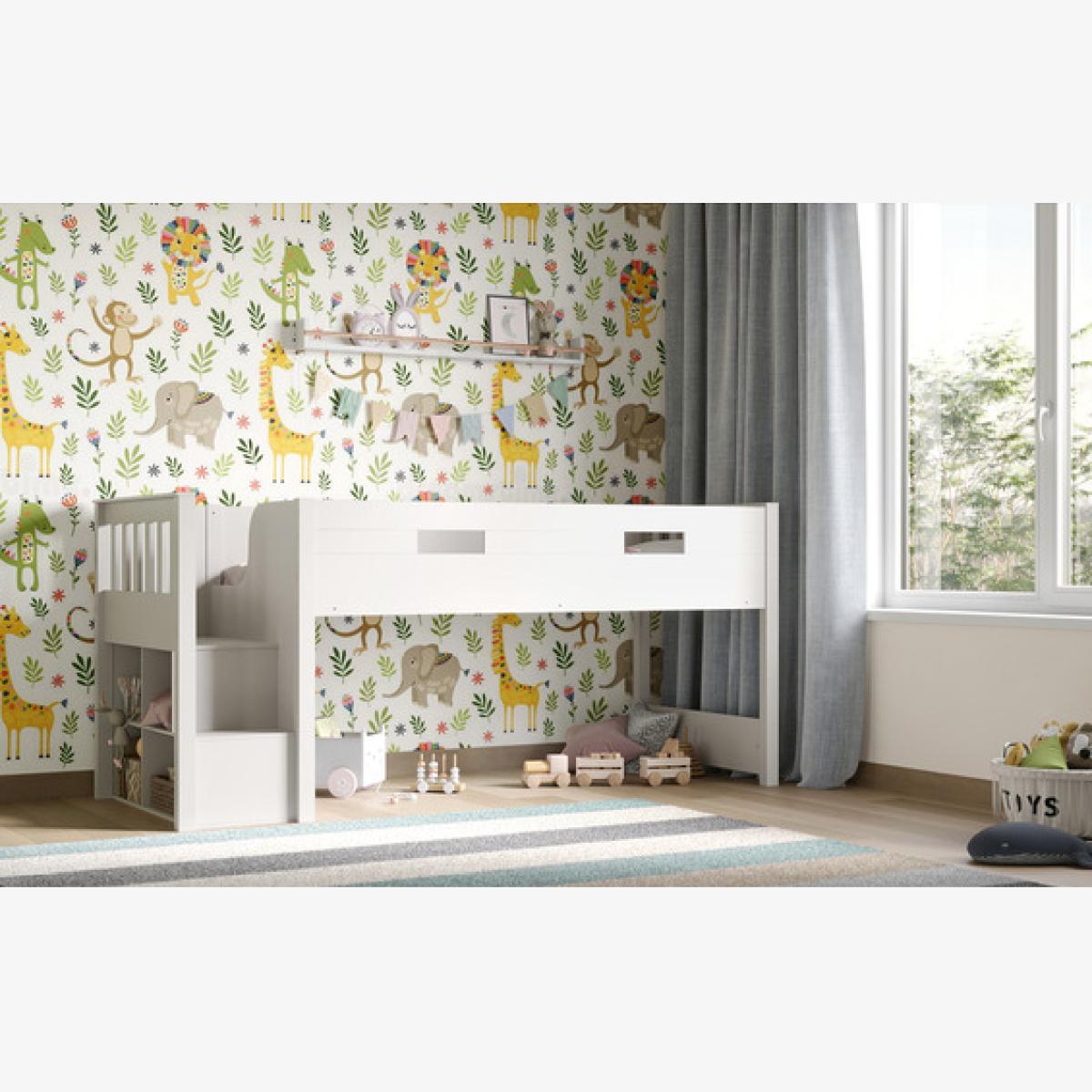 Introducing the Charlie mid sleeper from Flair Furnishings. This stunning mid sleeper has been carefully designed and created to meet both the needs of parents and children alike. Safety is the main priority with this bed frame, the staircase has been carefully designed with this in mind to ensure easy and safe access to and from the sleeping area. The wide and deep steps allow for greater foot stability whilst adding to the bed frames modern and unique design. Finished in an easy to clean solid white finish.