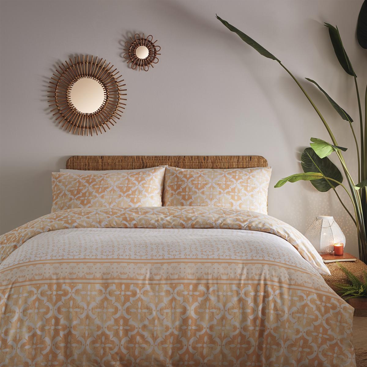Step into the bustling heart of an ancient city infused with the soft peach, intricate patterns, and rich textures of traditional Moroccan design. The beautiful patterns of this bedding set has taken inspiration from the intricate architecture and ancient streets to bring the timeless style to your bedroom. Duvet cover set includes 1 duvet cover 2 Housewife pillowcases. *Please note the single bed set only includes one pillowcase. Duvet cover fastening stainless steel poppers. Material 52 polyester 48 cotton